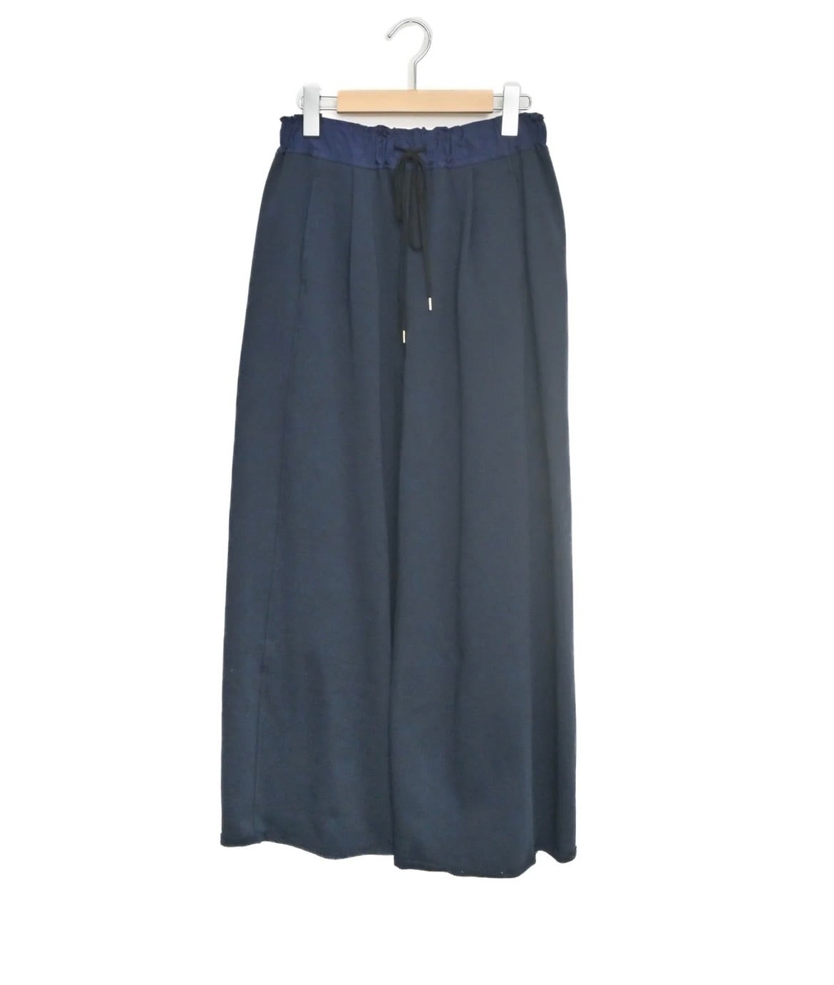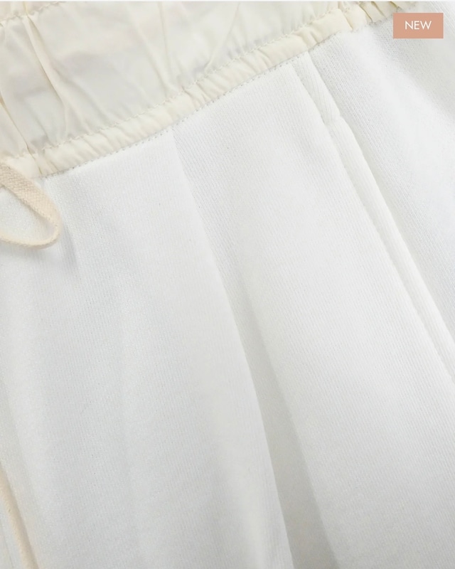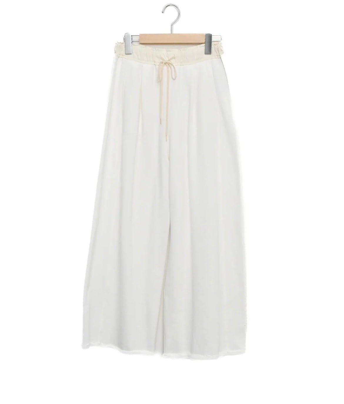 腰まわりをすっきりと仕上げつつ、裾に向かってゆるやかなワイドシルエットがポイント。体のラインを拾いにくく快適ながらスタイルアップ効果も期待できます。ウエストの異素材切替や、断ち切りのデザインで、ラフさをプラスすることで程よい抜け感を演出。