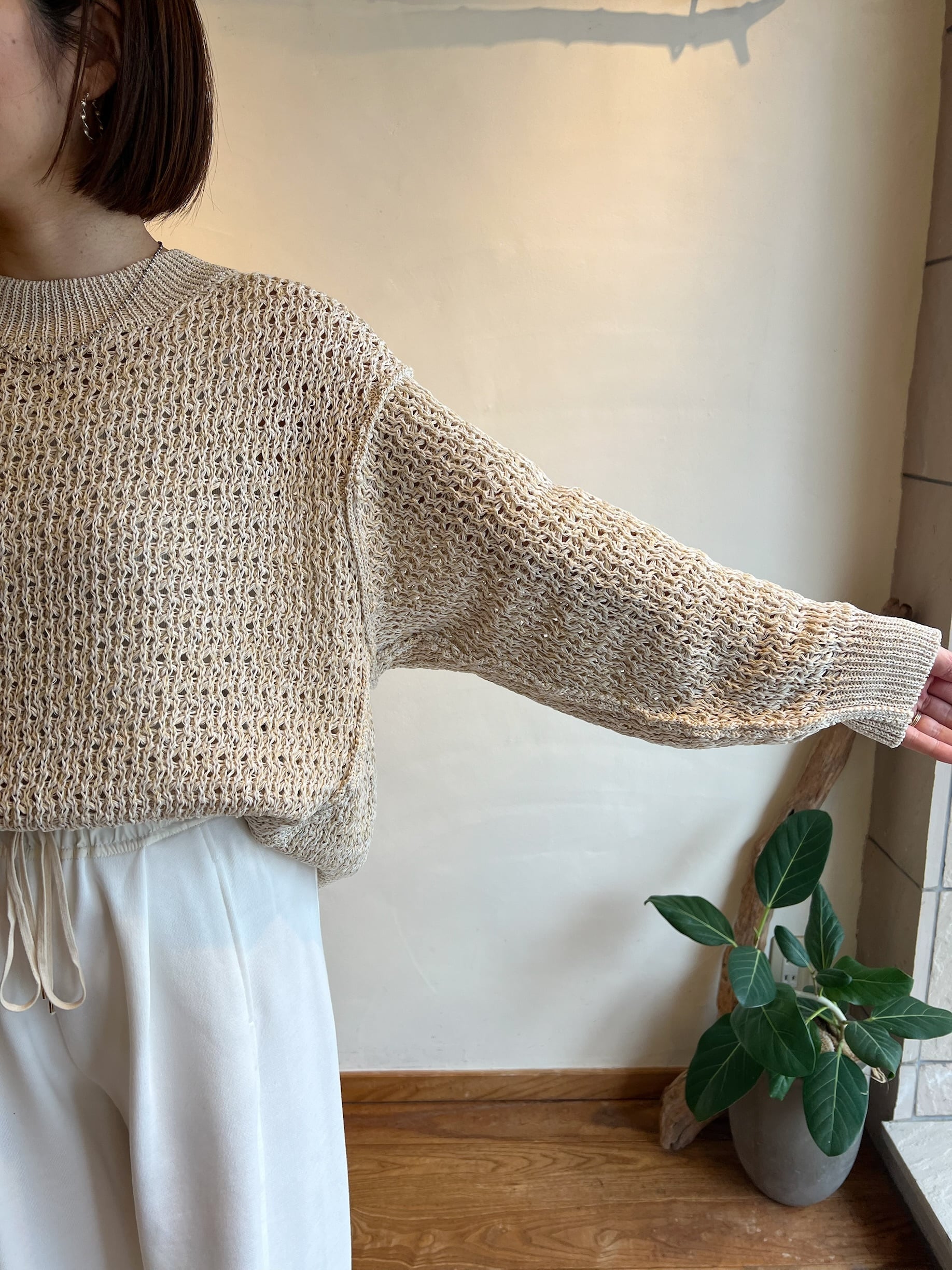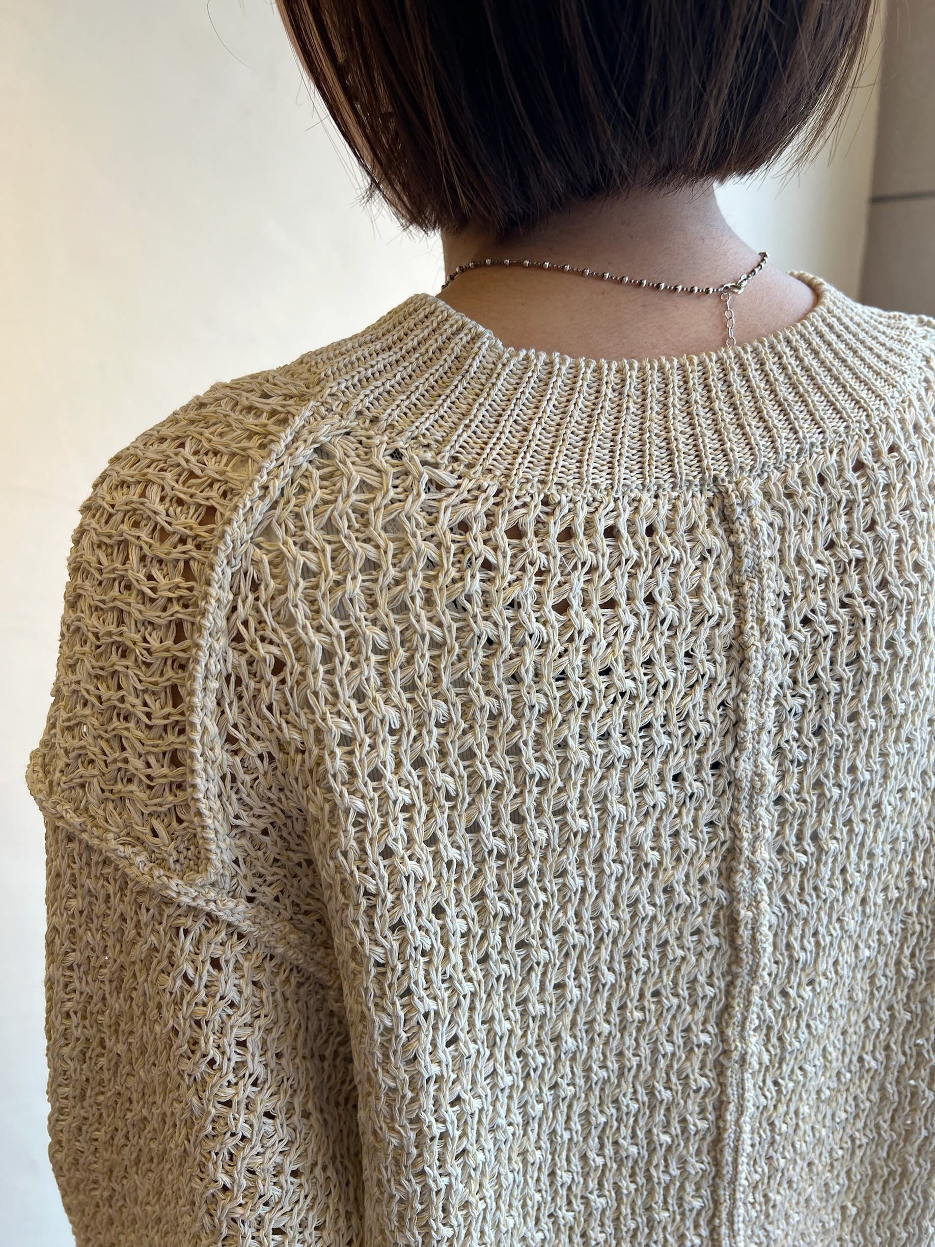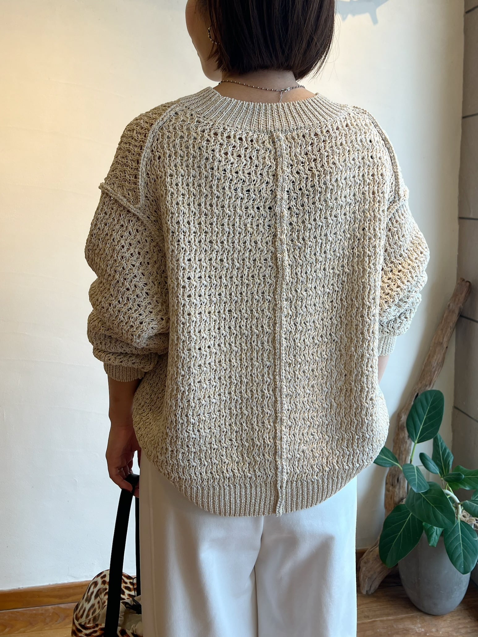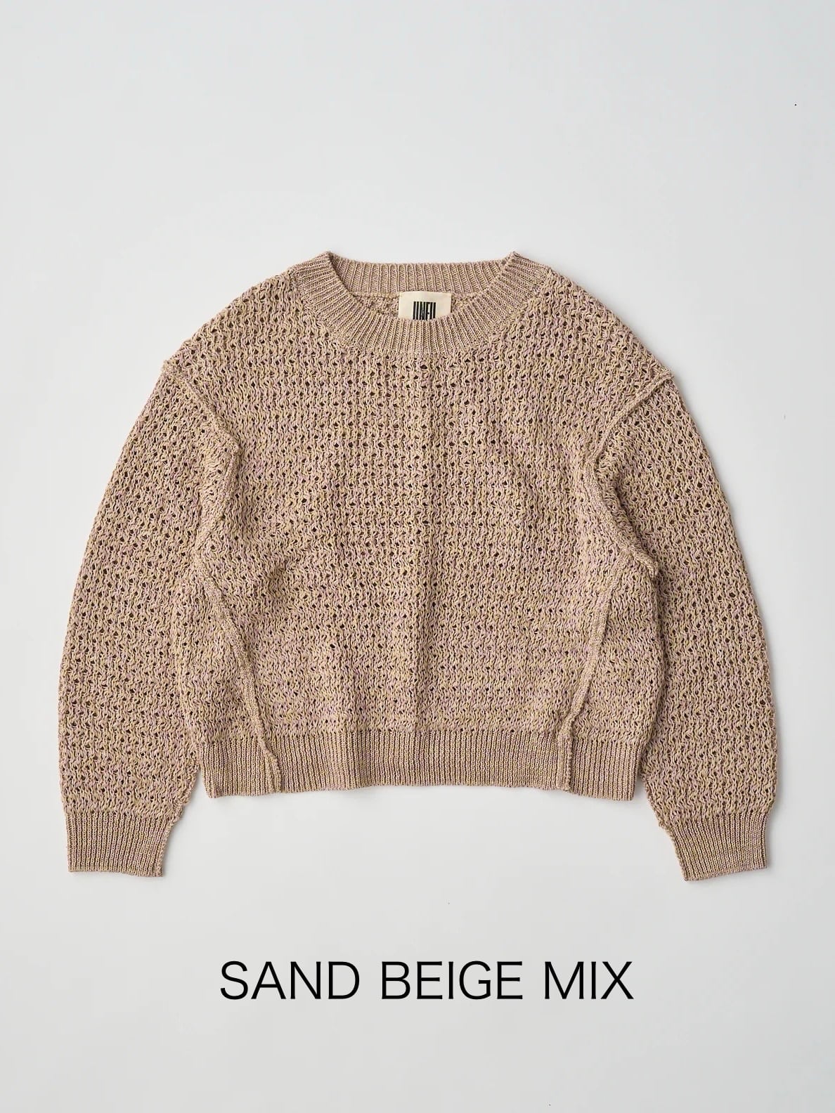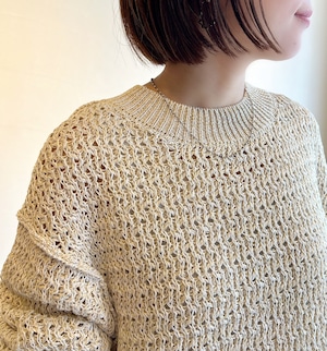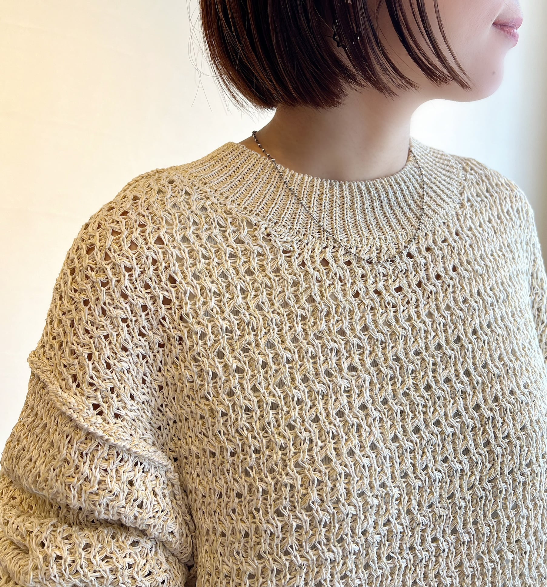 裏と表を違う編み組織で構成されている二重構造になっているニットです。ざっくりとした編み目を表現しながらズルッと伸びないように仕上げる為に考えた編み地になります。特殊な加工で麻のような質感にしているコットンと、シルクの糸を使用し、それぞれ色を変えることで、絶妙なMIXカラーにしています。
