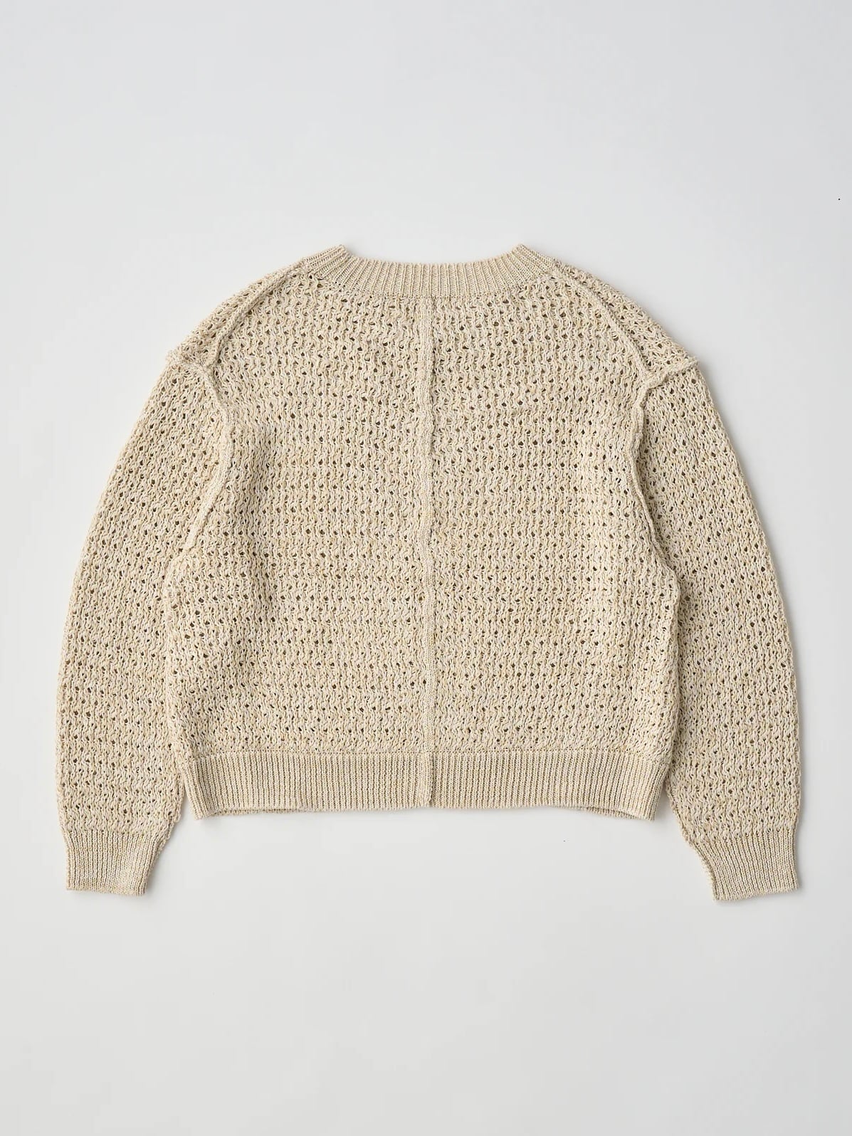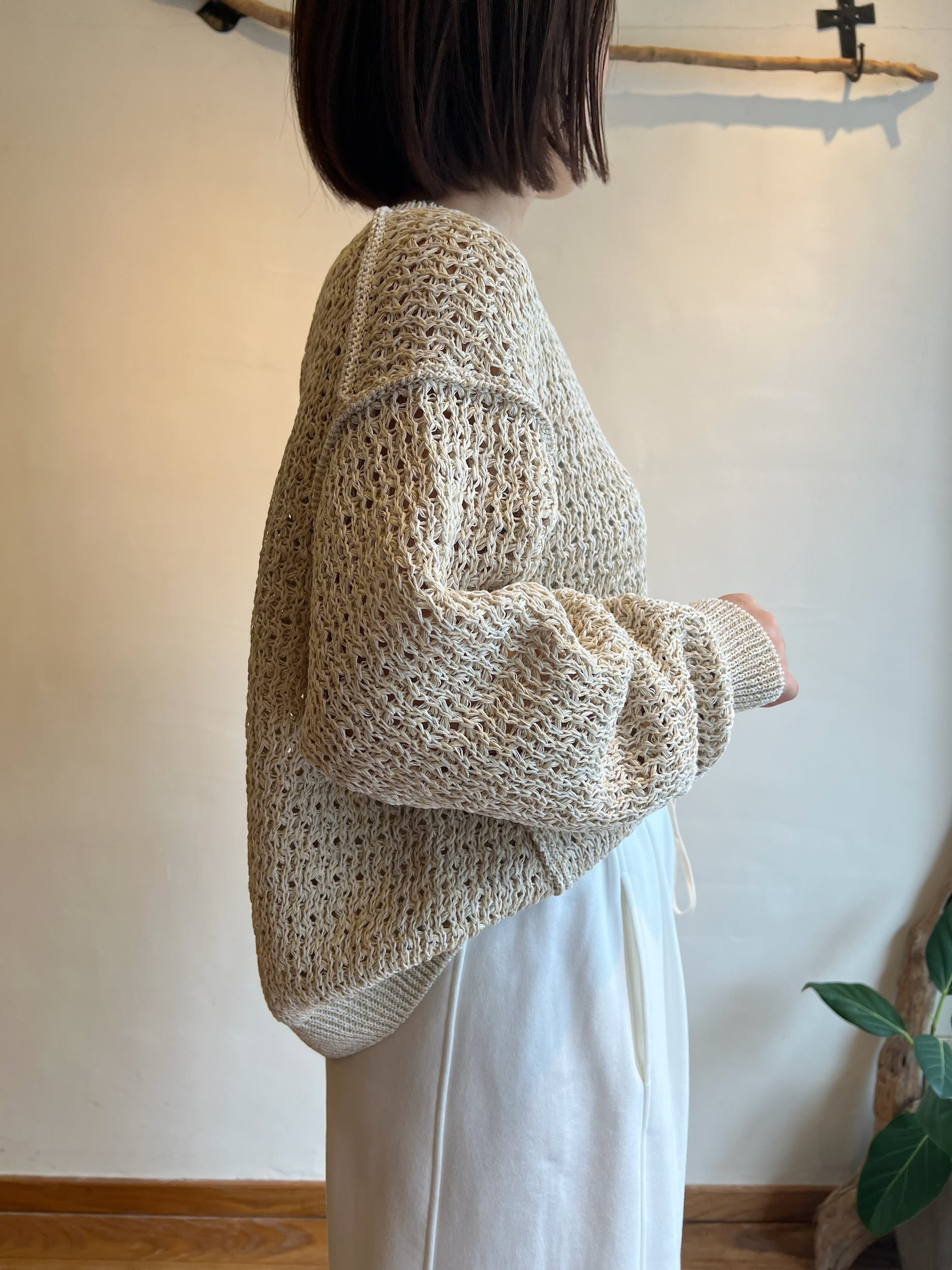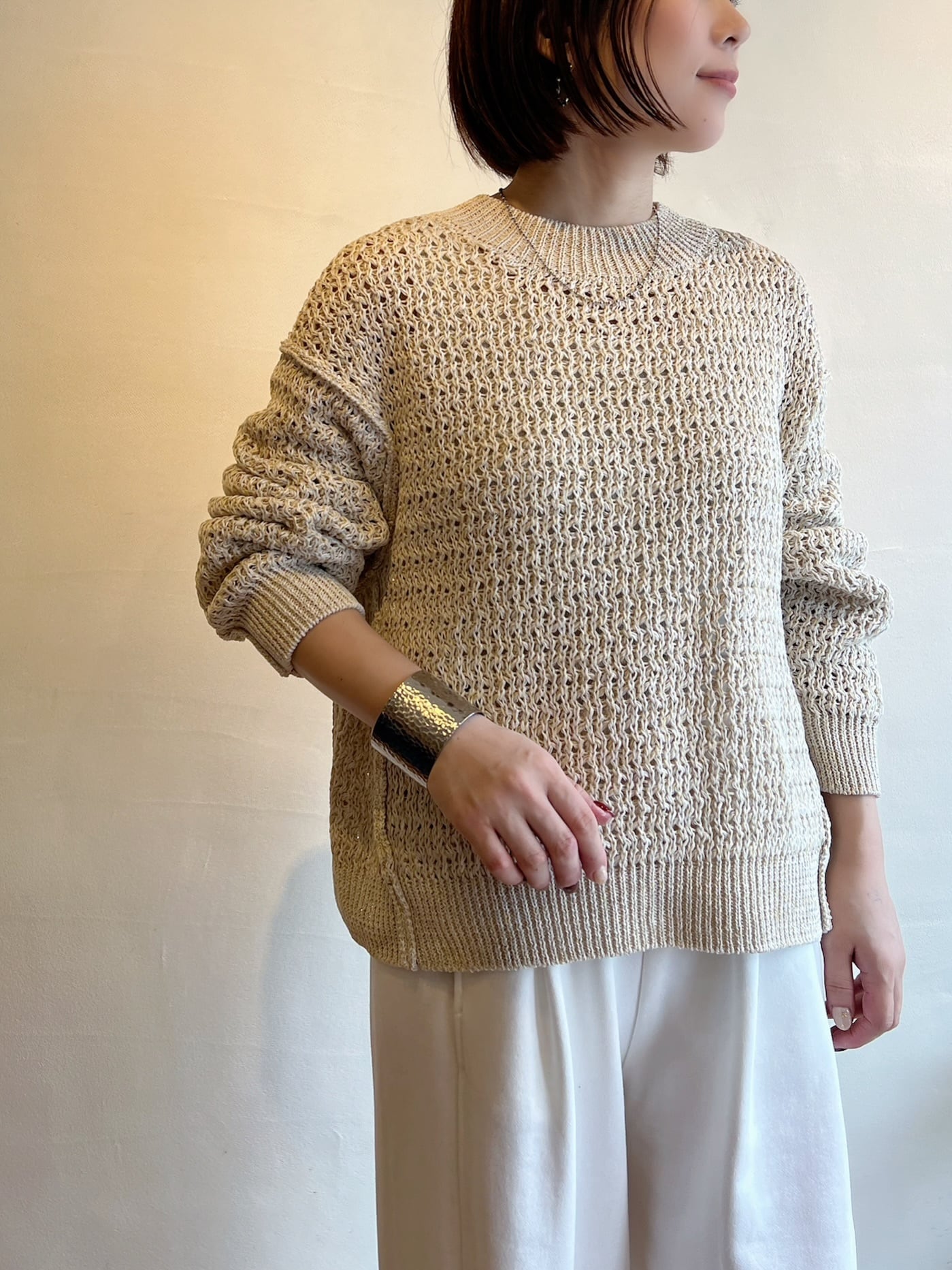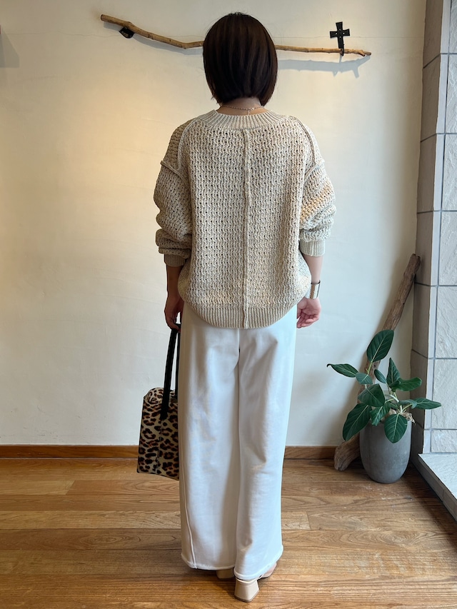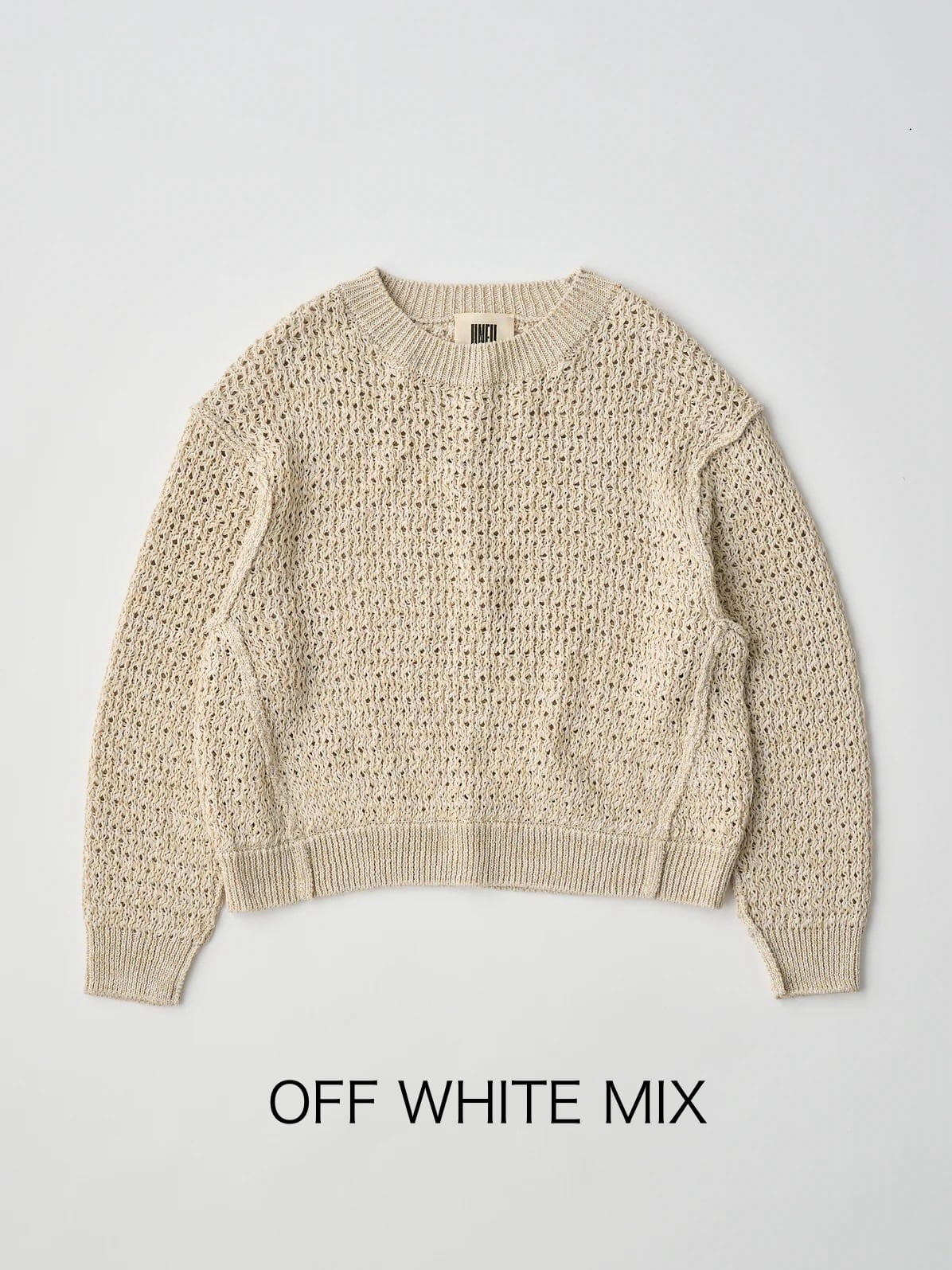 裏と表を違う編み組織で構成されている二重構造になっているニットです。ざっくりとした編み目を表現しながらズルッと伸びないように仕上げる為に考えた編み地になります。特殊な加工で麻のような質感にしているコットンと、シルクの糸を使用し、それぞれ色を変えることで、絶妙なMIXカラーにしています。