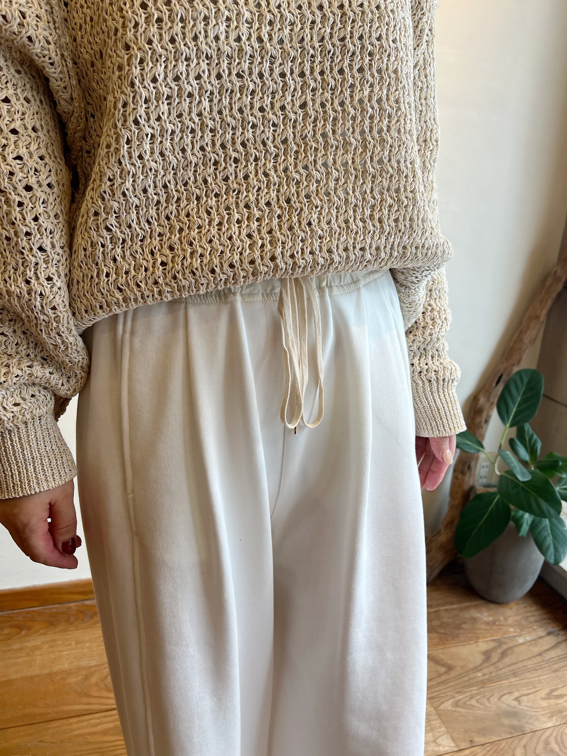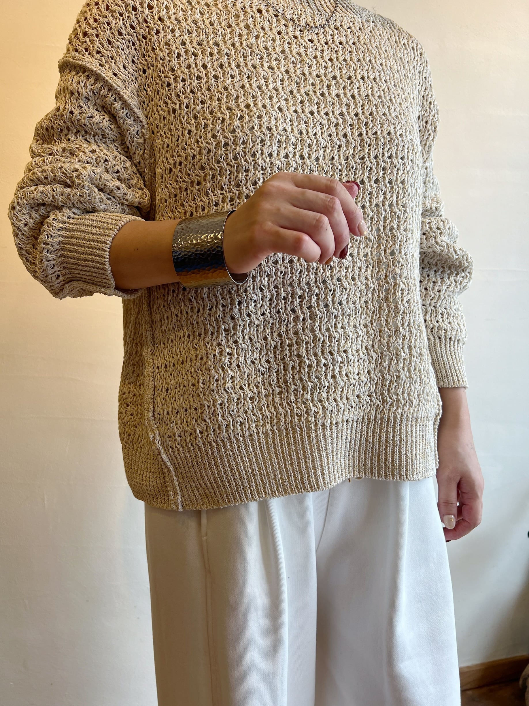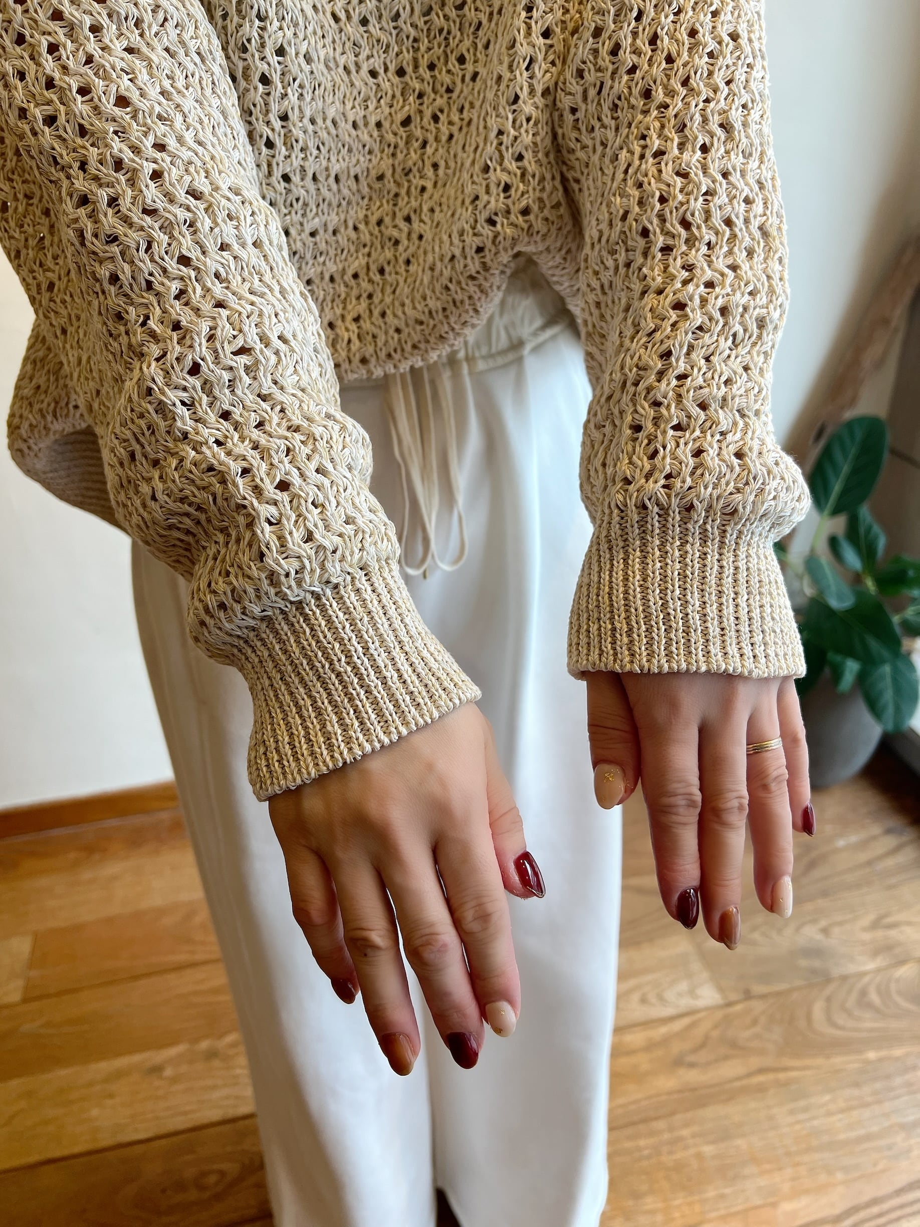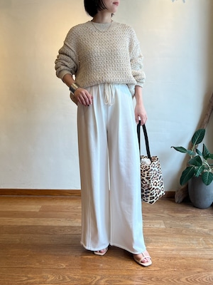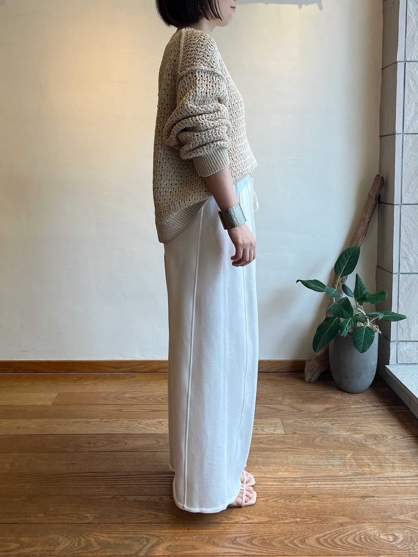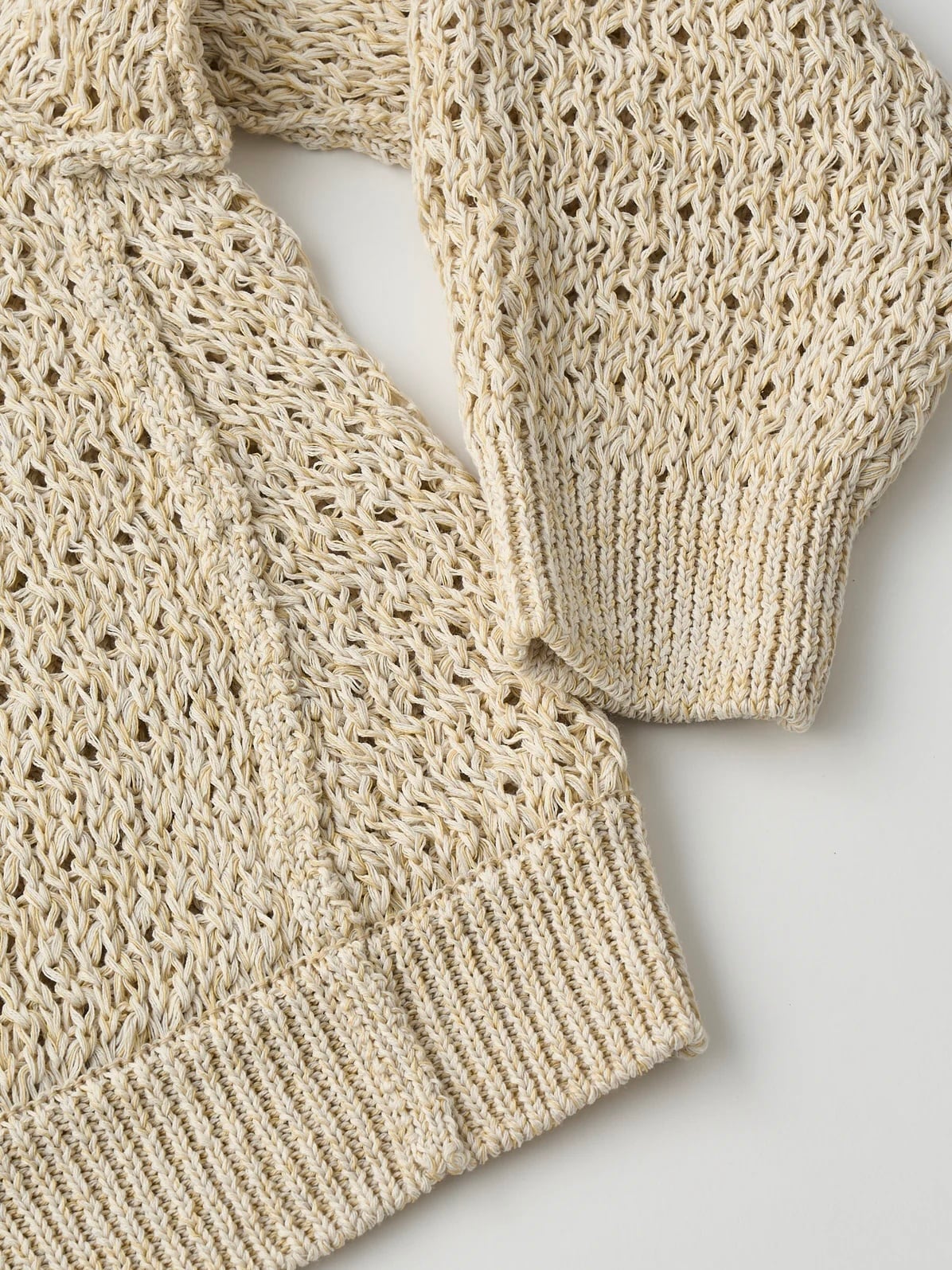 裏と表を違う編み組織で構成されている二重構造になっているニットです。ざっくりとした編み目を表現しながらズルッと伸びないように仕上げる為に考えた編み地になります。特殊な加工で麻のような質感にしているコットンと、シルクの糸を使用し、それぞれ色を変えることで、絶妙なMIXカラーにしています。