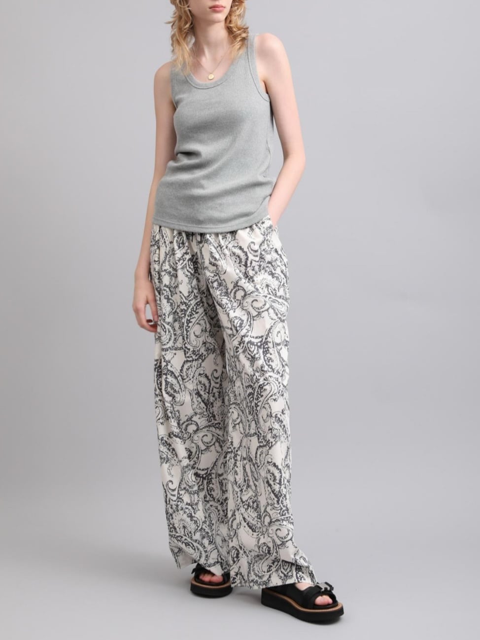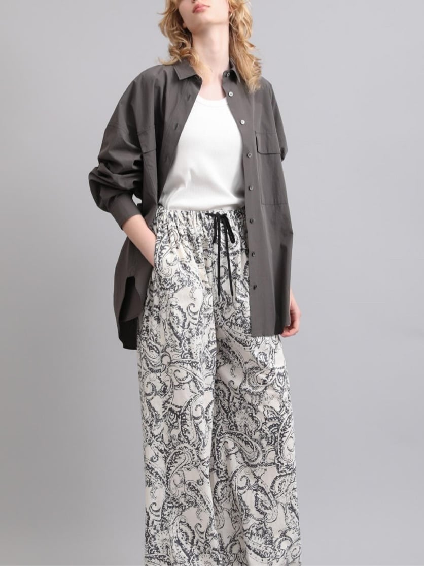 SACRAオリジナルプリントのワイドパンツ。独特のタッチで描かれたペイズリープリントはモノトーンカラーでシックな印象に。柔らかさと雰囲気のある表情を持つコットンローン素材にのせて軽やかさを演出。リラックスムード感じるウエストゴム仕様のワイドパンツは、スタイリングの主役になる一着です。