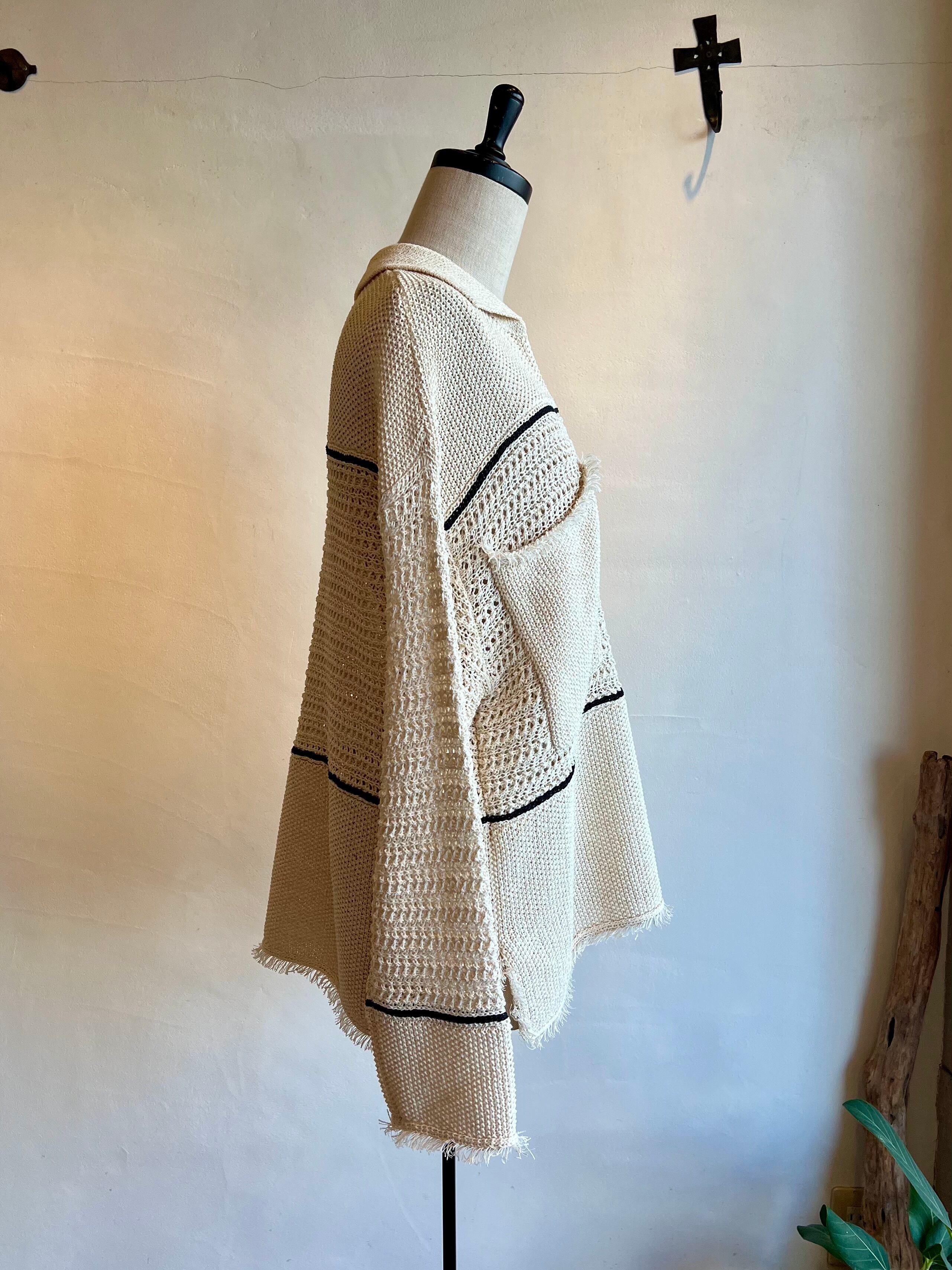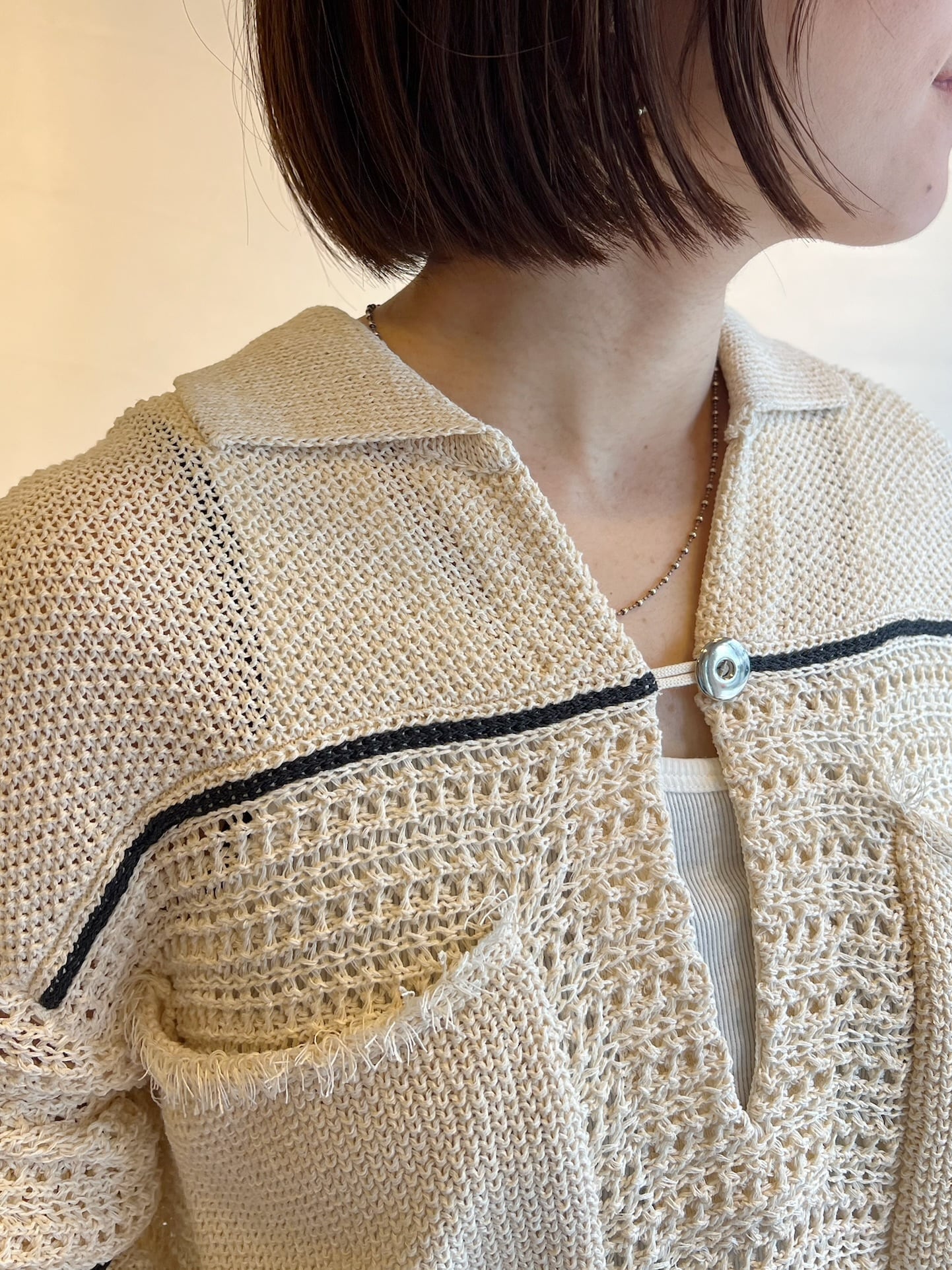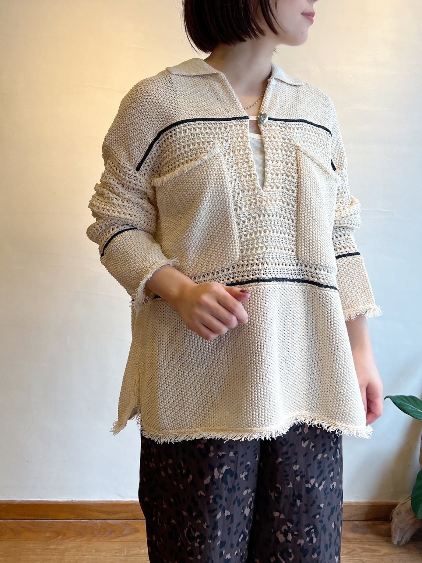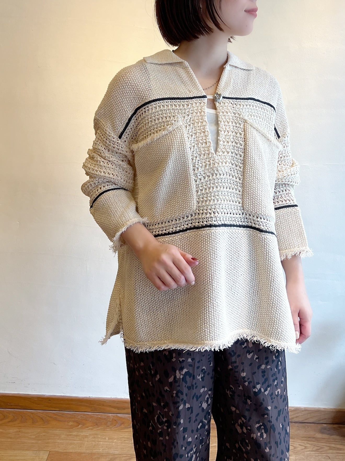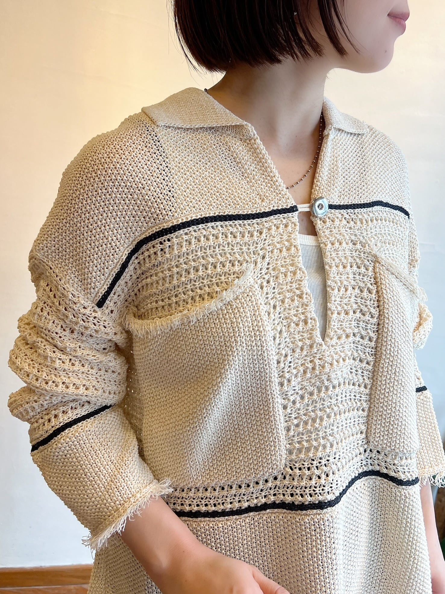襟付きできちんと感もありつつ部位ごとに織目の変えた生地感などこだわりのデザインが一枚でお洒落みえするサマーニットです。