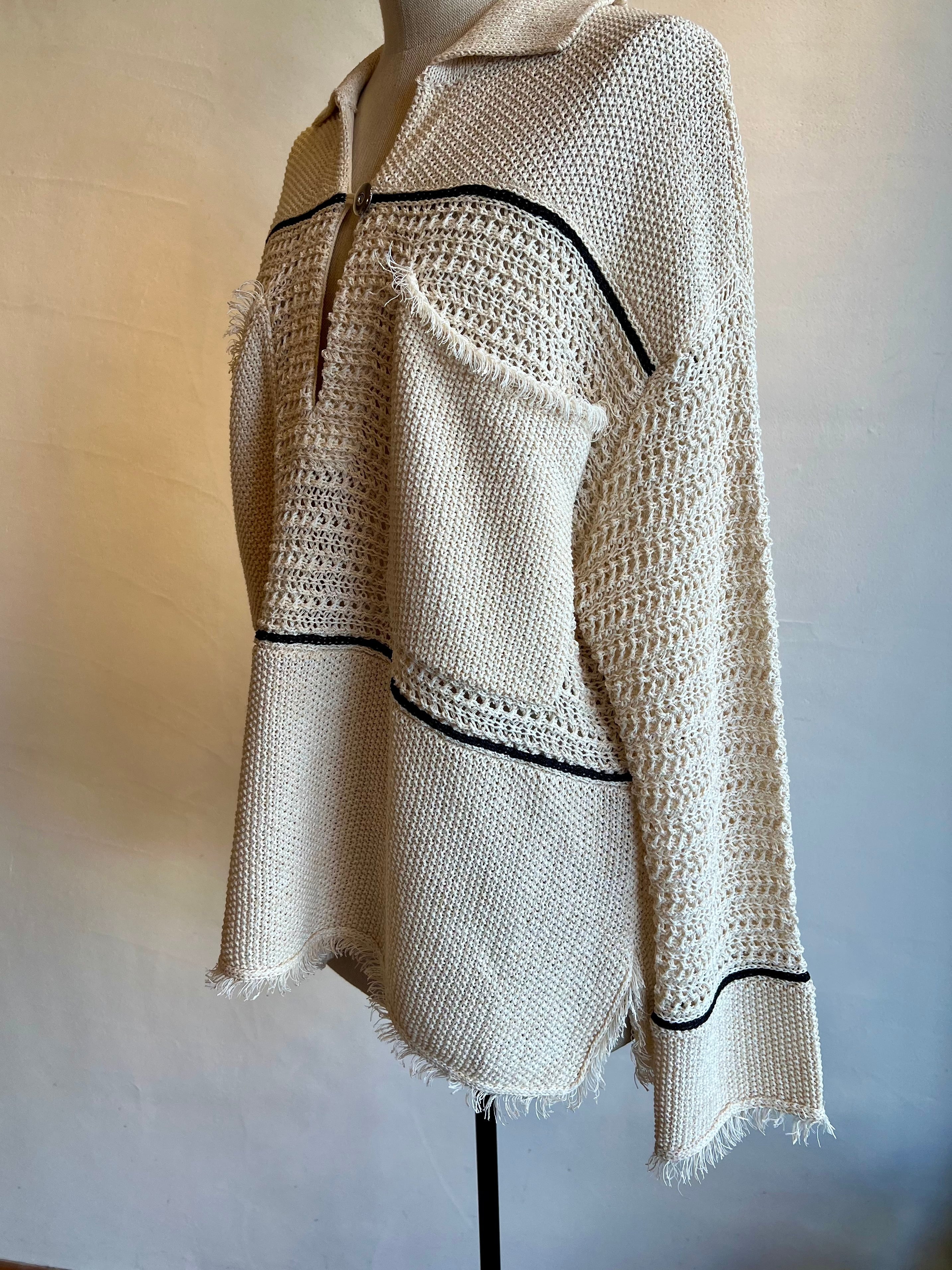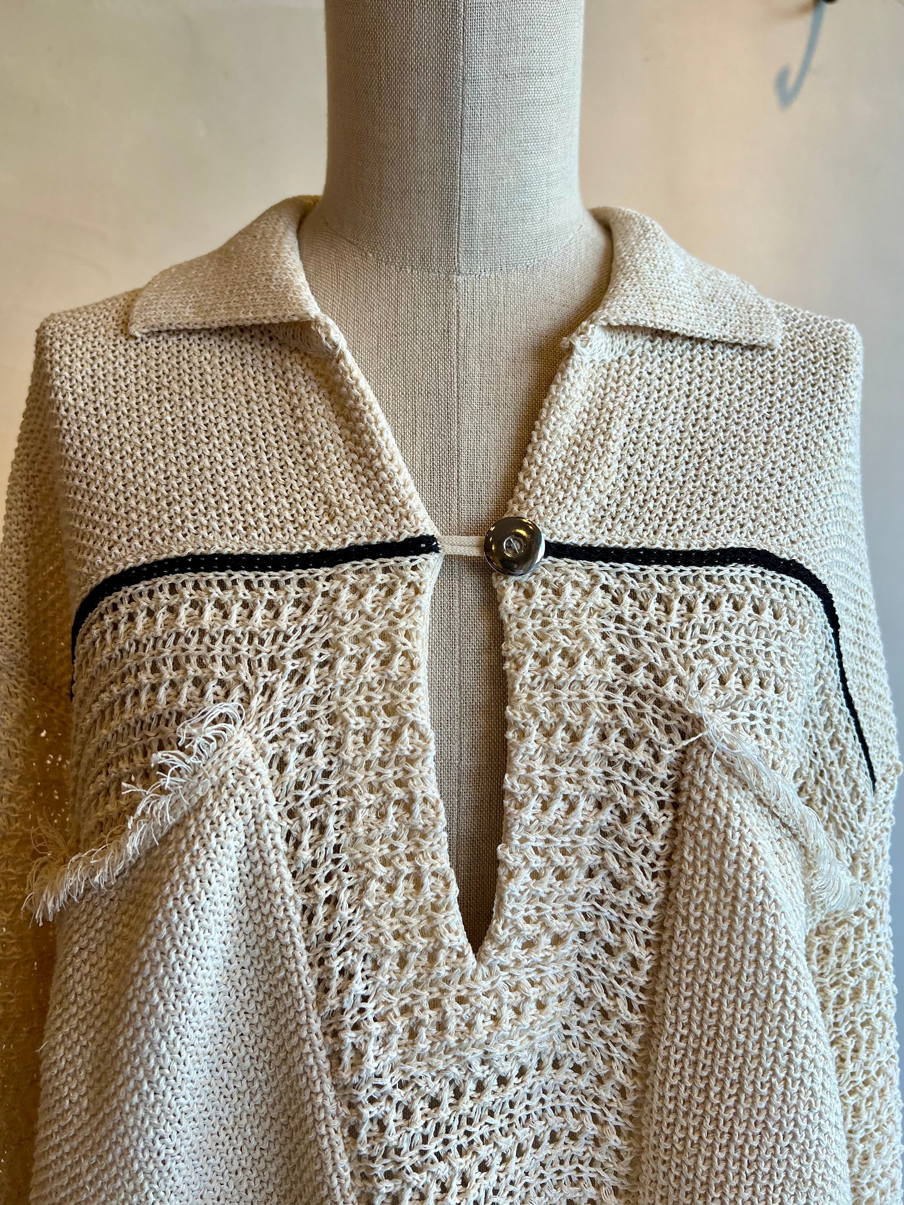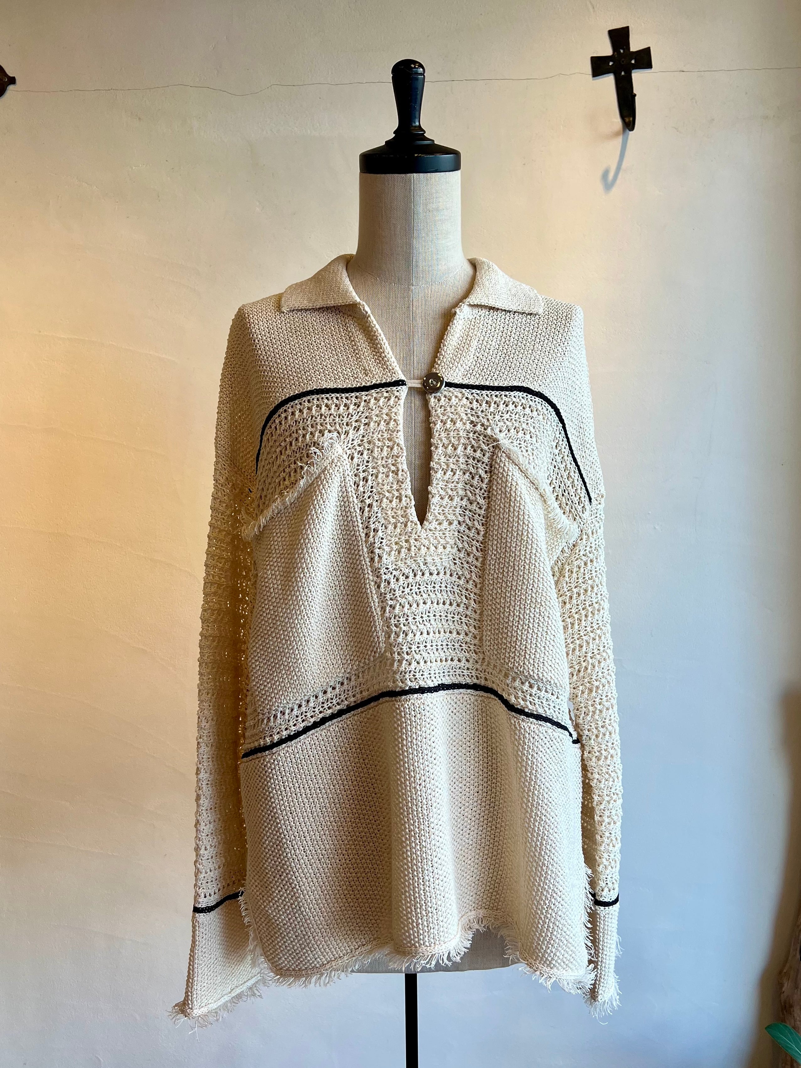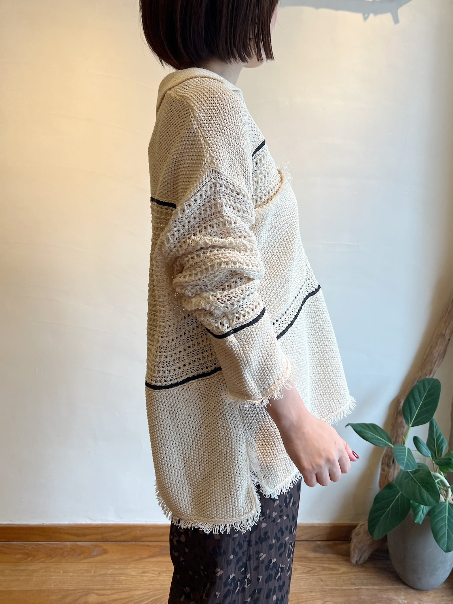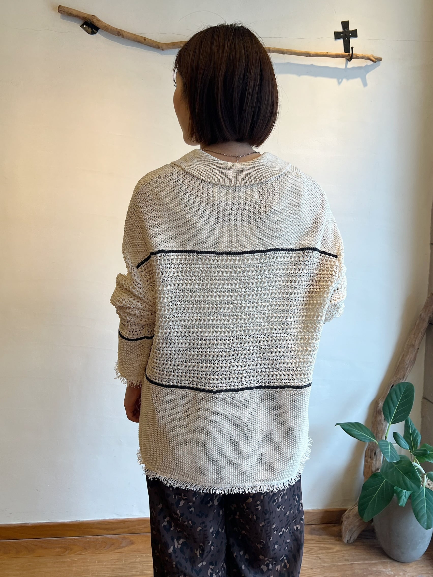 襟付きできちんと感もありつつ部位ごとに織目の変えた生地感などこだわりのデザインが一枚でお洒落みえするサマーニットです。