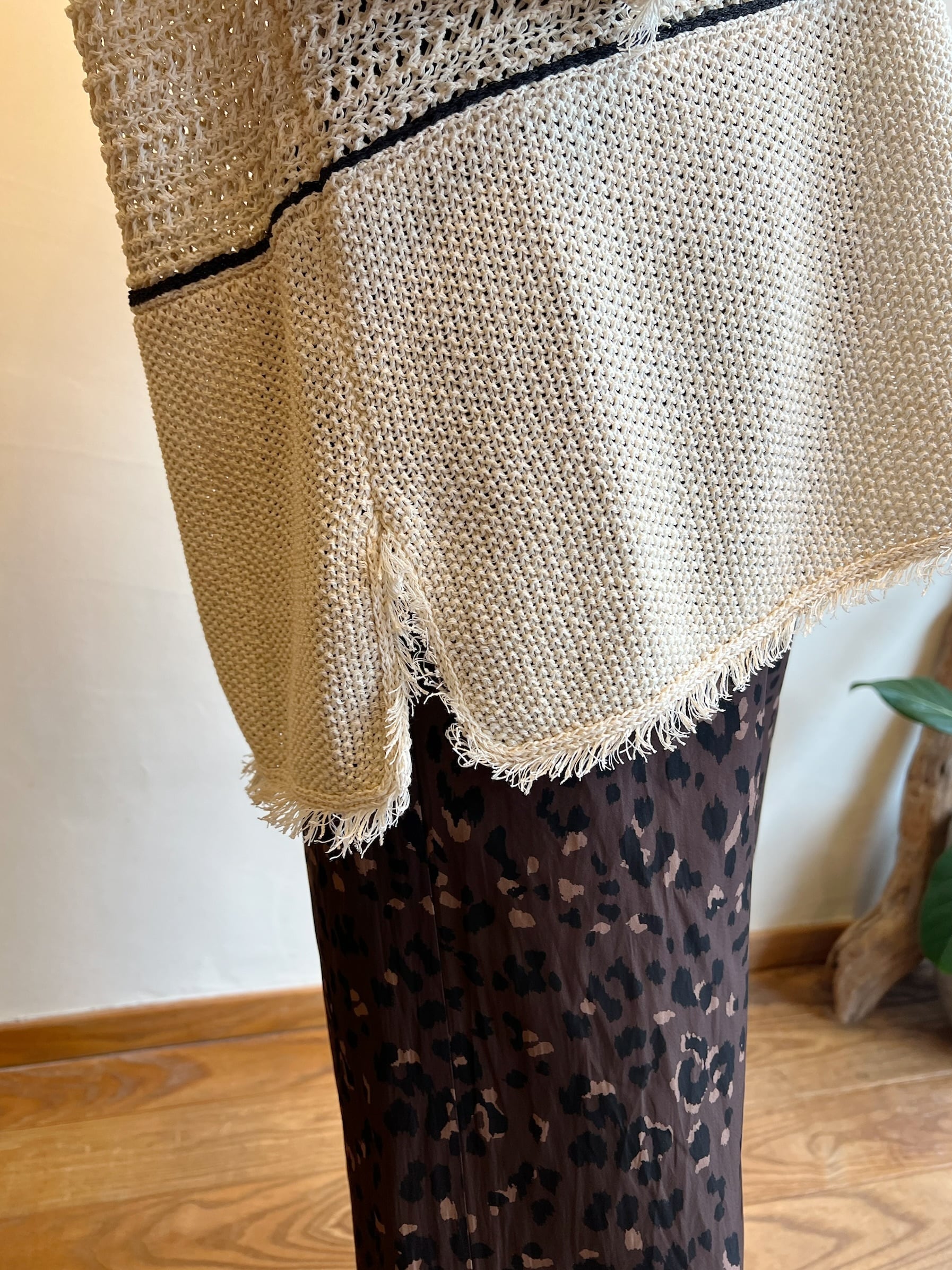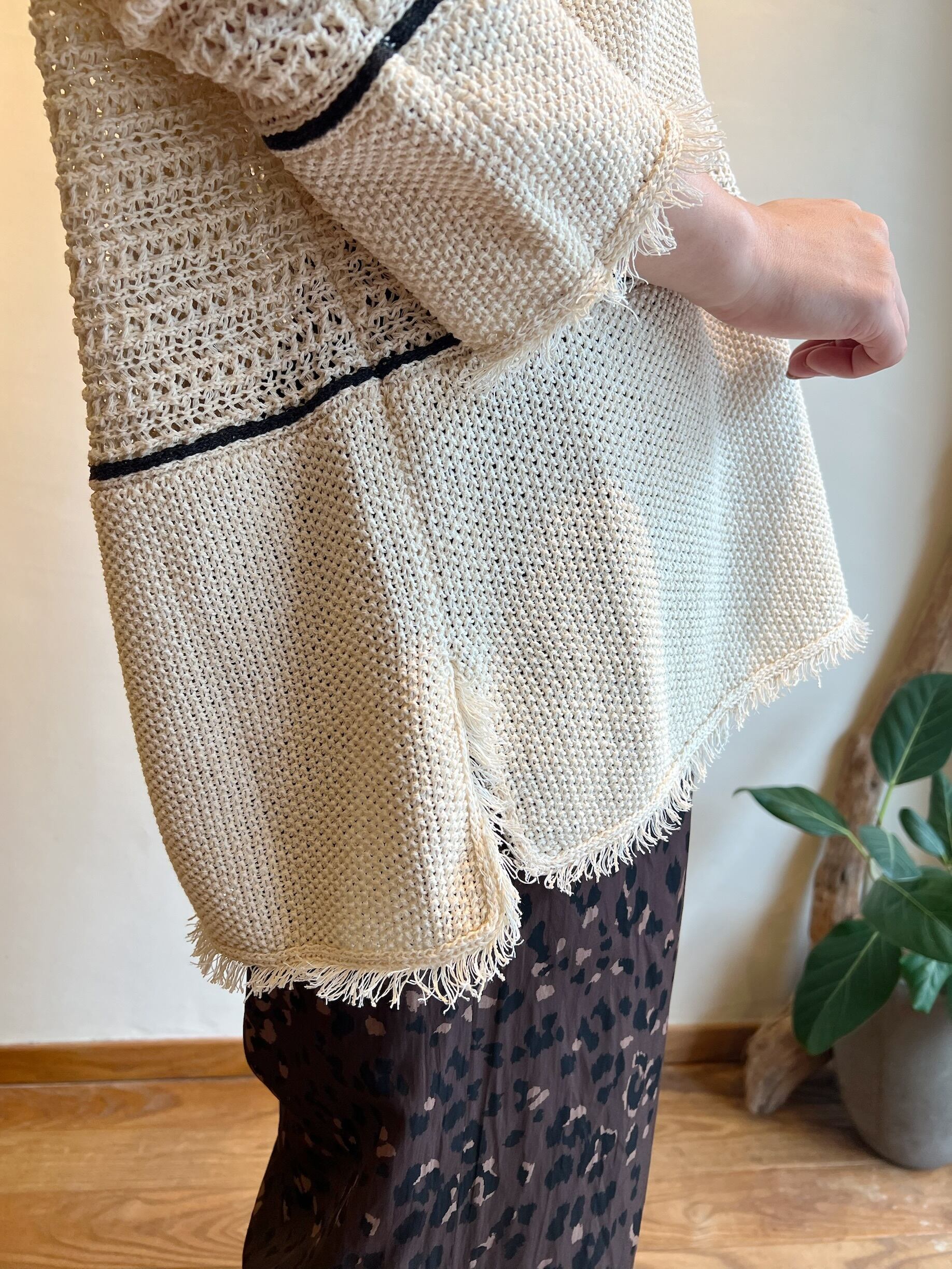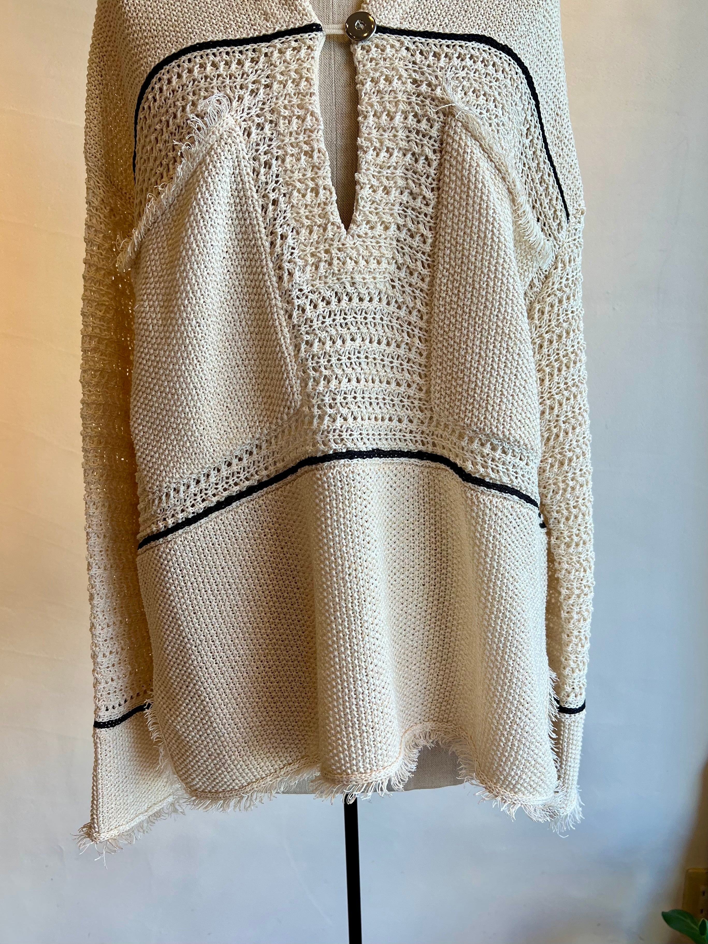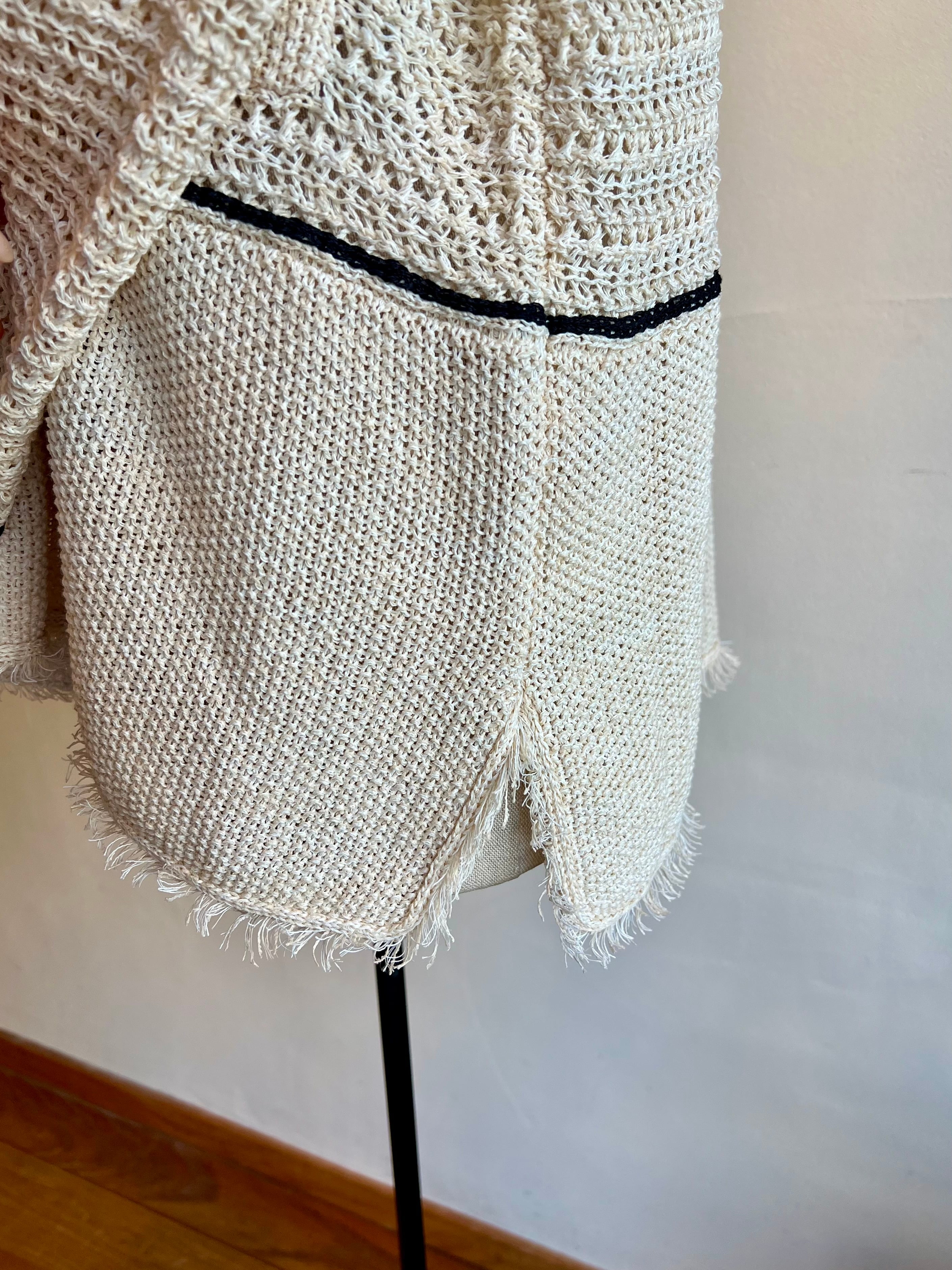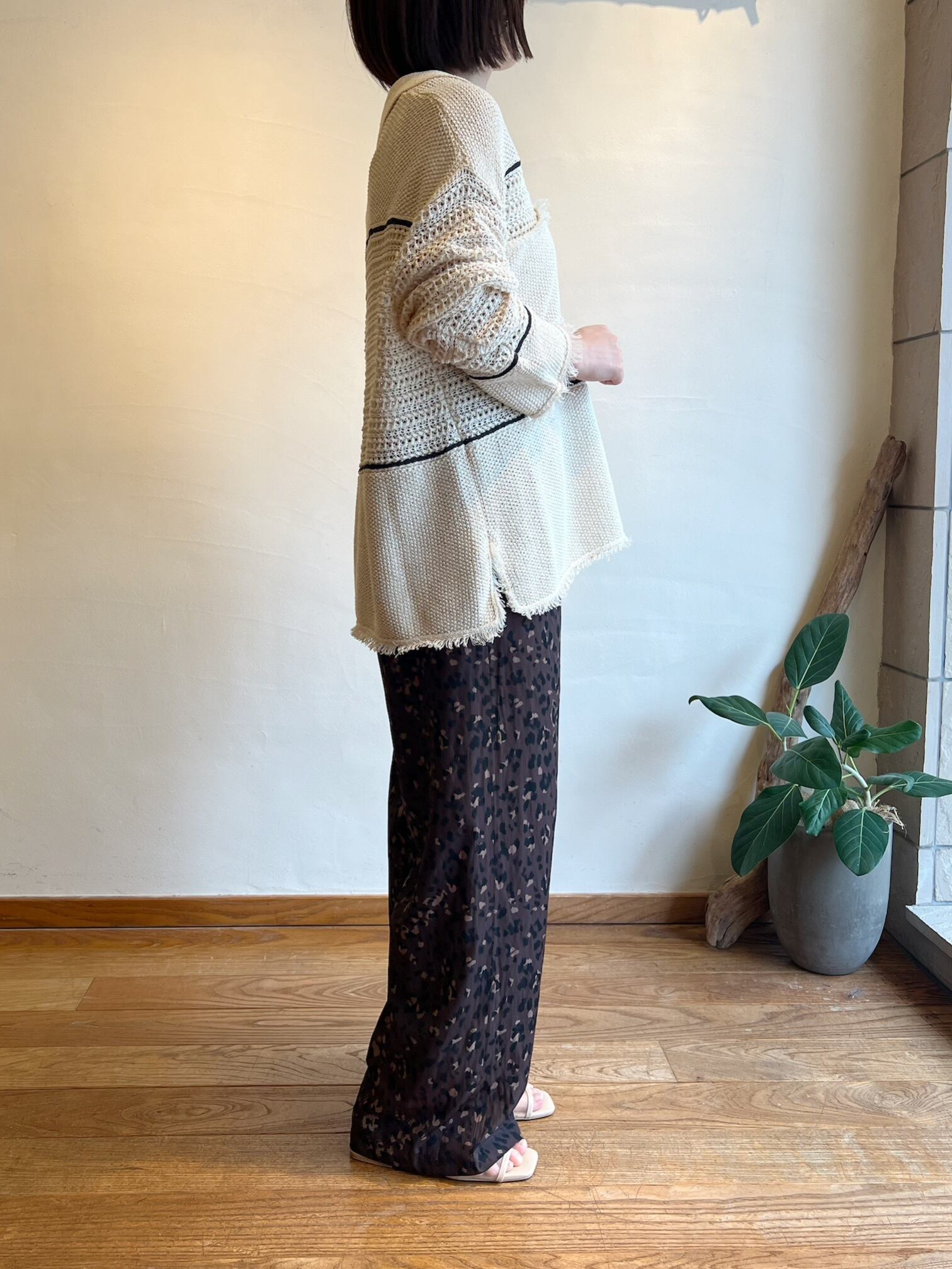 襟付きできちんと感もありつつ部位ごとに織目の変えた生地感などこだわりのデザインが一枚でお洒落みえするサマーニットです。