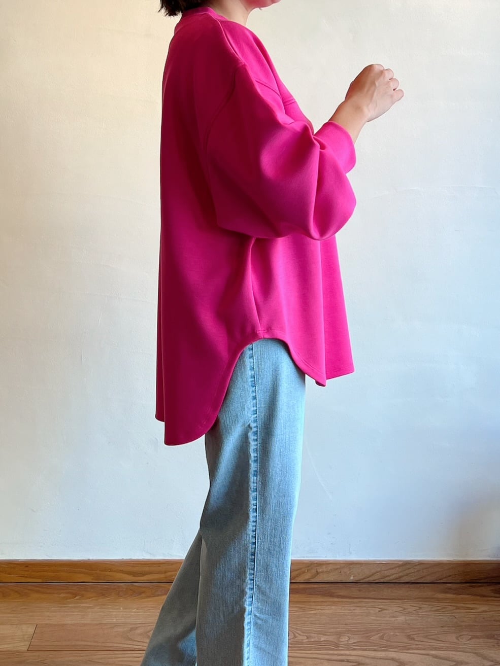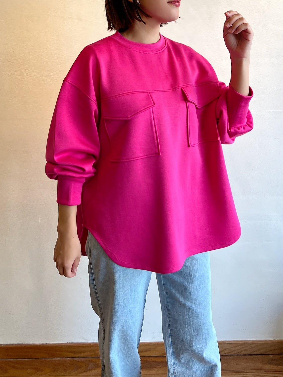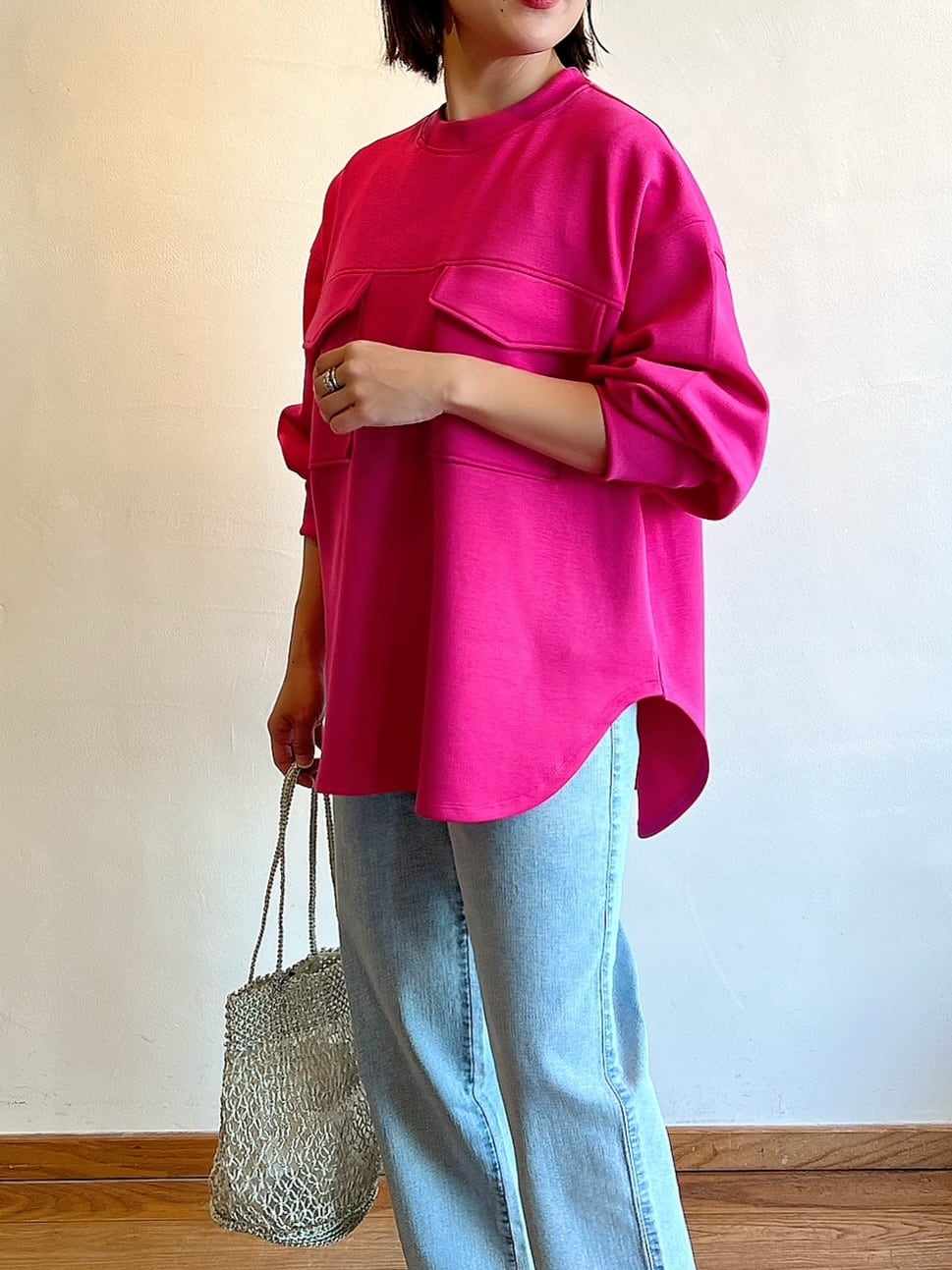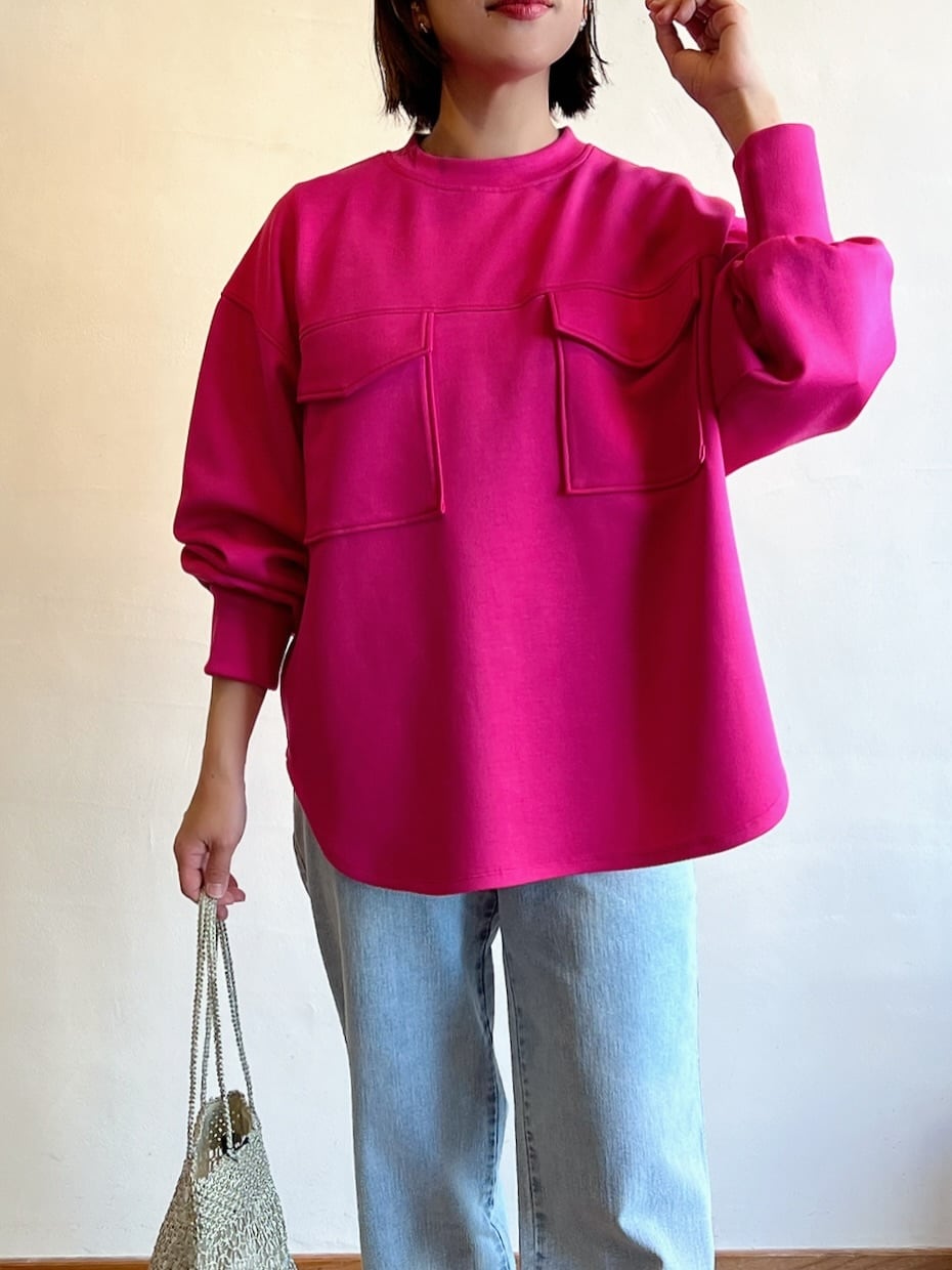 パッと目を惹く鮮やかなカラーが主役のトップス。シンプルなのに、胸元のビックポケットがアクセントに。ゆったりとしたシルエットで体のラインを拾いにくく、リラックスした着心地です。サイドのラウンドカットで、横から見たシルエットもすっきり。艶感のある軽やかなレーヨン混の素材は肌触りが良く気持ちよく着ていただけます。