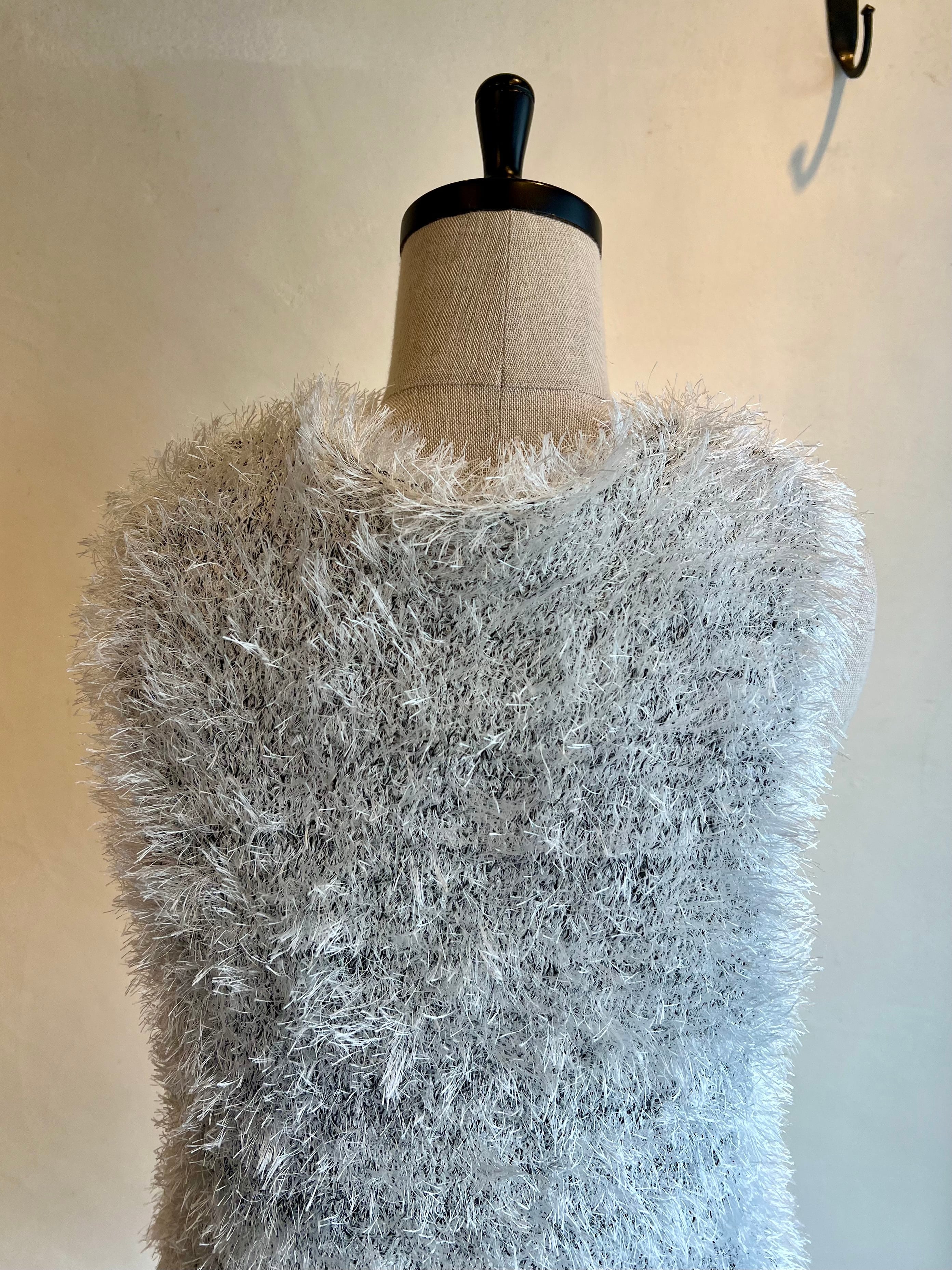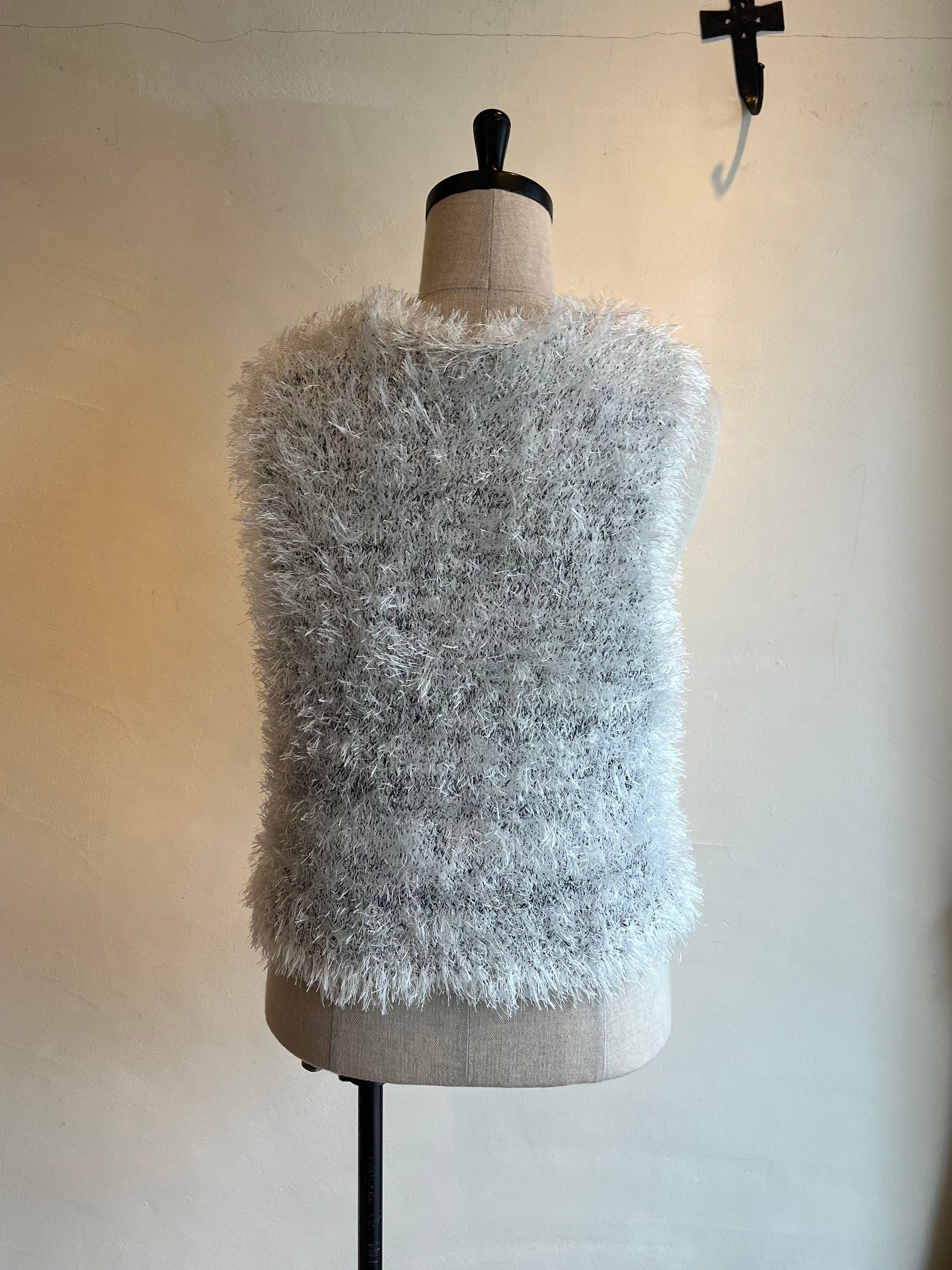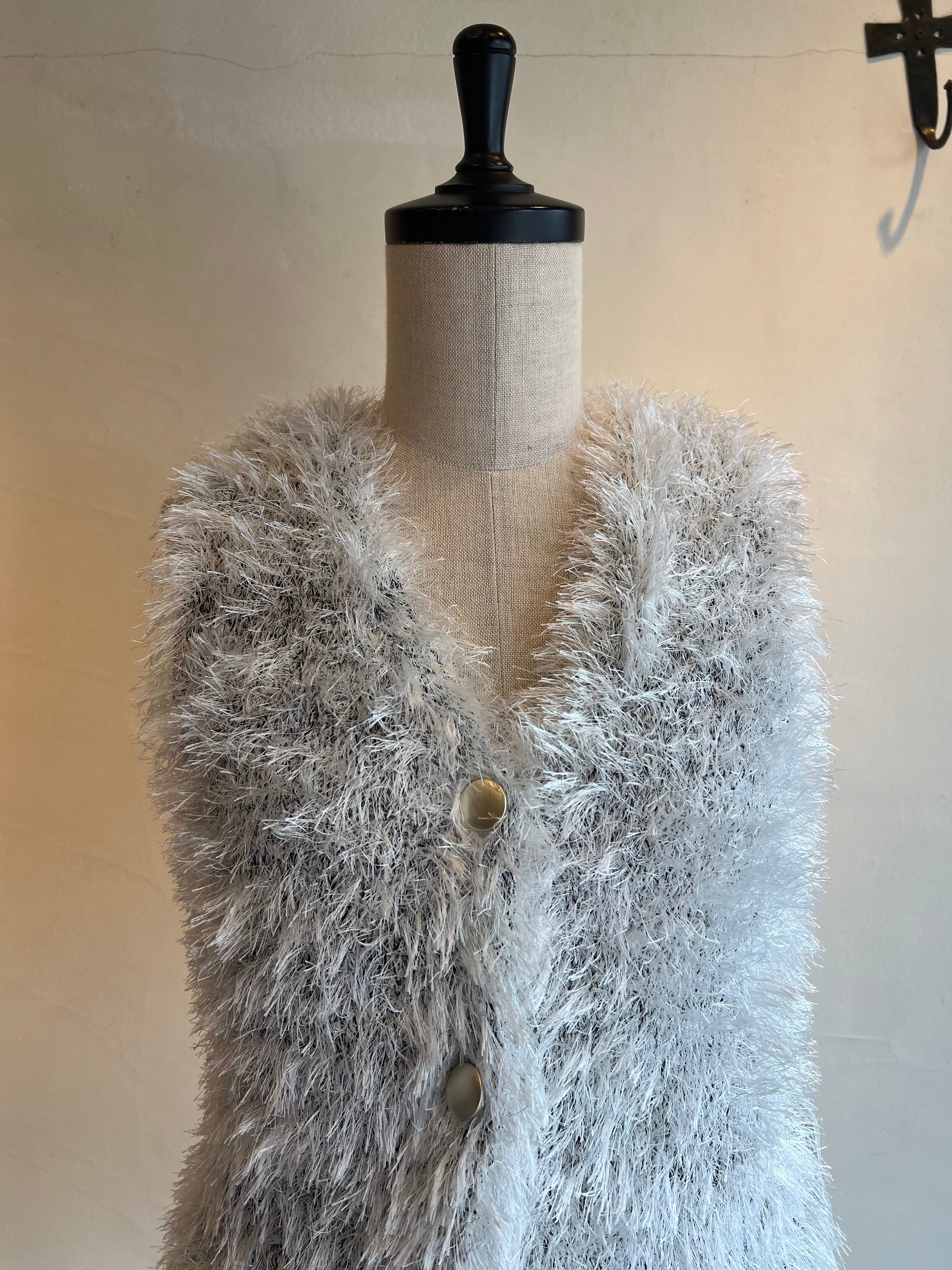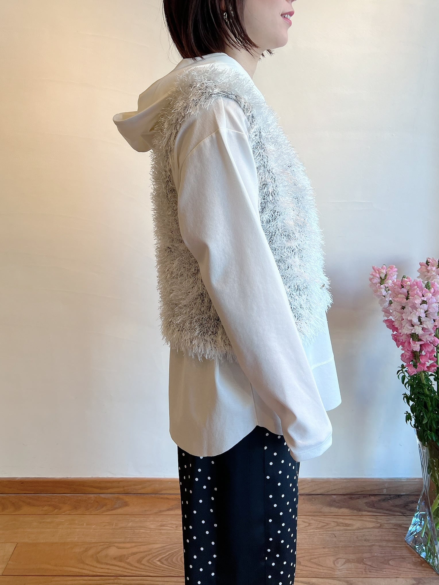 上品で軽やかな印象を与える柔らかく優しい肌触りのニットベスト。光沢のあるミックス糸の様なフェザーが華やかな印象に、カットソーやワンピース等と合わせてコーディネートをスタイルアップしてお楽しみ頂けます。