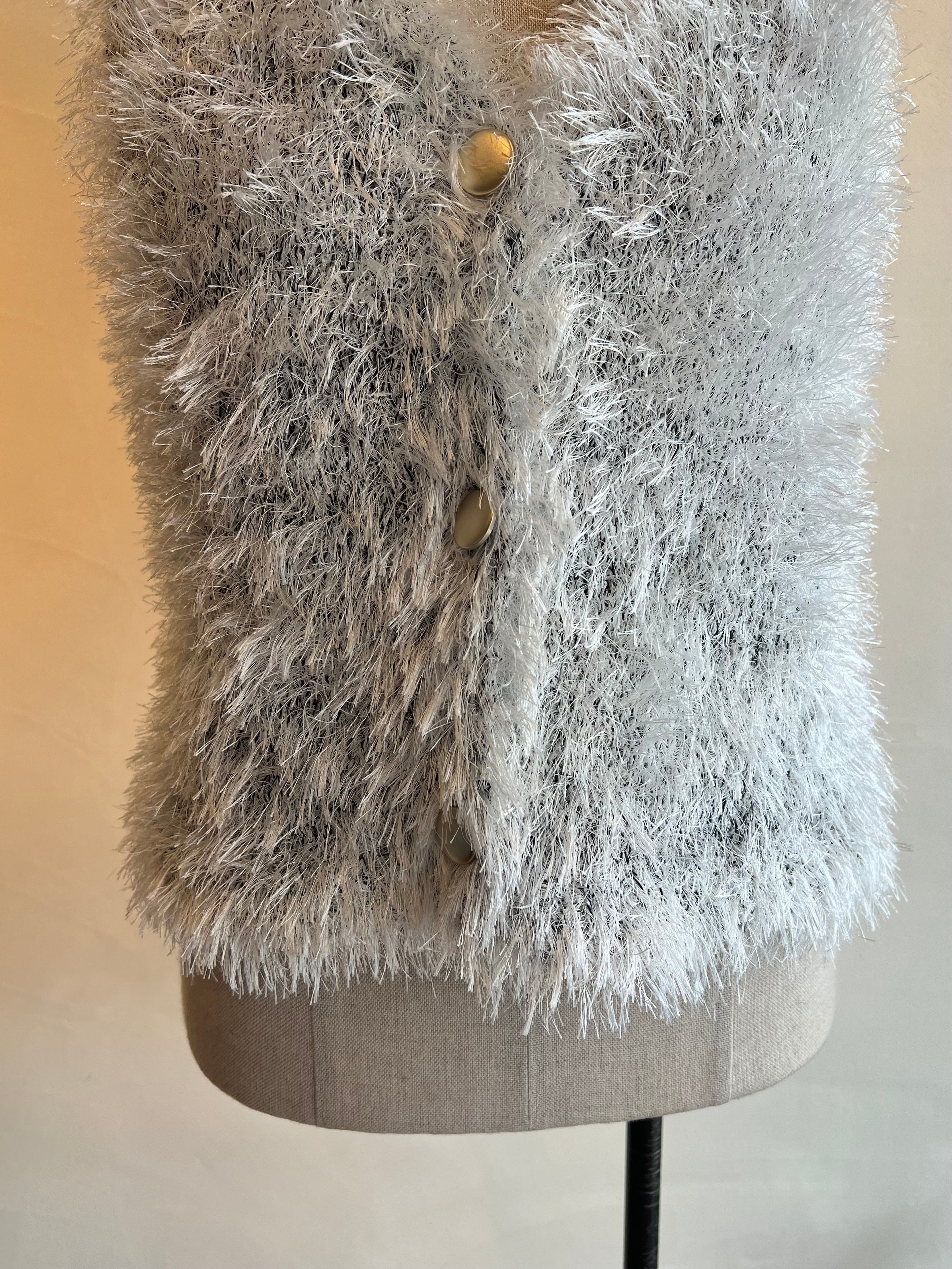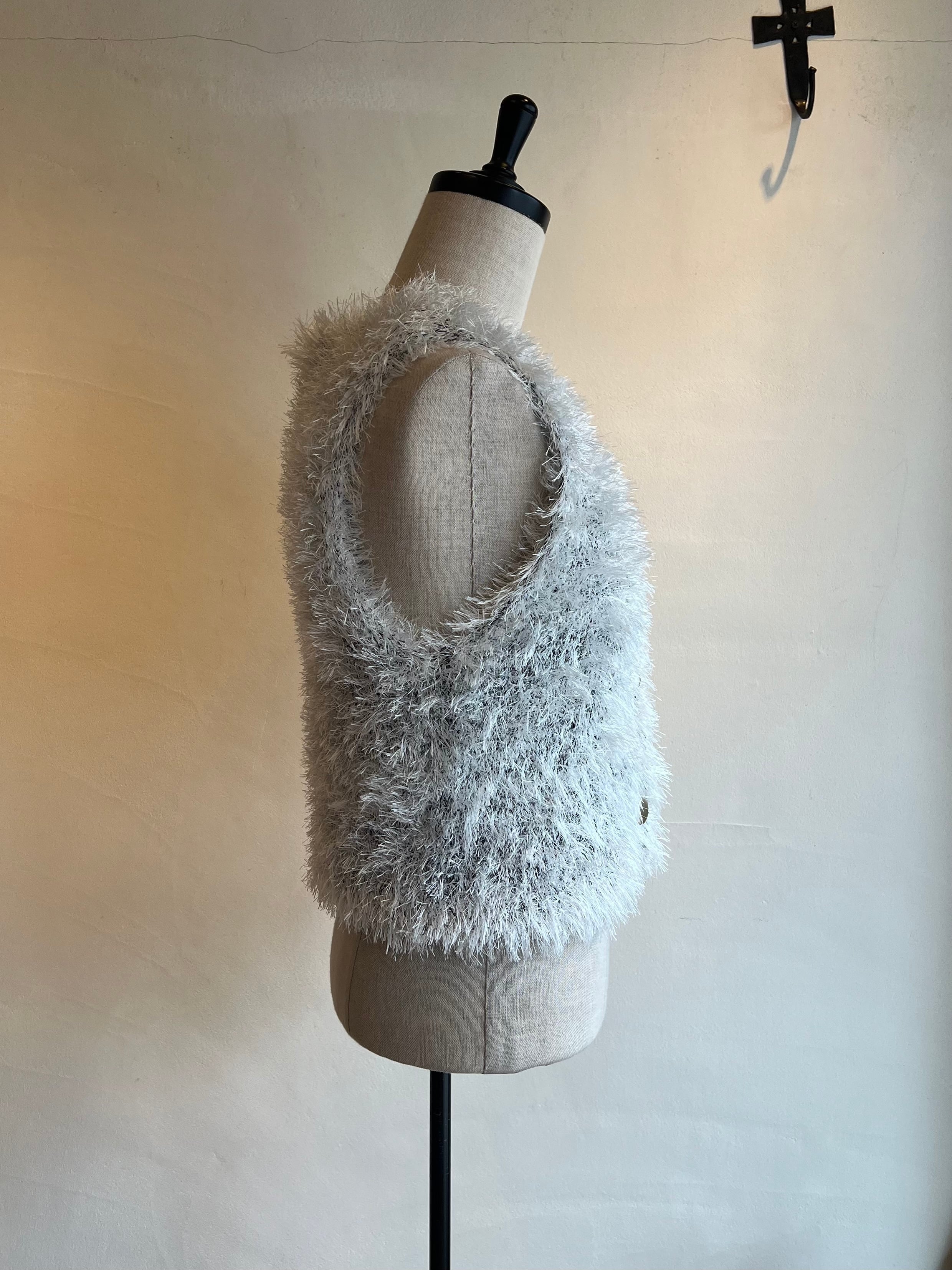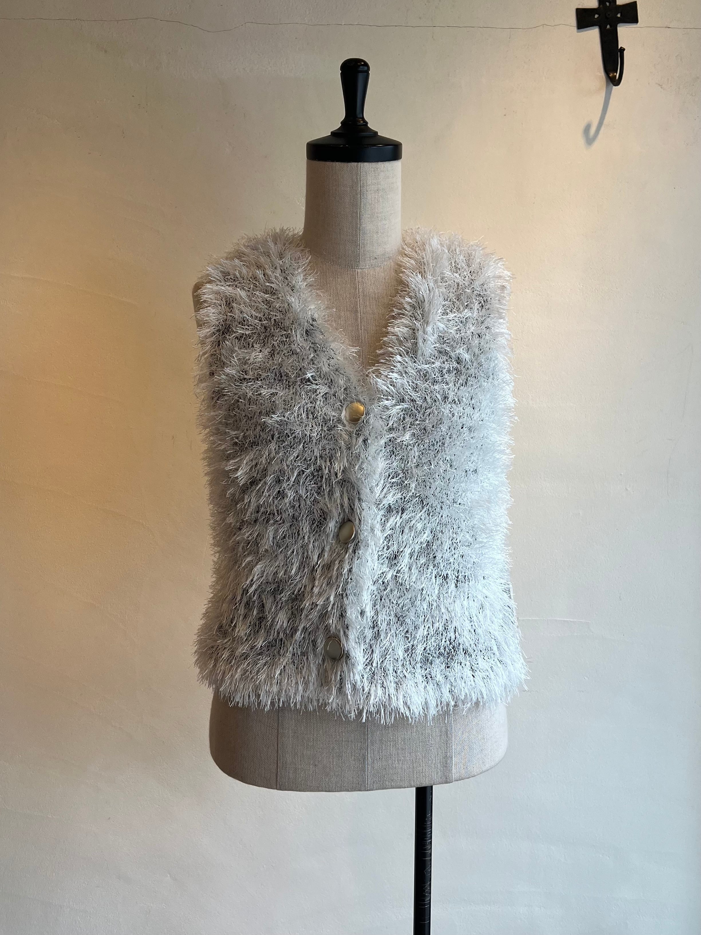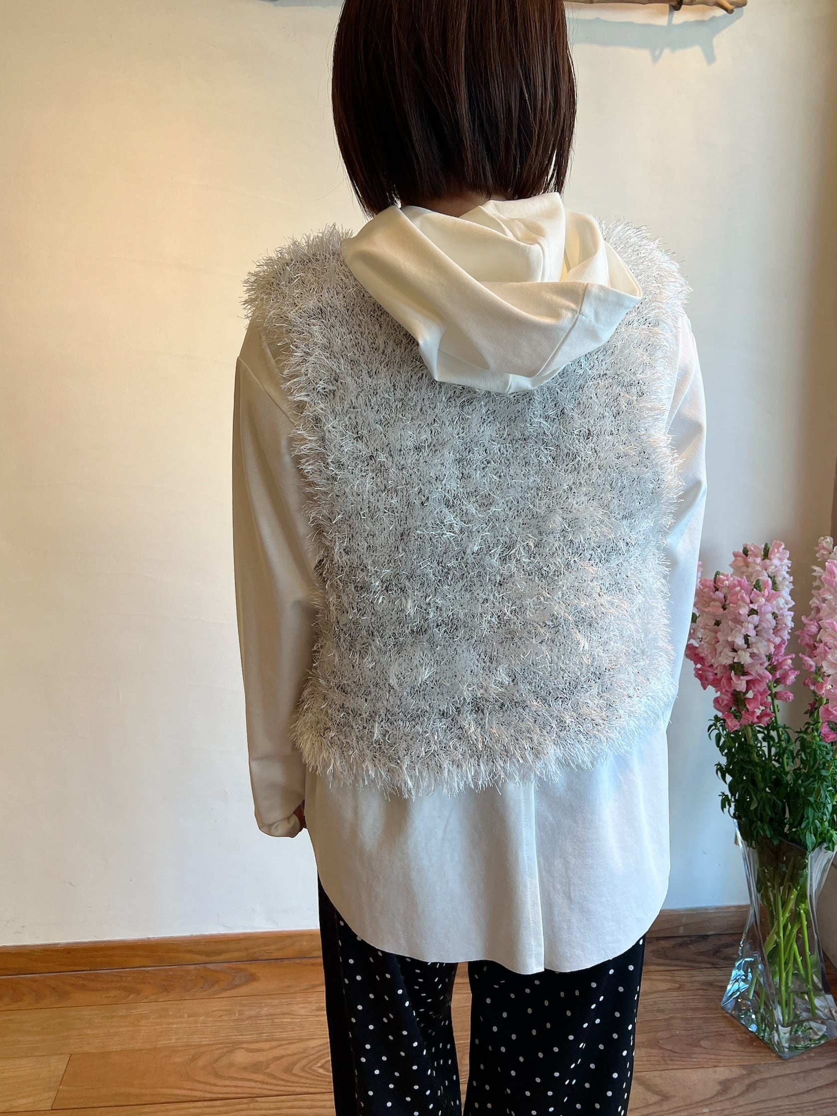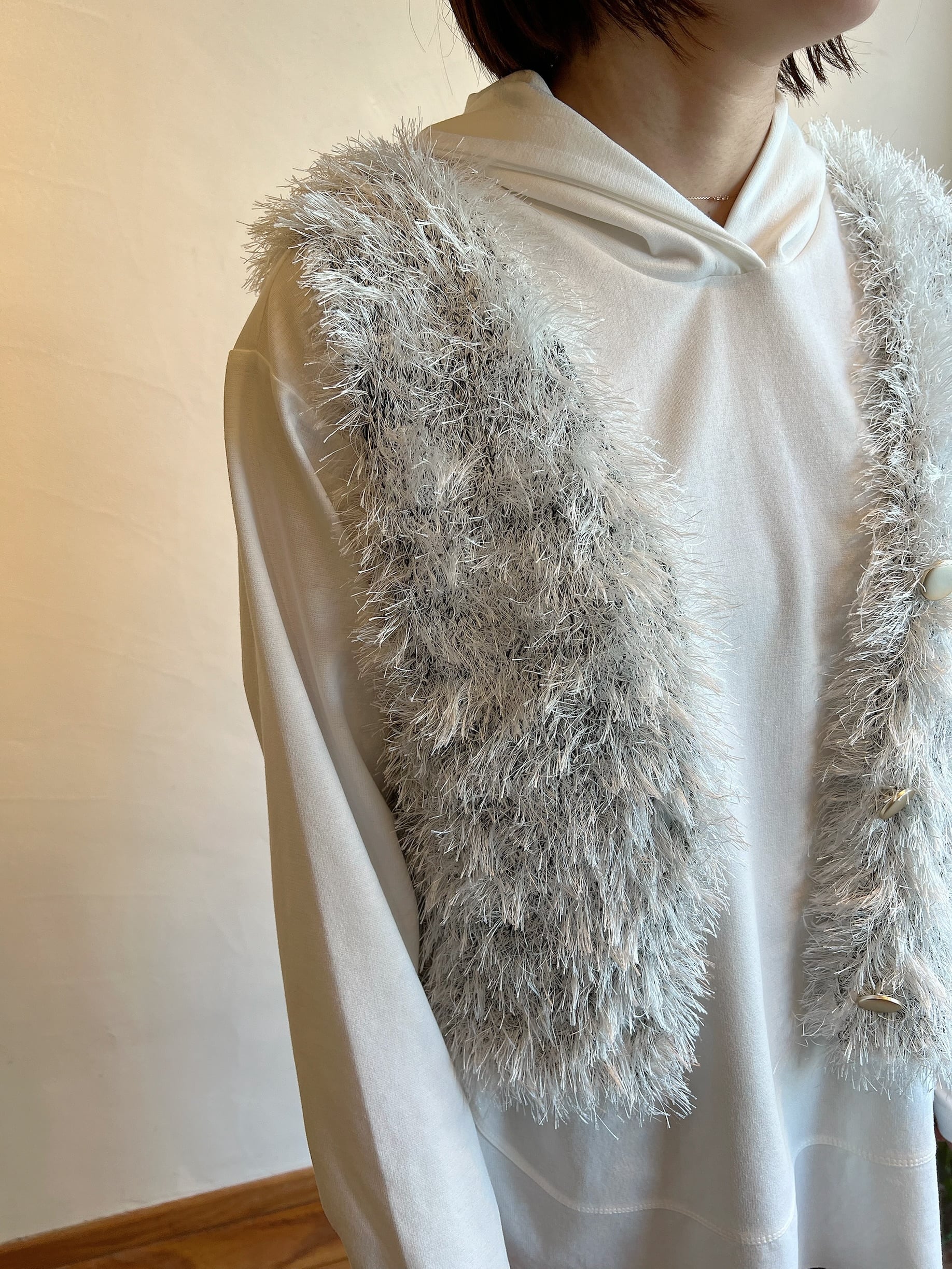 上品で軽やかな印象を与える柔らかく優しい肌触りのニットベスト。光沢のあるミックス糸の様なフェザーが華やかな印象に、カットソーやワンピース等と合わせてコーディネートをスタイルアップしてお楽しみ頂けます。