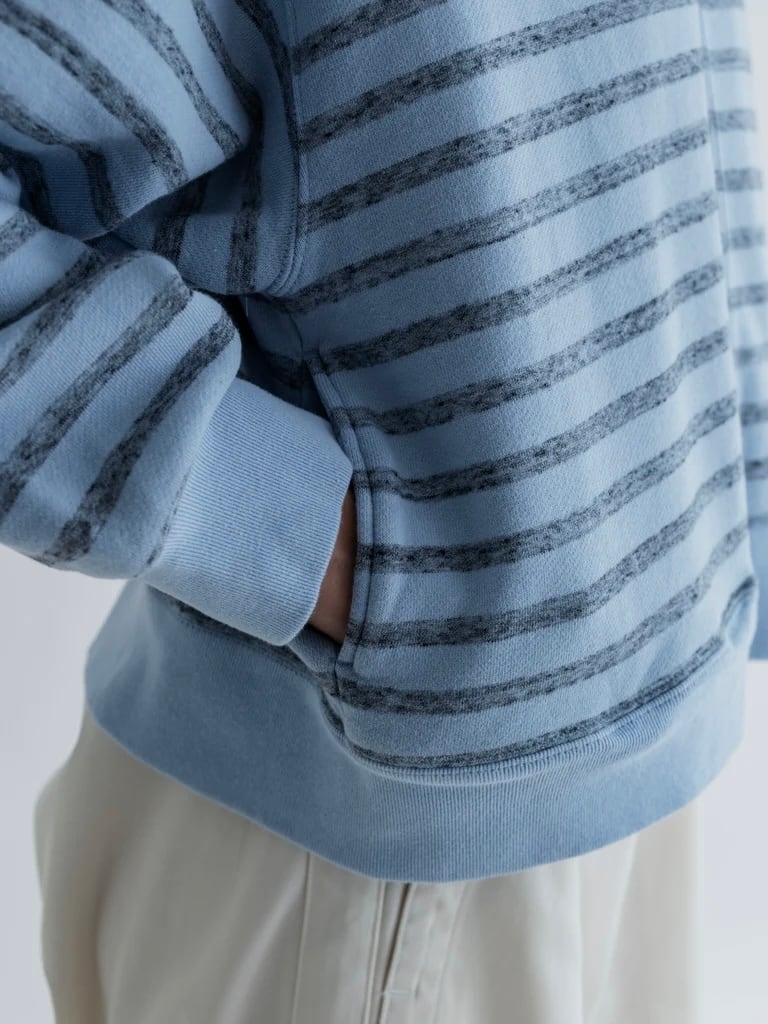 グレーの部分は杢になっていて、色の部分は無地になっています。この杢と無地のボーダーというのは探すと世の中に中々ありません (今までに見られたことがあれば、それはとても貴重です)。見た目も肌触りもMEYAME らしい柔らかで温もりのある素材に仕上がりました。