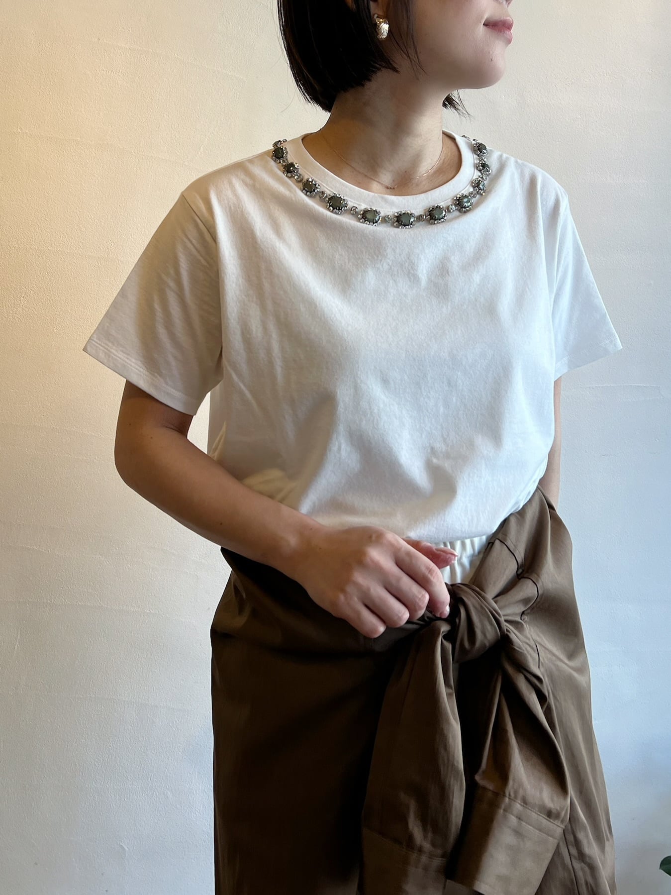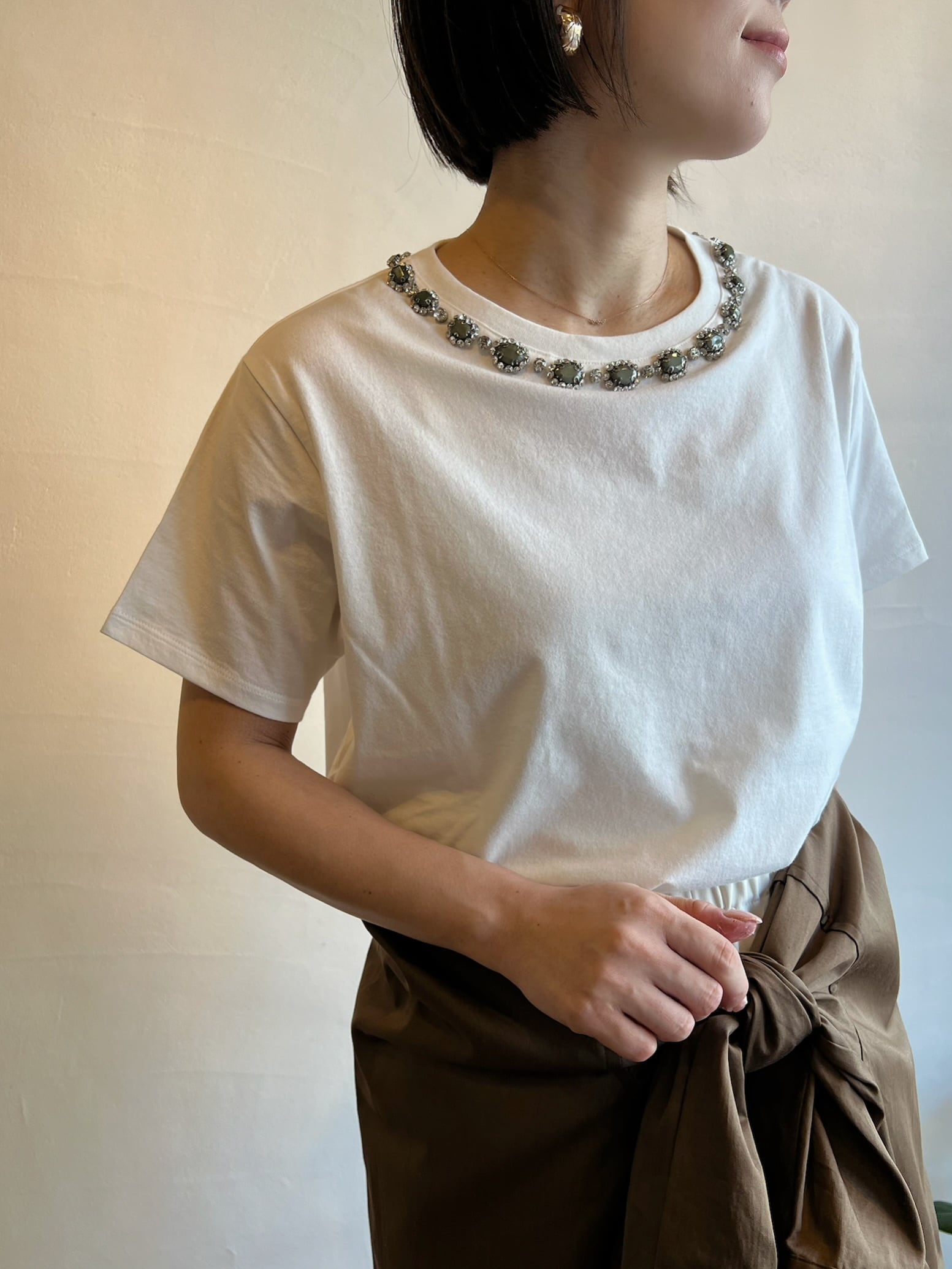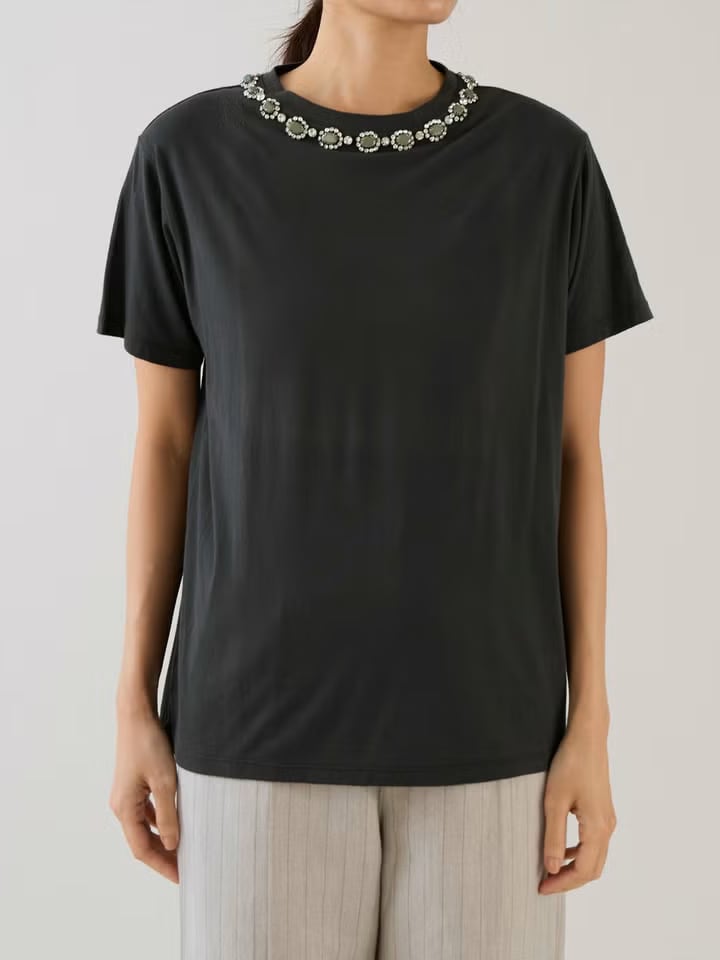 襟ぐりに華やかなビジューを添えた上品な印象のTシャツ。