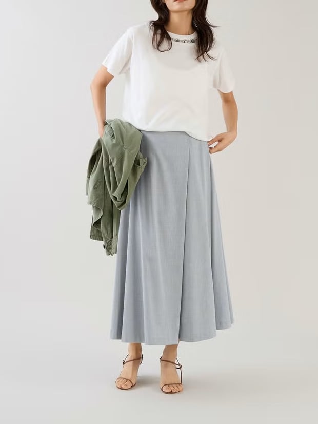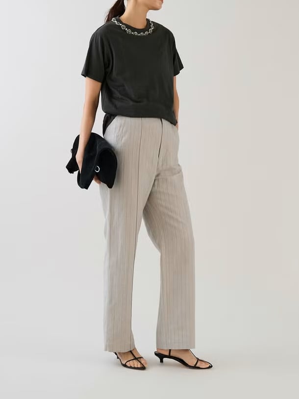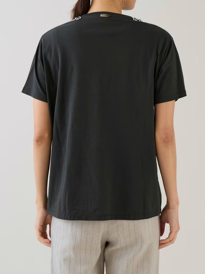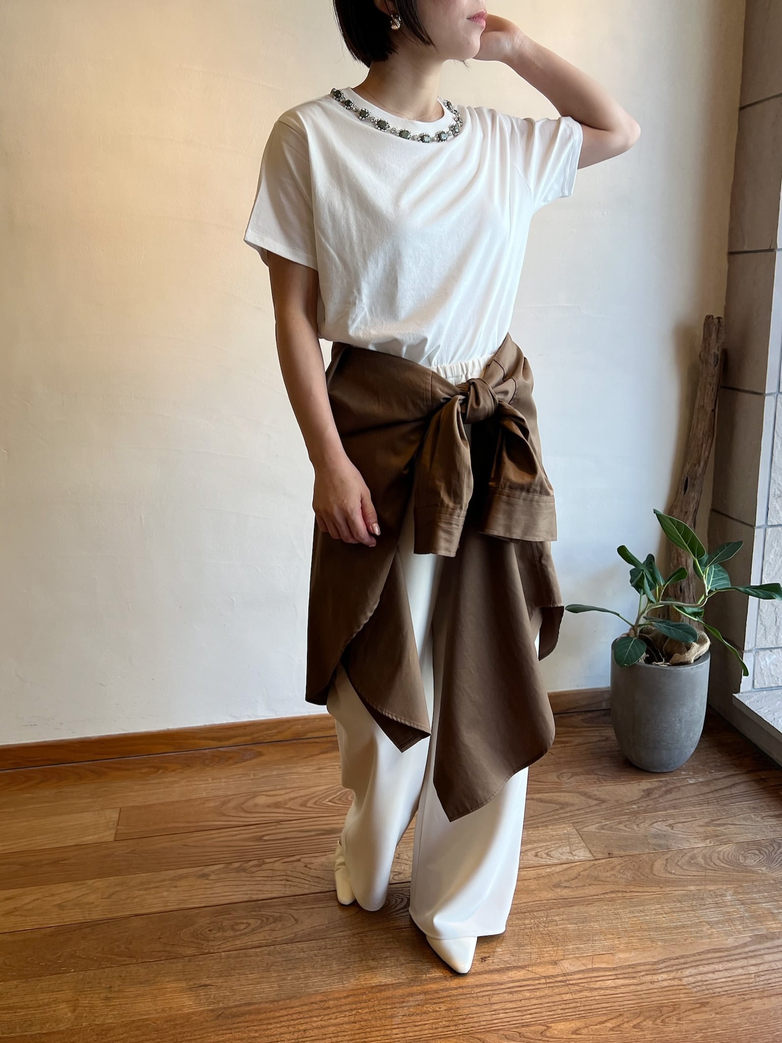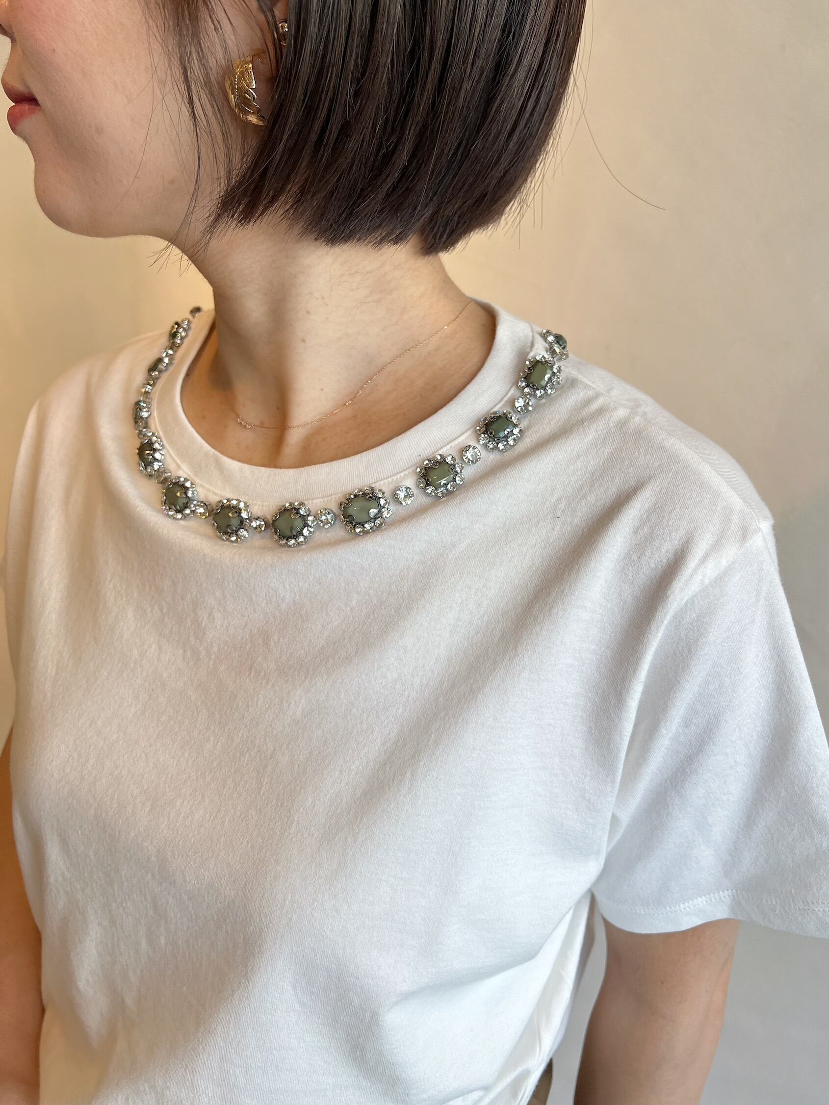 襟ぐりに華やかなビジューを添えた上品な印象のTシャツ。