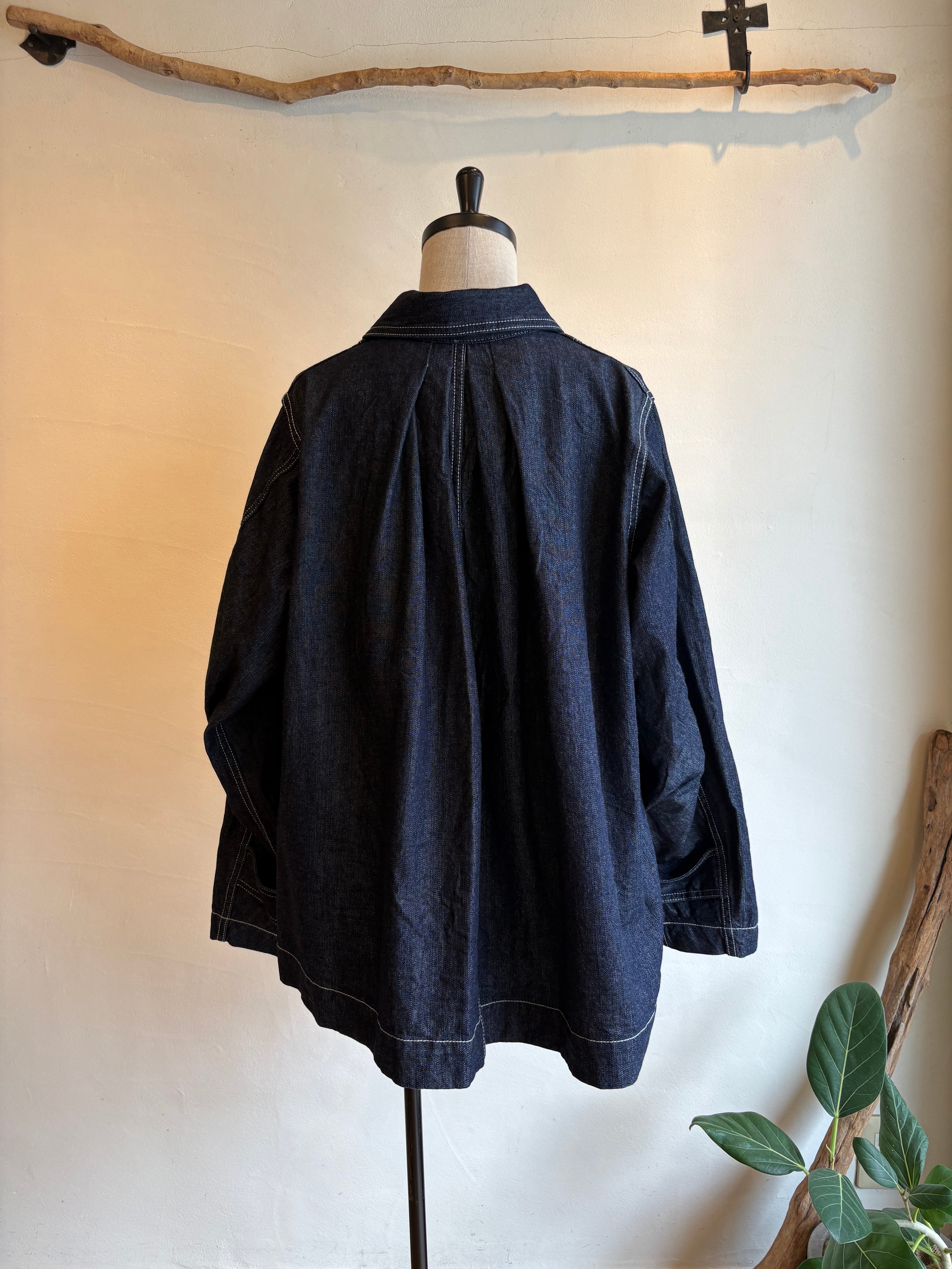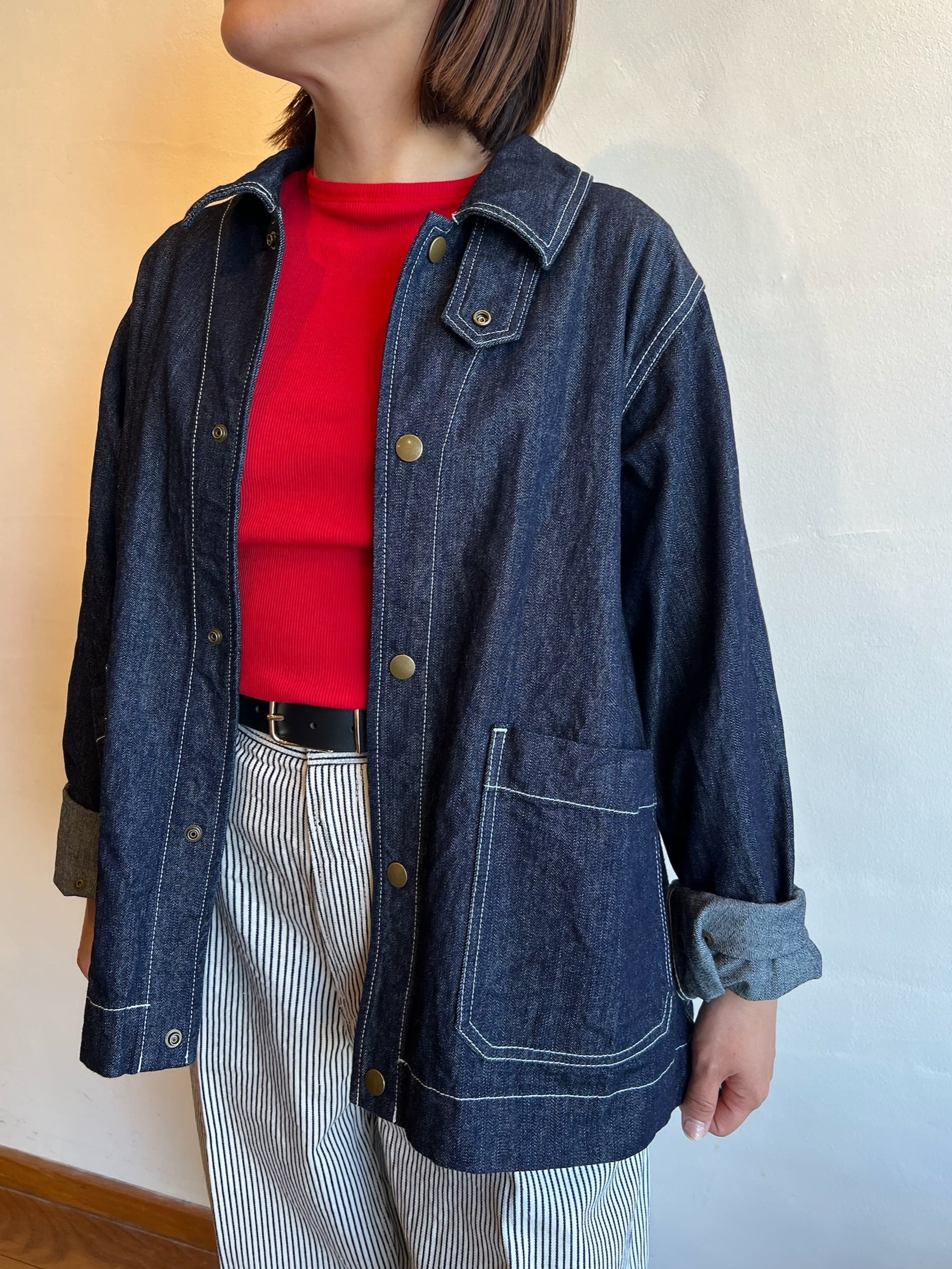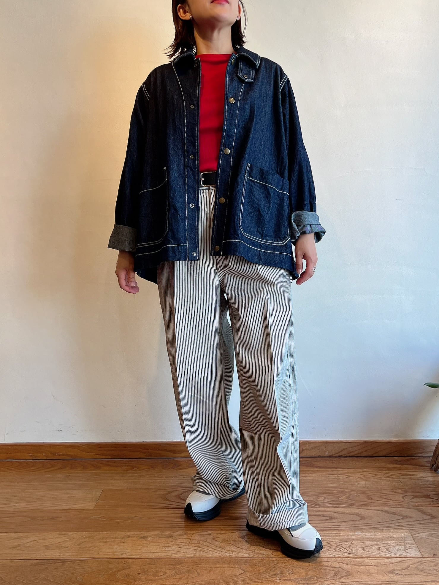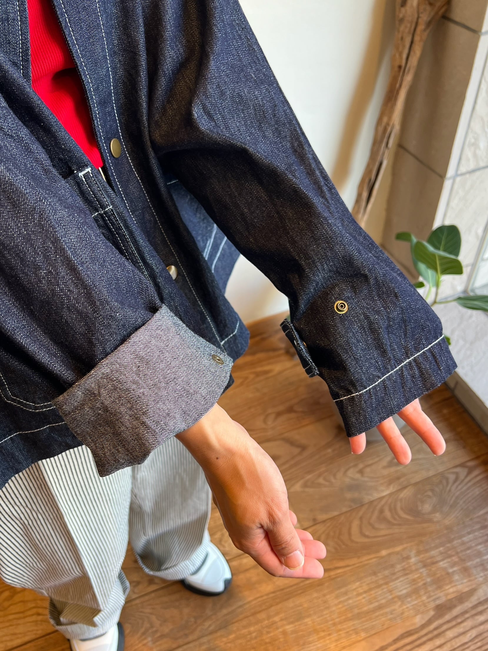 綿100%のデニム素材を使用したカバーオールジャケット。程よくハリがありながらも軽やかな着心地で、季節の変わり目にぴったりの一枚です。Aラインのゆったりとしたシルエットに、大きめのポケットや配色ステッチがアクセント。ワークテイストを取り入れつつ、女性らしくラフに羽織れるデザインに仕上がっています。シャツ感覚でさっと羽織れるので、デイリーに活躍する万能アイテムです。