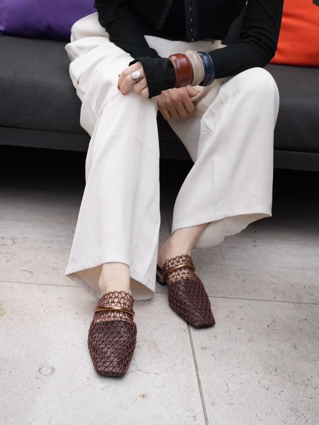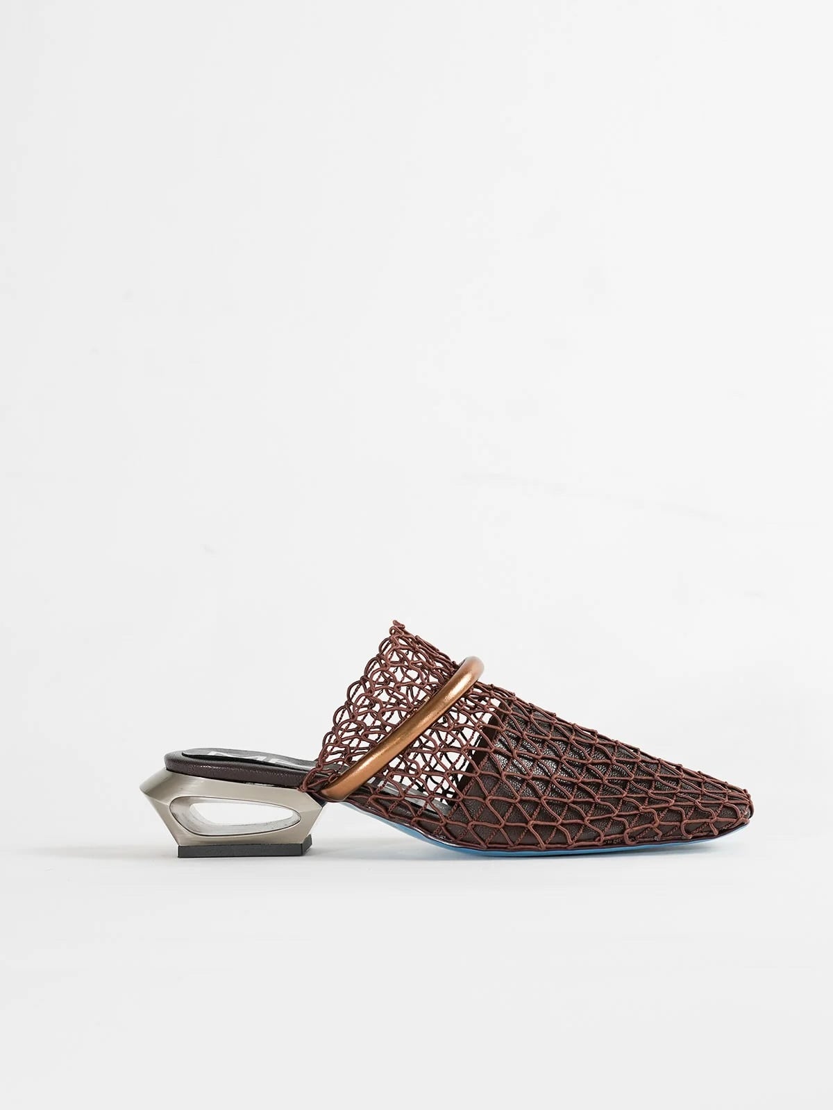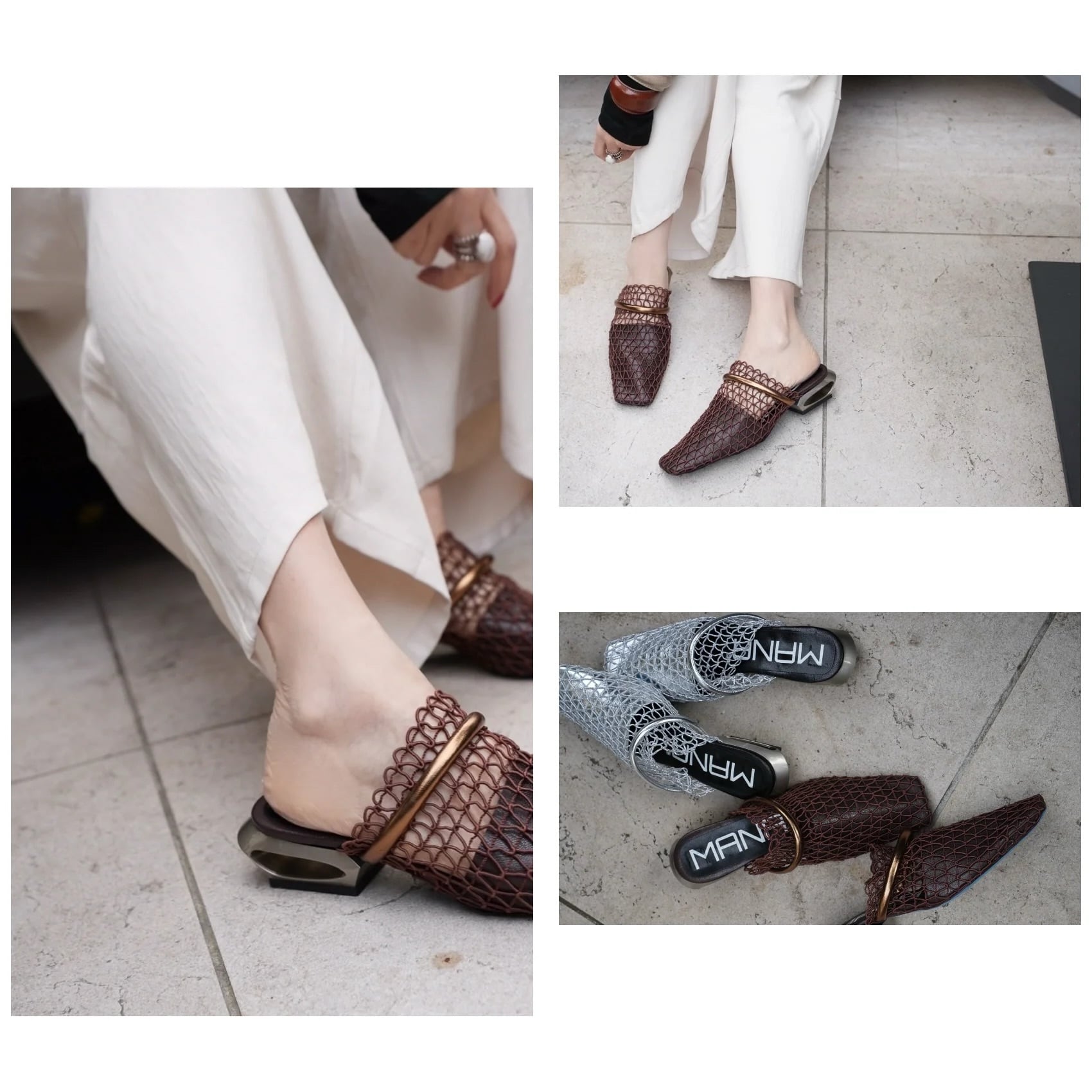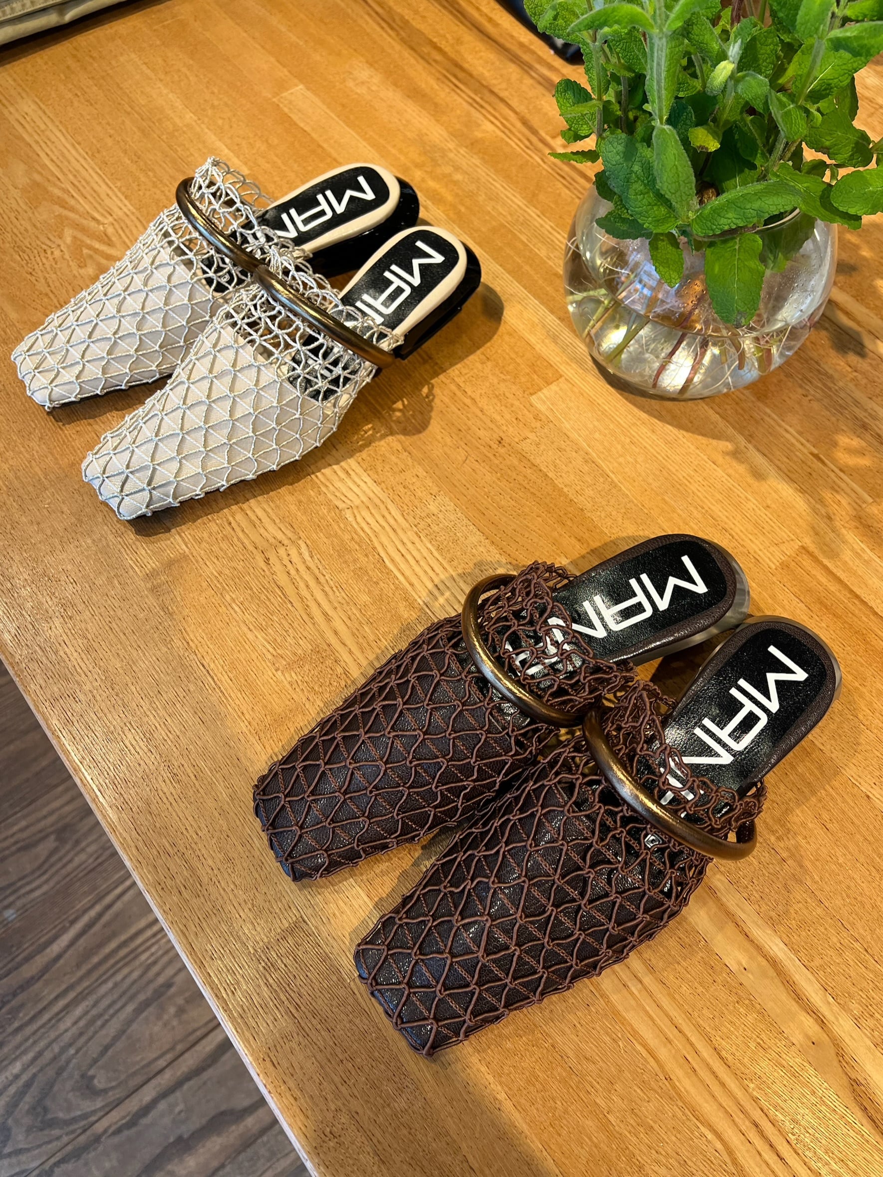 透け感のあるメッシュ素材が涼しげで、足元に抜け感をつくるミュール。目を引く特徴的なヒールデザインは、シンプルすぎず、でもやりすぎない、MANAらしいバランス感。すっと履ける気軽さがありながら、ミュール特有の“脱げやすさ”を感じさせない安定感もポイント。履くだけでスタイリングが引き締まり、足元にさりげなく差がつきます。