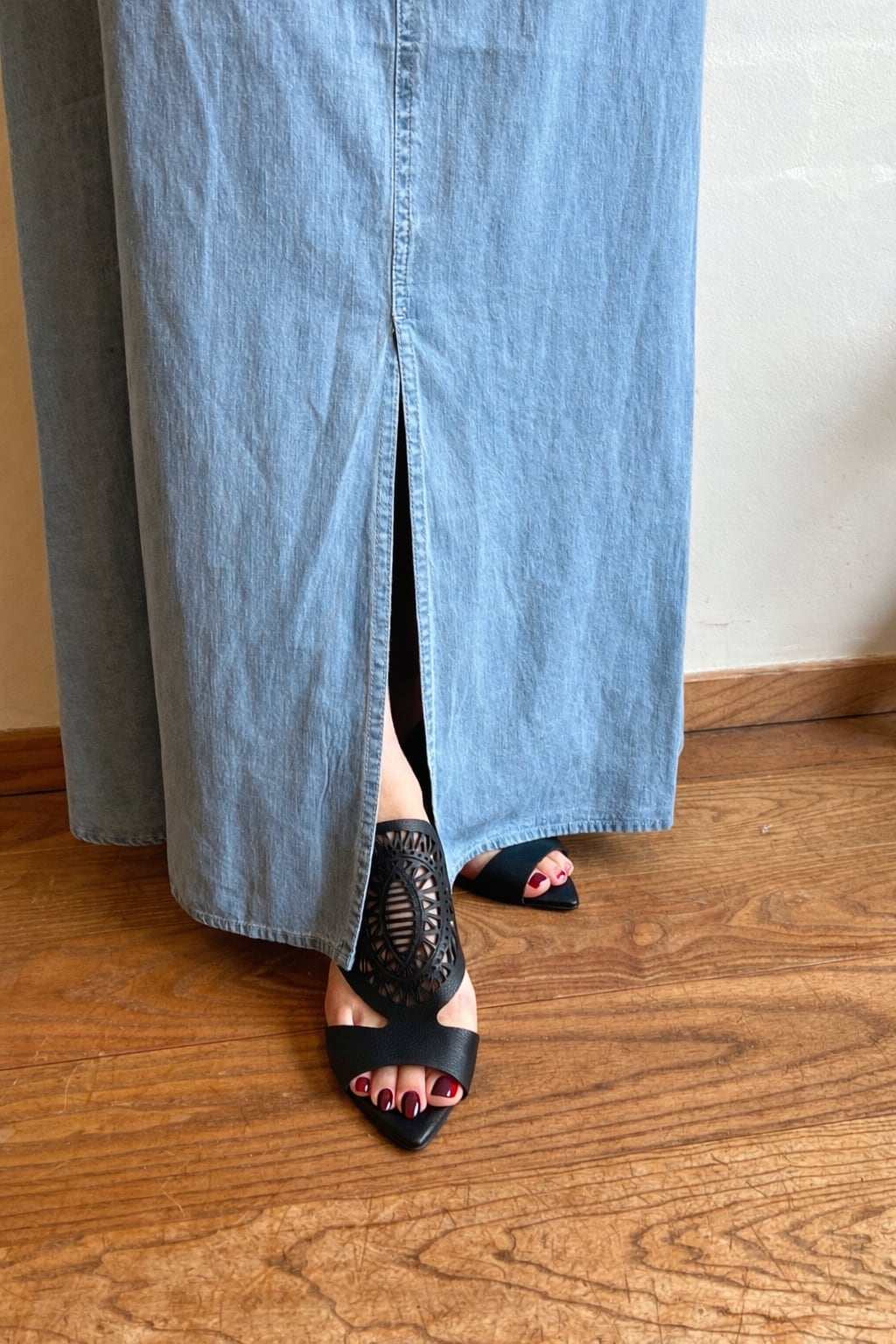 SOLD OUT 軽やかさと品の良さを両立した、大人のサマースタイル。カジュアルなデニムに合わせると、足元で抜けと色気をプラスできる。ヒールのデザインが“ただのカジュアル”で終わらせない。