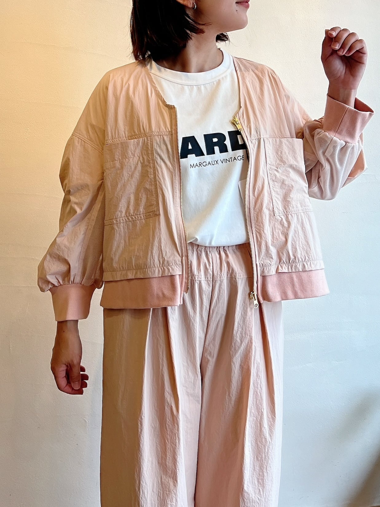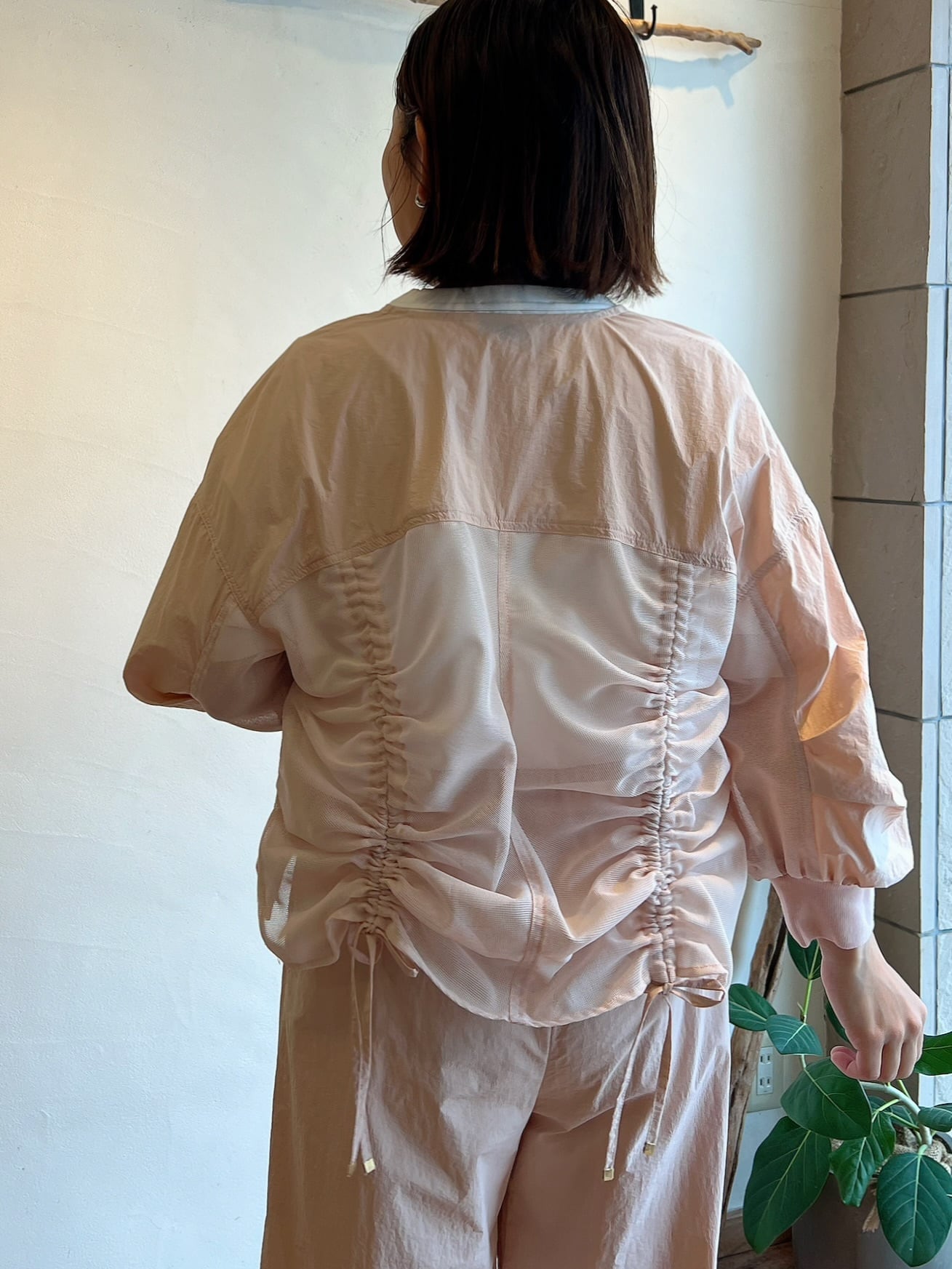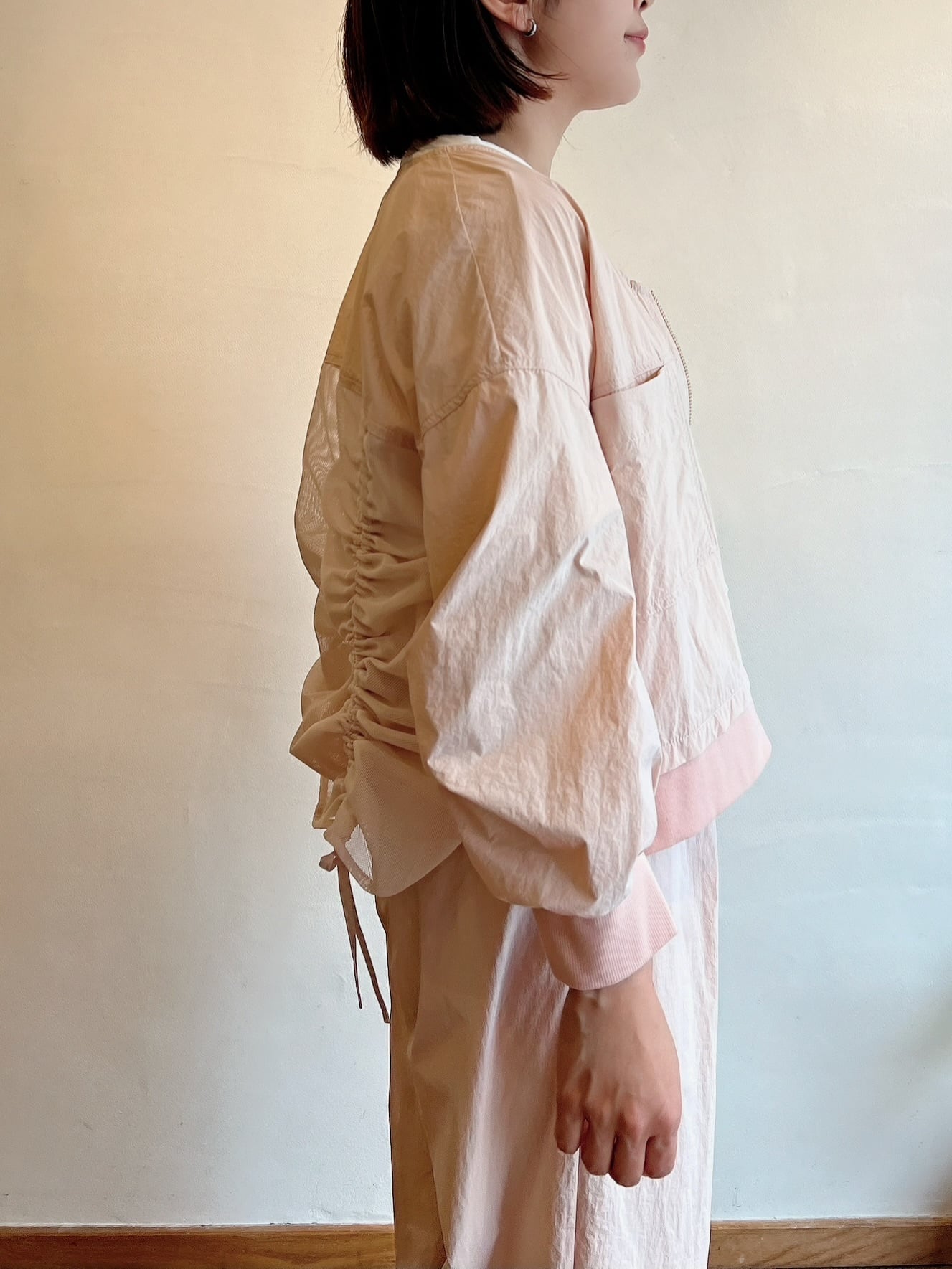 ナチュラルな風合いと軽やかさが魅力のノーカラーブルゾン。フロントはV開きで顔まわりをすっきり見せつつ、バックに施されたギャザーデザインが立体感のあるシルエットを生み出します。袖口と裾はリブ仕様で着心地の良さも兼ね備えています。軽く羽織るだけでコーディネートに動きが出るため、シンプルなインナー合わせでスタイリングが完成します。