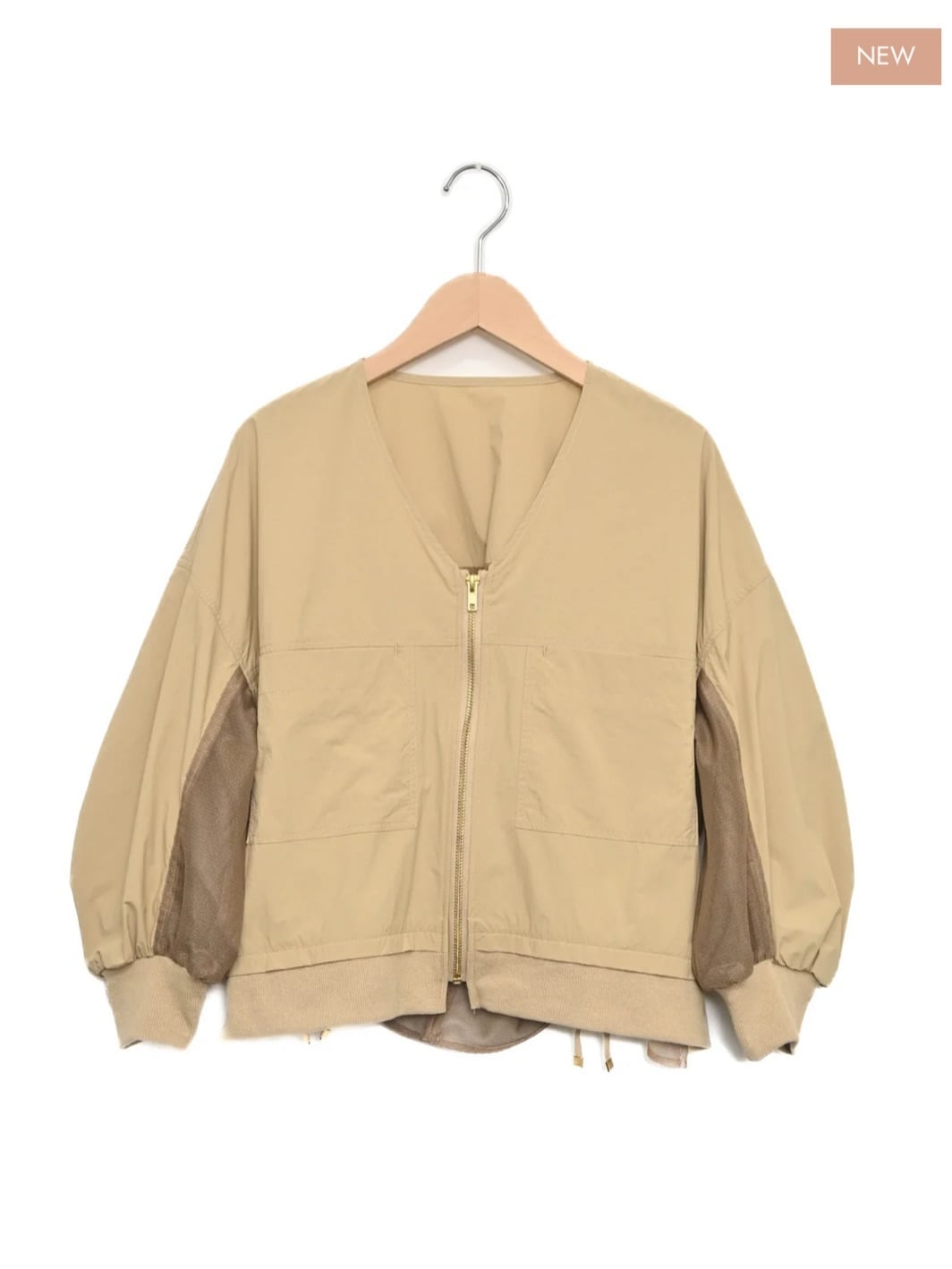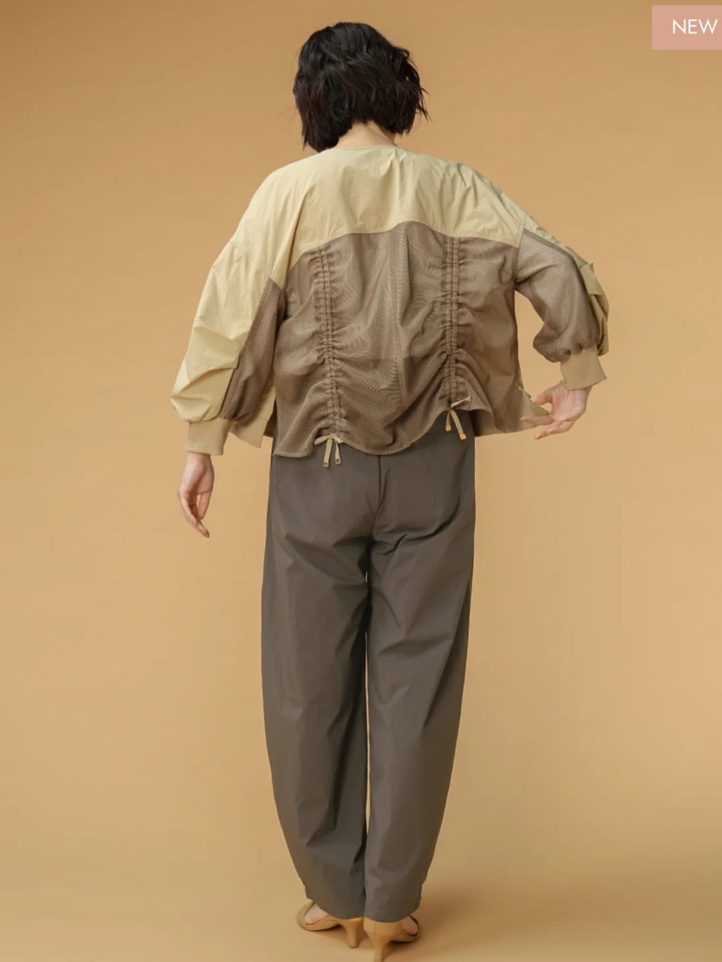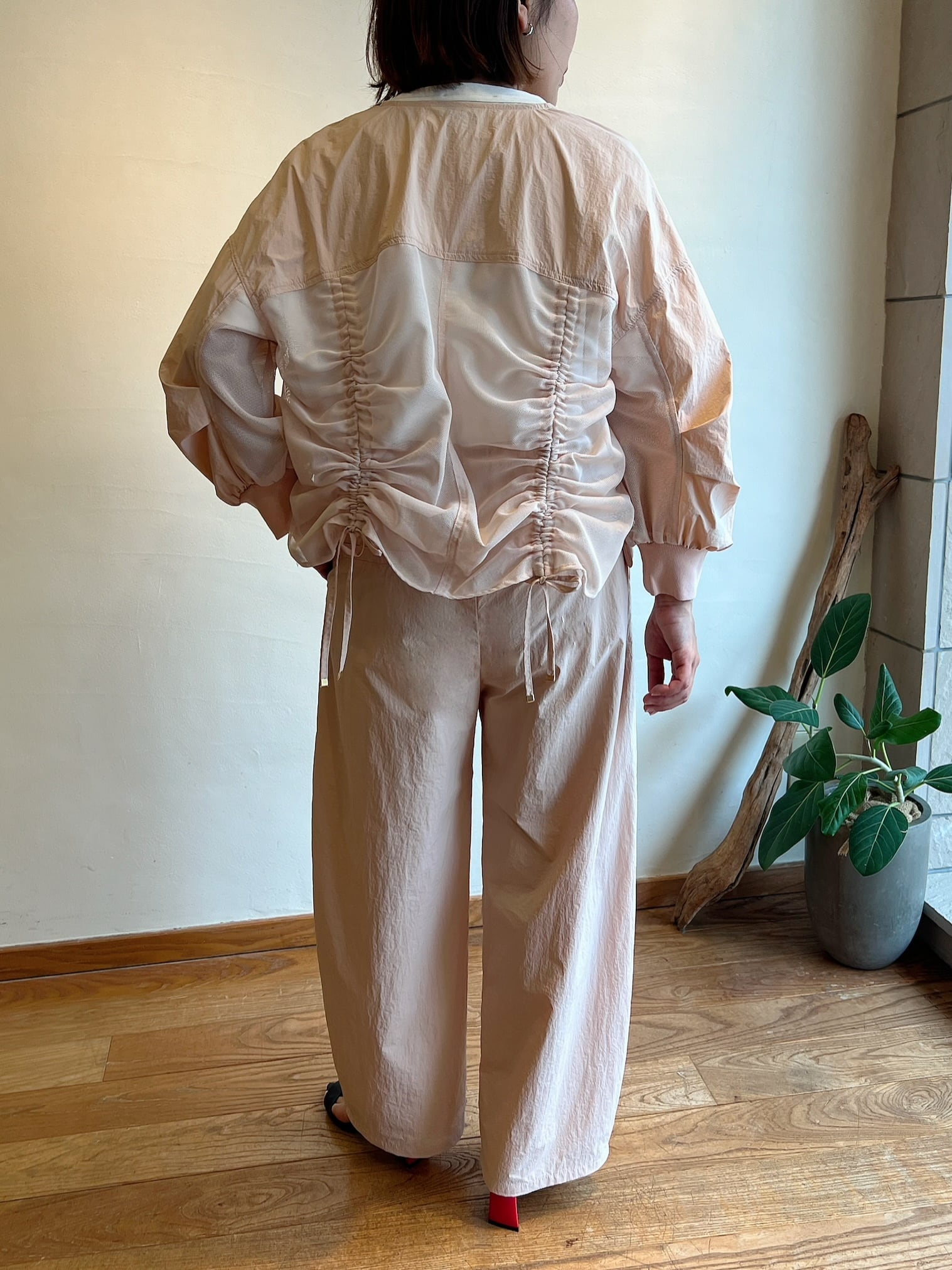 ナチュラルな風合いと軽やかさが魅力のノーカラーブルゾン。フロントはV開きで顔まわりをすっきり見せつつ、バックに施されたギャザーデザインが立体感のあるシルエットを生み出します。袖口と裾はリブ仕様で着心地の良さも兼ね備えています。軽く羽織るだけでコーディネートに動きが出るため、シンプルなインナー合わせでスタイリングが完成します。