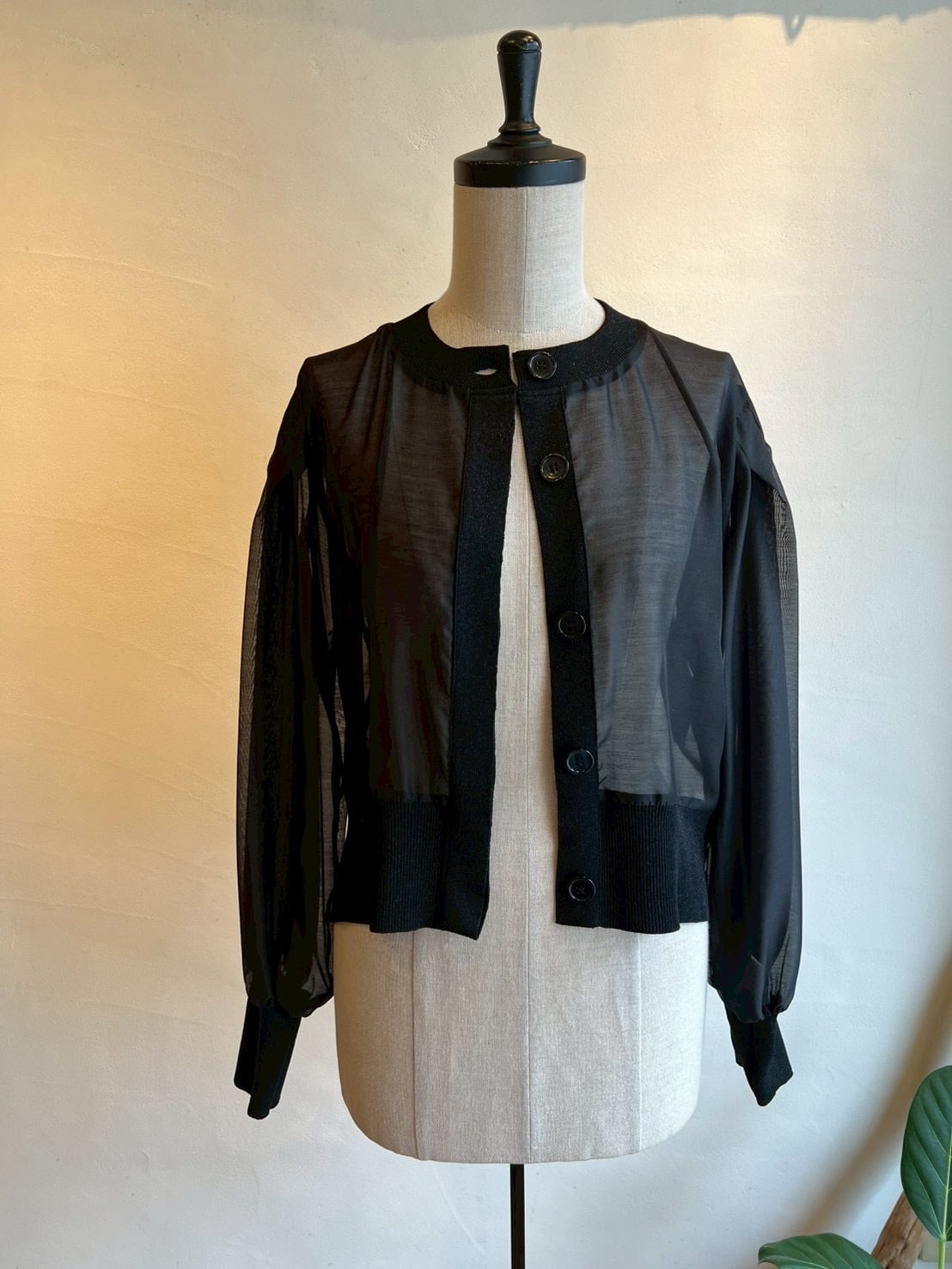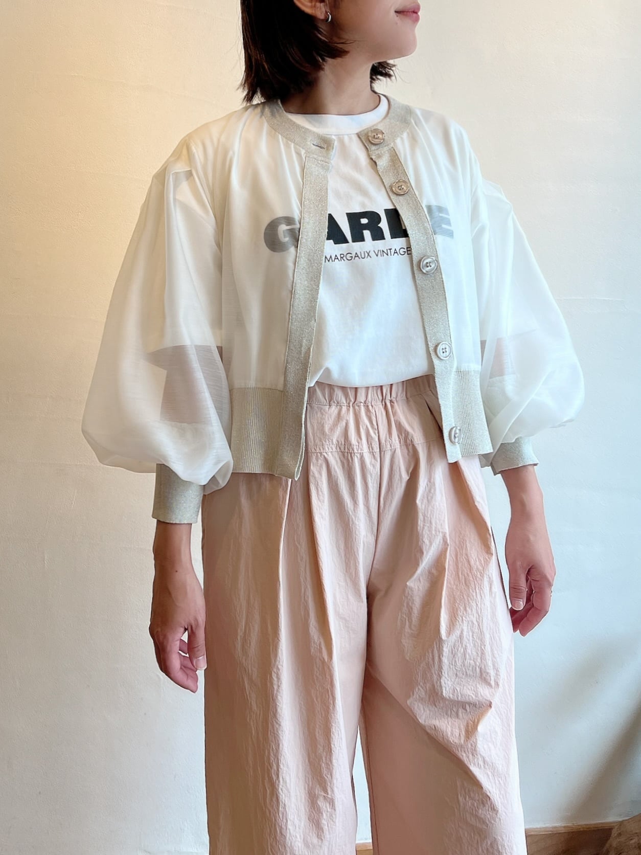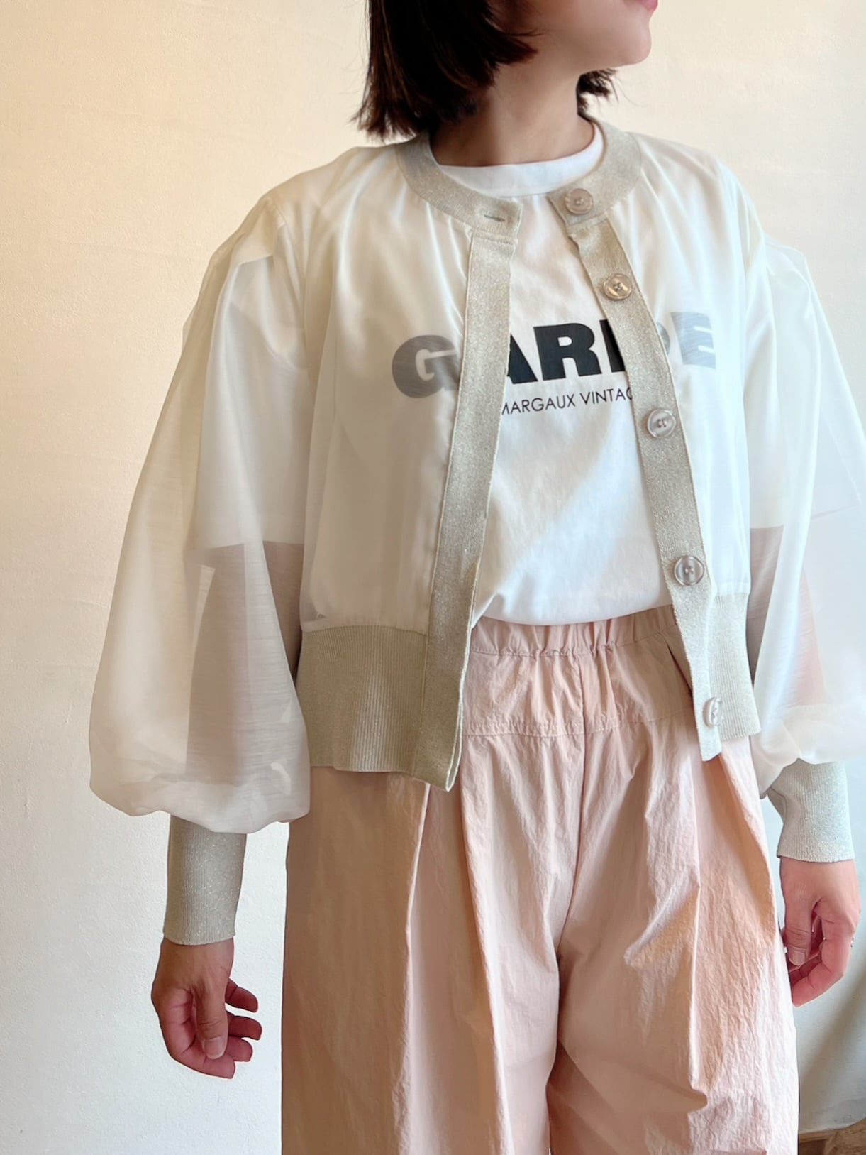 シアーとニットの切替がお洒落なカーディガン。カーディガンですが身体にフィットせずジャケットの様な着やすさがあります。ニット部分はラメニットになっており、華やかさをだしてくれます。シアーとラメニットの切替がお洒落に女性らしくコーディネートに上品さと奥行きを与えてくれます。