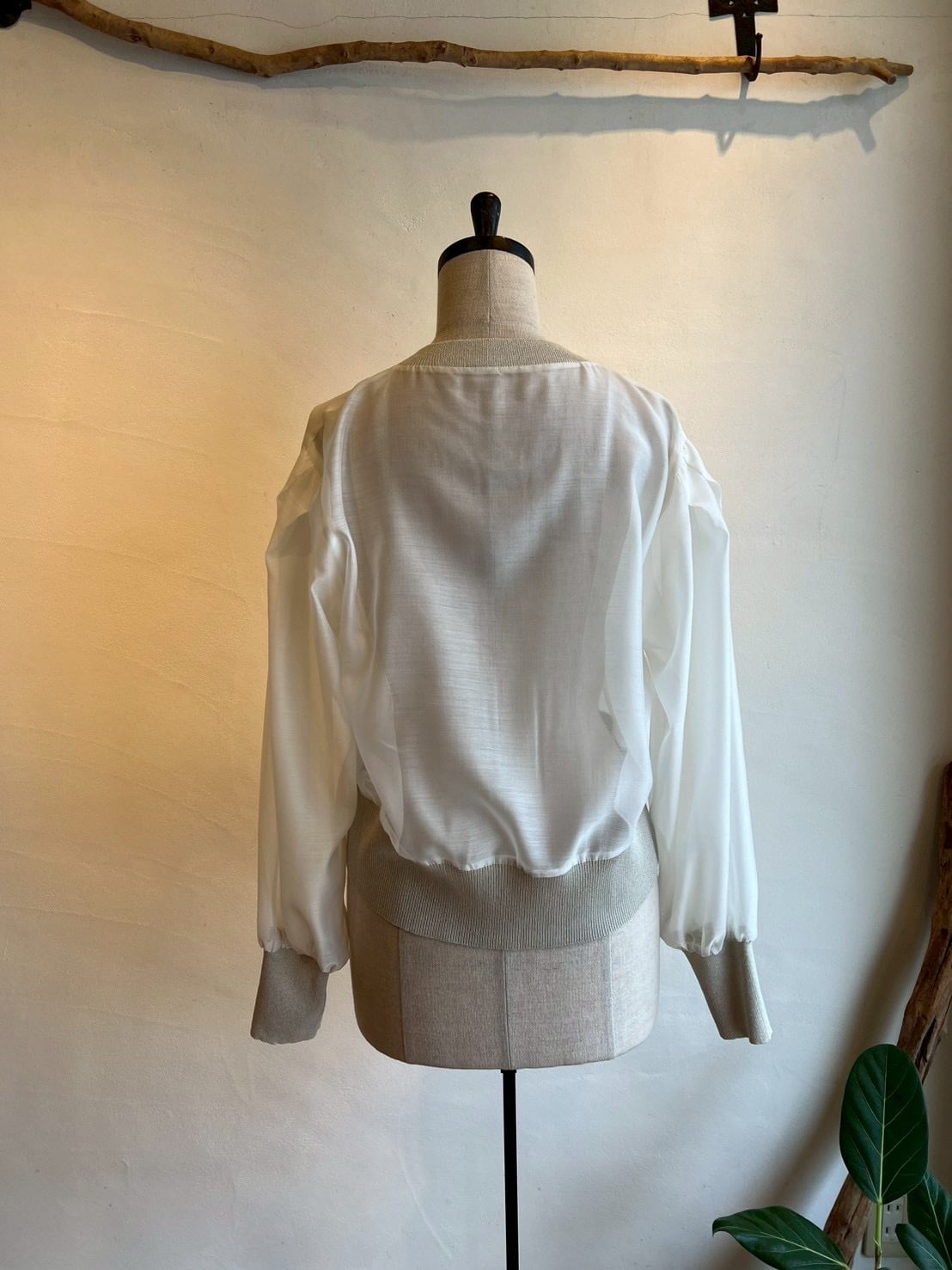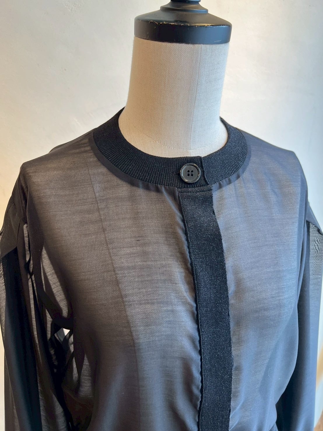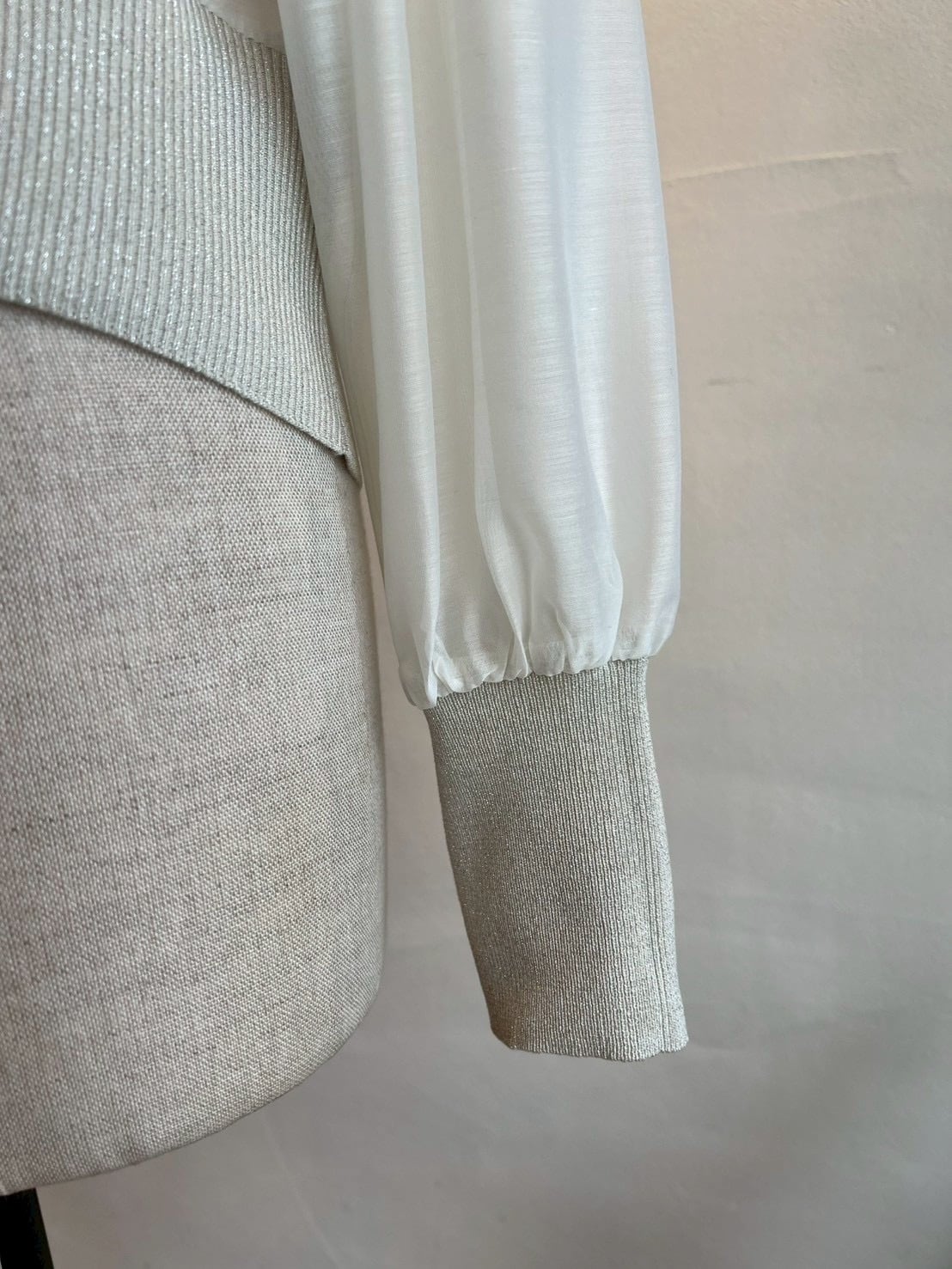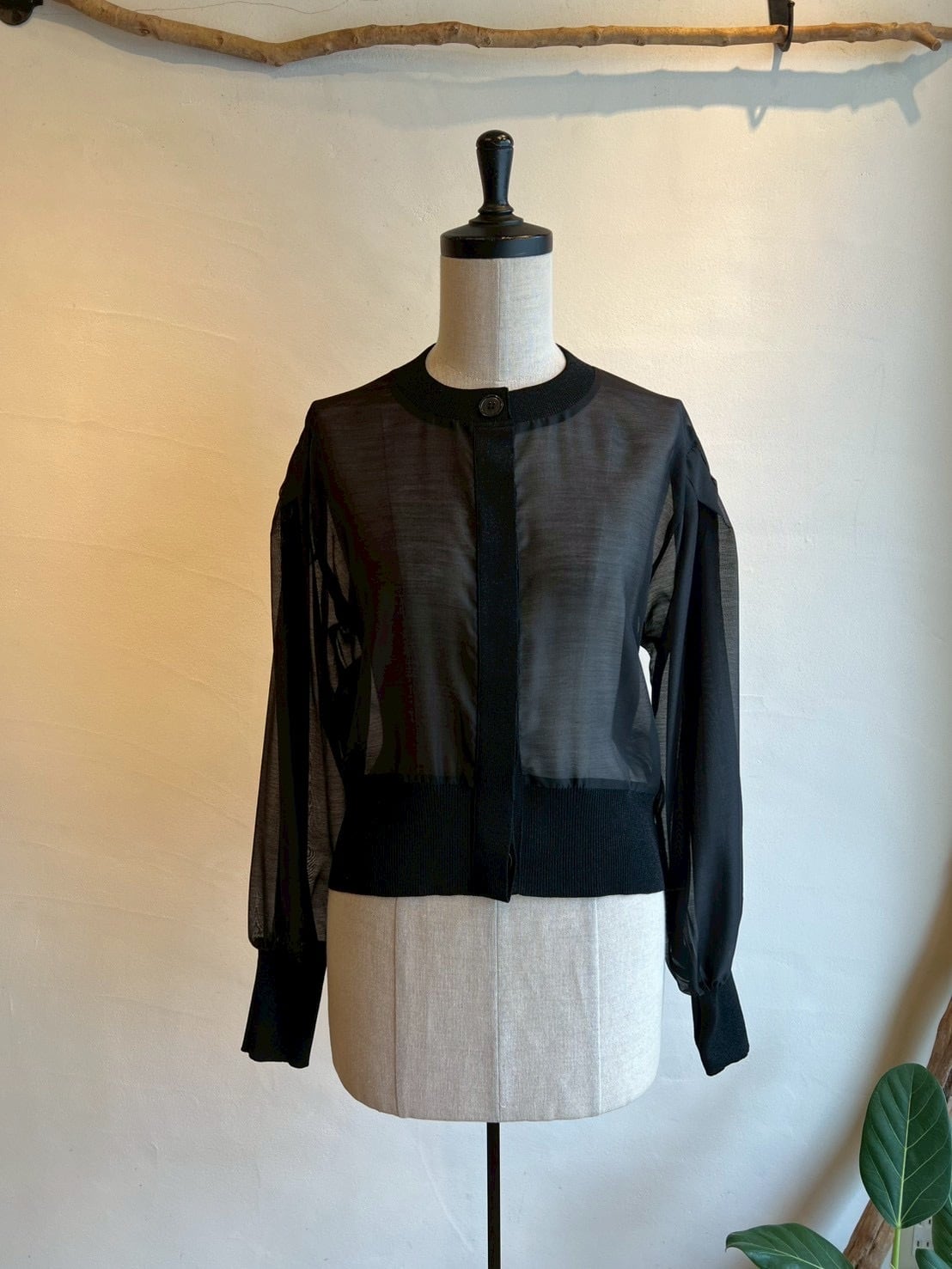 シアーとニットの切替がお洒落なカーディガン。カーディガンですが身体にフィットせずジャケットの様な着やすさがあります。ニット部分はラメニットになっており、華やかさをだしてくれます。シアーとラメニットの切替がお洒落に女性らしくコーディネートに上品さと奥行きを与えてくれます。