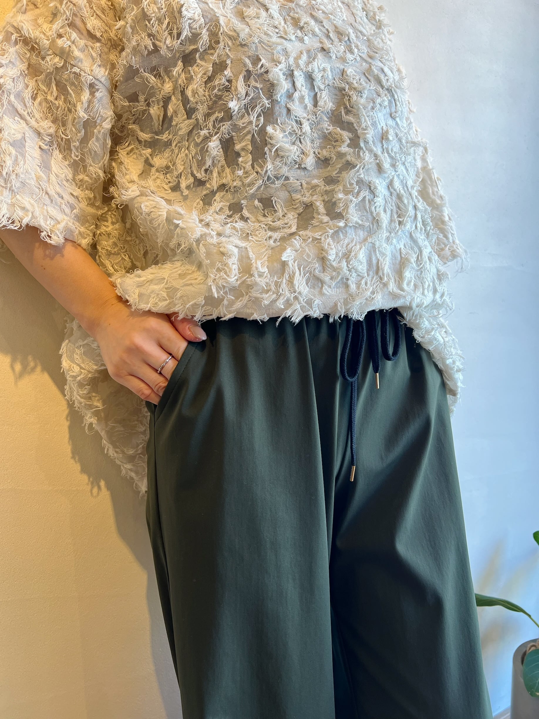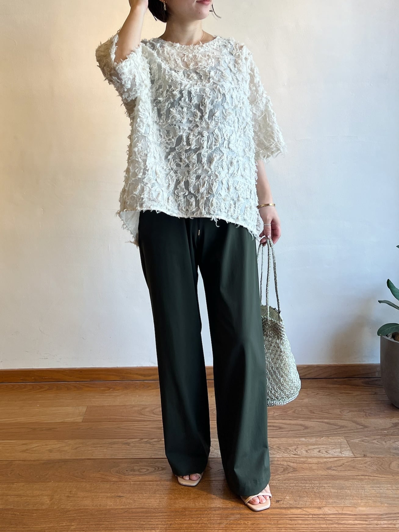 更に今年は接触冷感・UVカット・吸放湿の多機能ハイテンション生地で作りました。ウエストはゴム使用で、リラックスして着用しながらスタイルアップ効果もある美シルエットパンツ。こだわりのワイドシルエットで、オフィススタイルにもカジュアルにも馴染む着回しのきく一枚です。