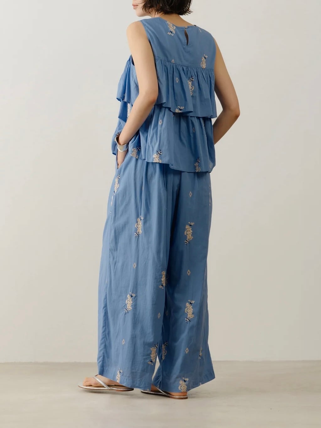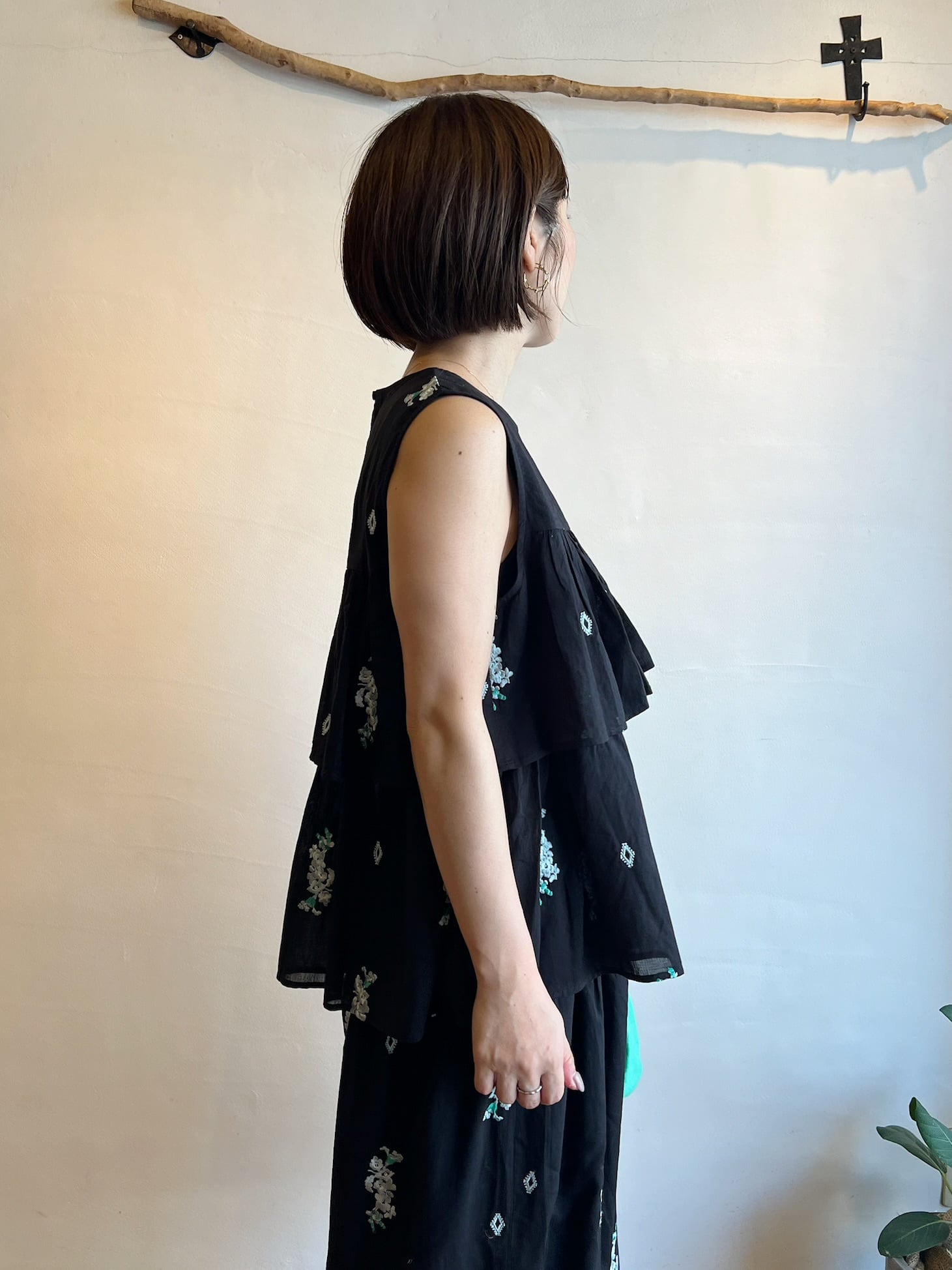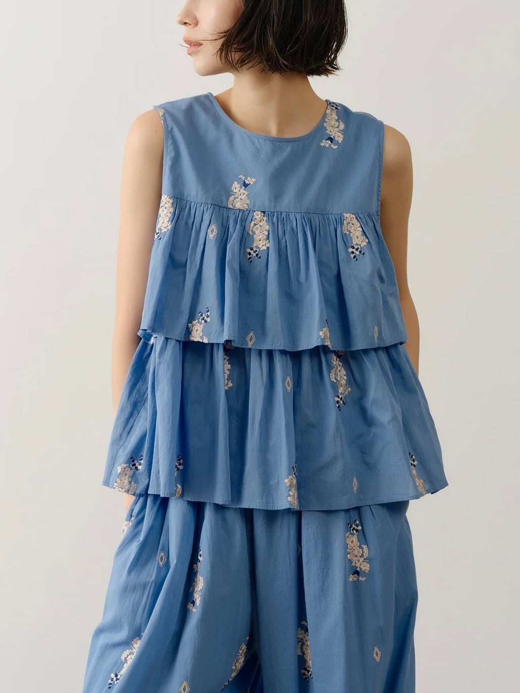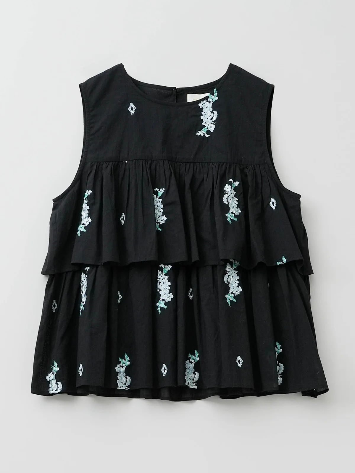 Top香り立つような艶のあるジャスミンの花穂を刺繍したやわらかなコットンボイルで仕立てたティアードブラウス。繊細なギャザーが優しいムードです。後ろはボタン一つで留めるつくり。