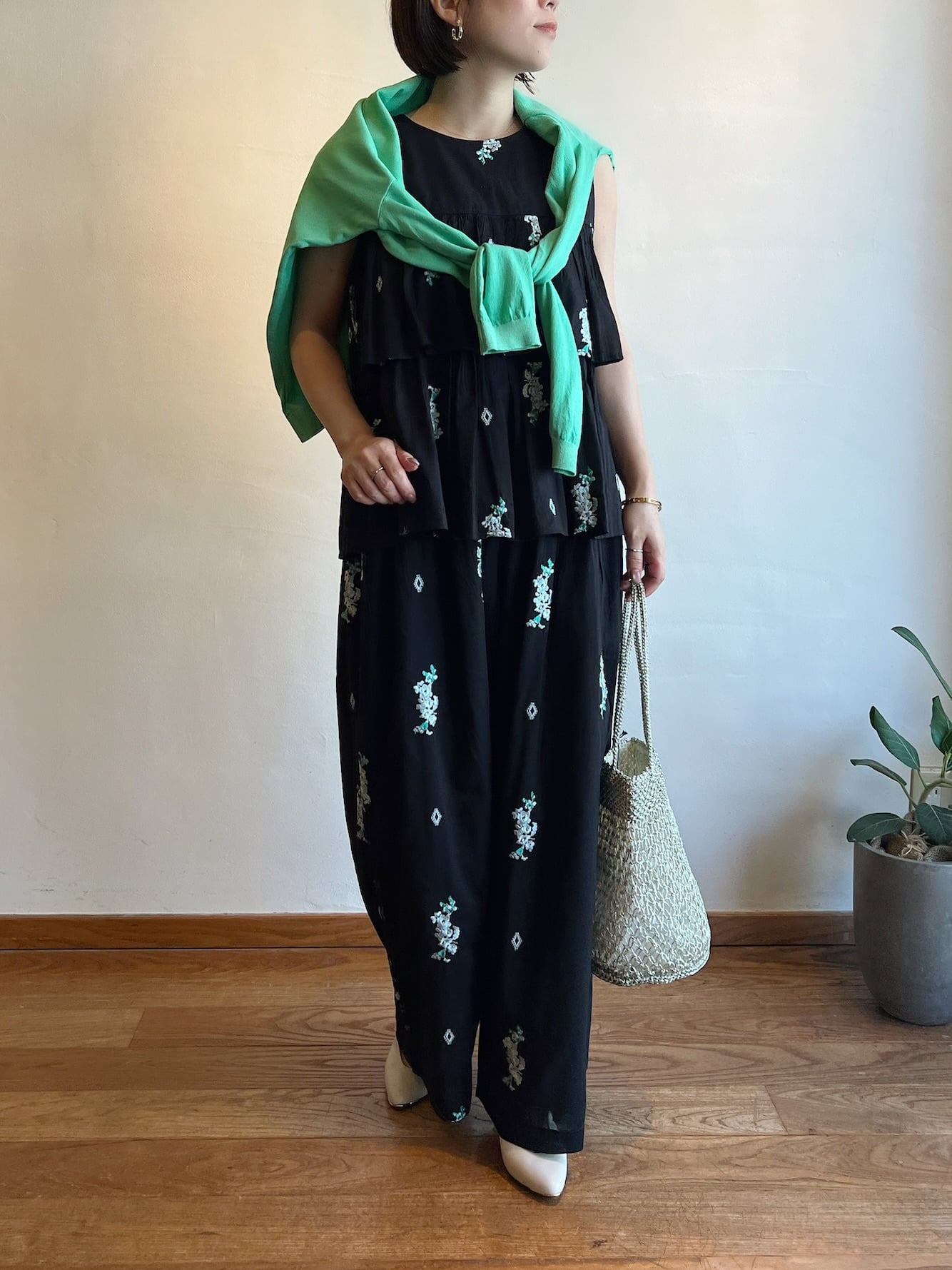 同じテキスタイルのパンツと合わせてオールインワンのように着ても素敵です。