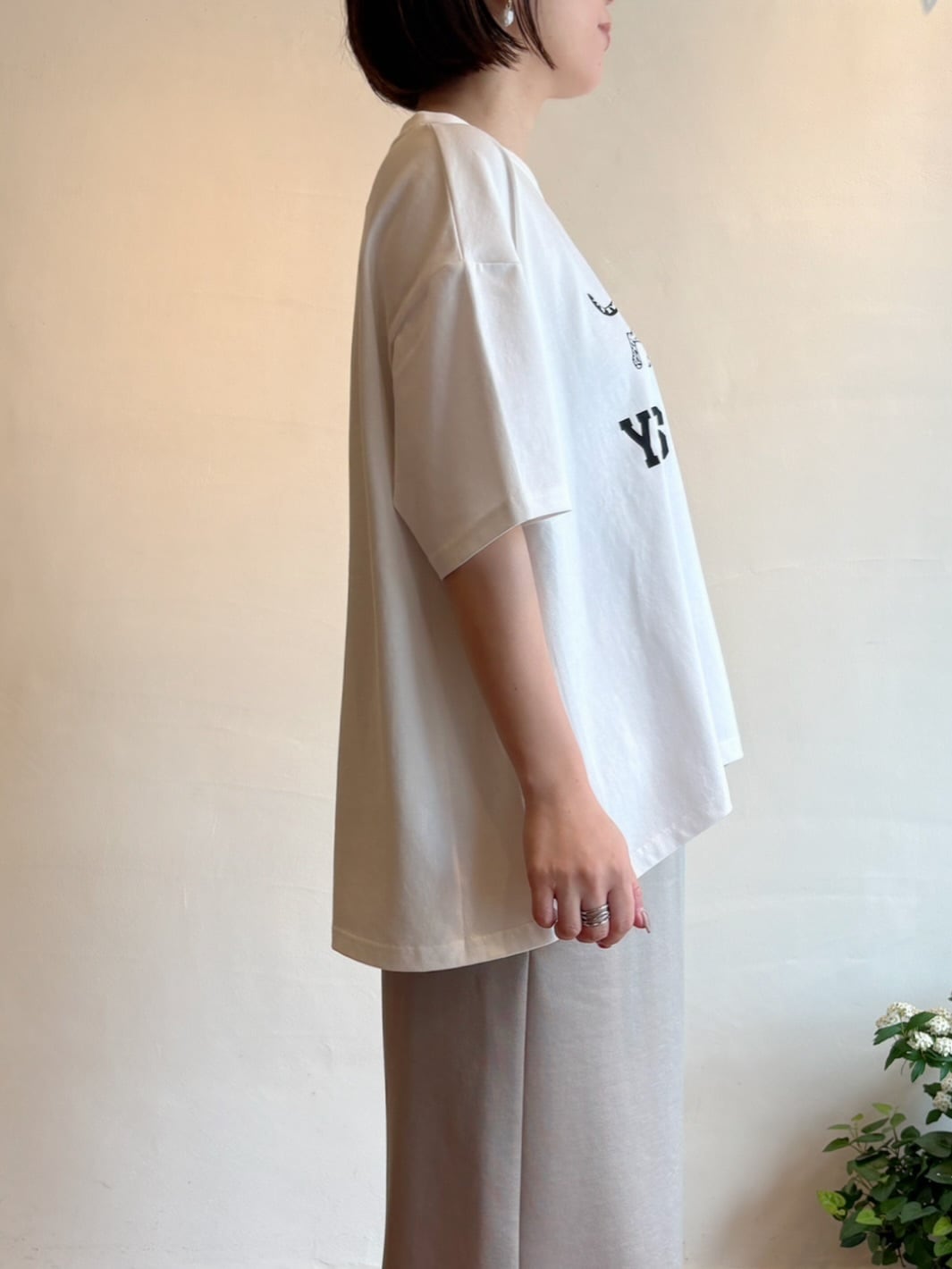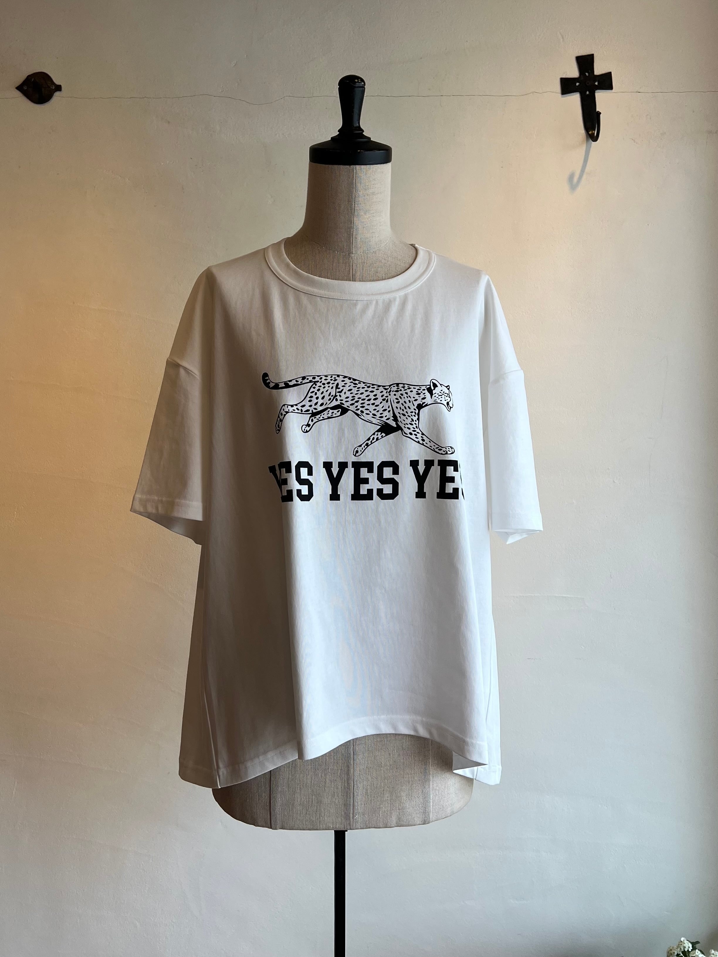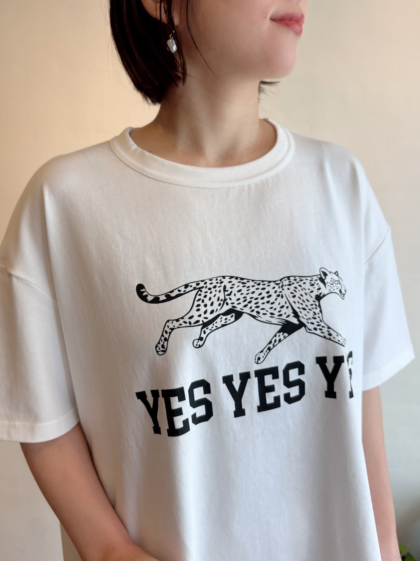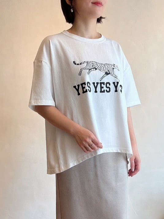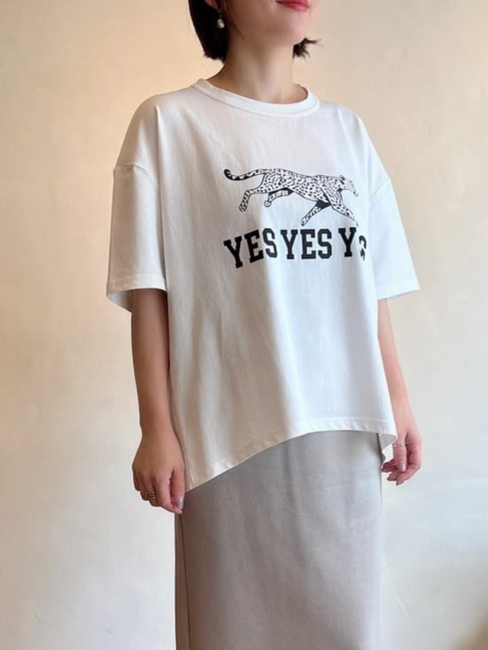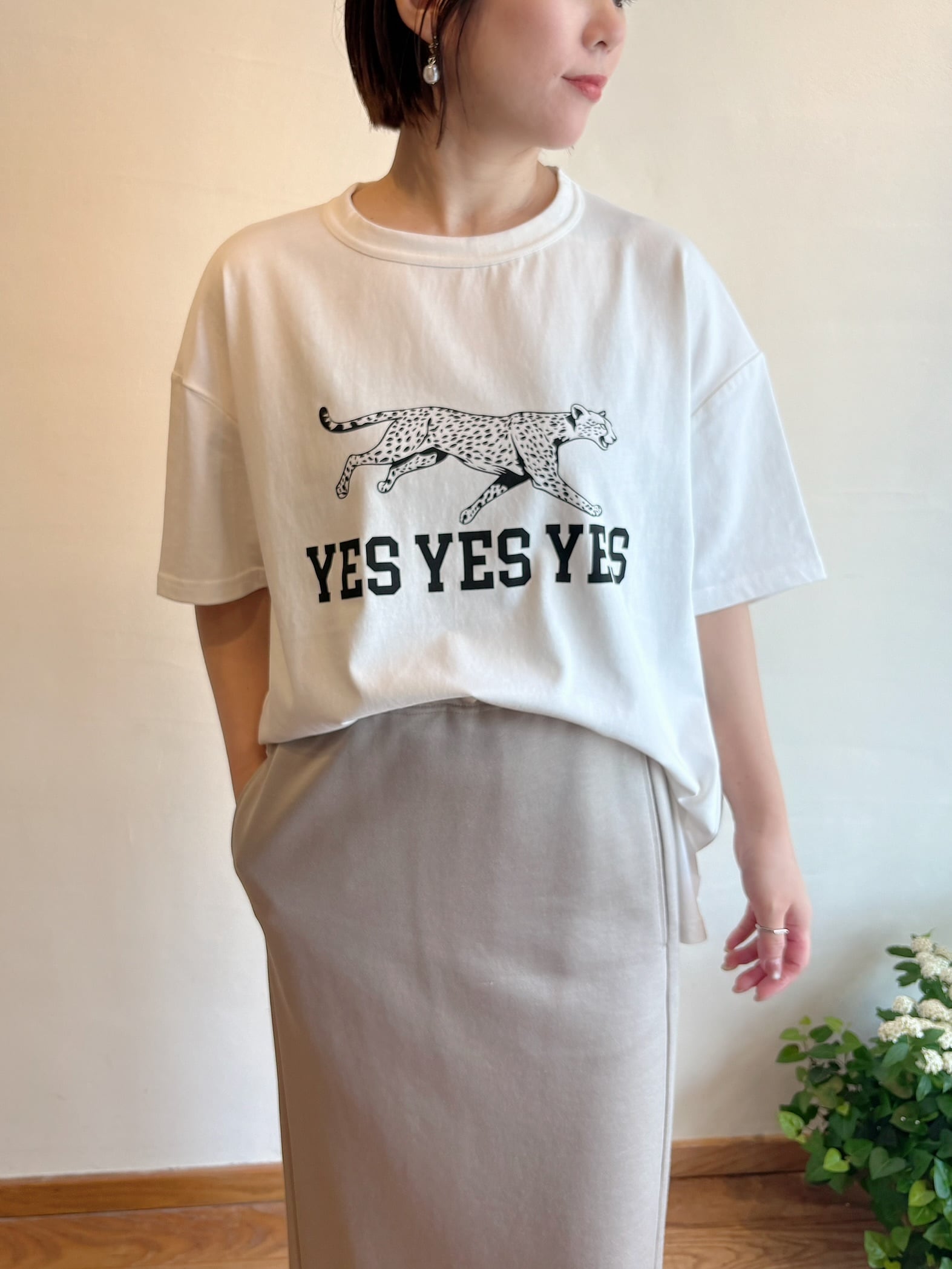 ゆったりとしたシルエットで、リラックス感がありながらもスタイリッシュな印象を与えます。胸元に施された「YESYESYES」のメッセージがコーディネートのアクセントに、カジュアルなスタイルから、少しキレイ目なコーディネートまで幅広く活躍できる一着です。