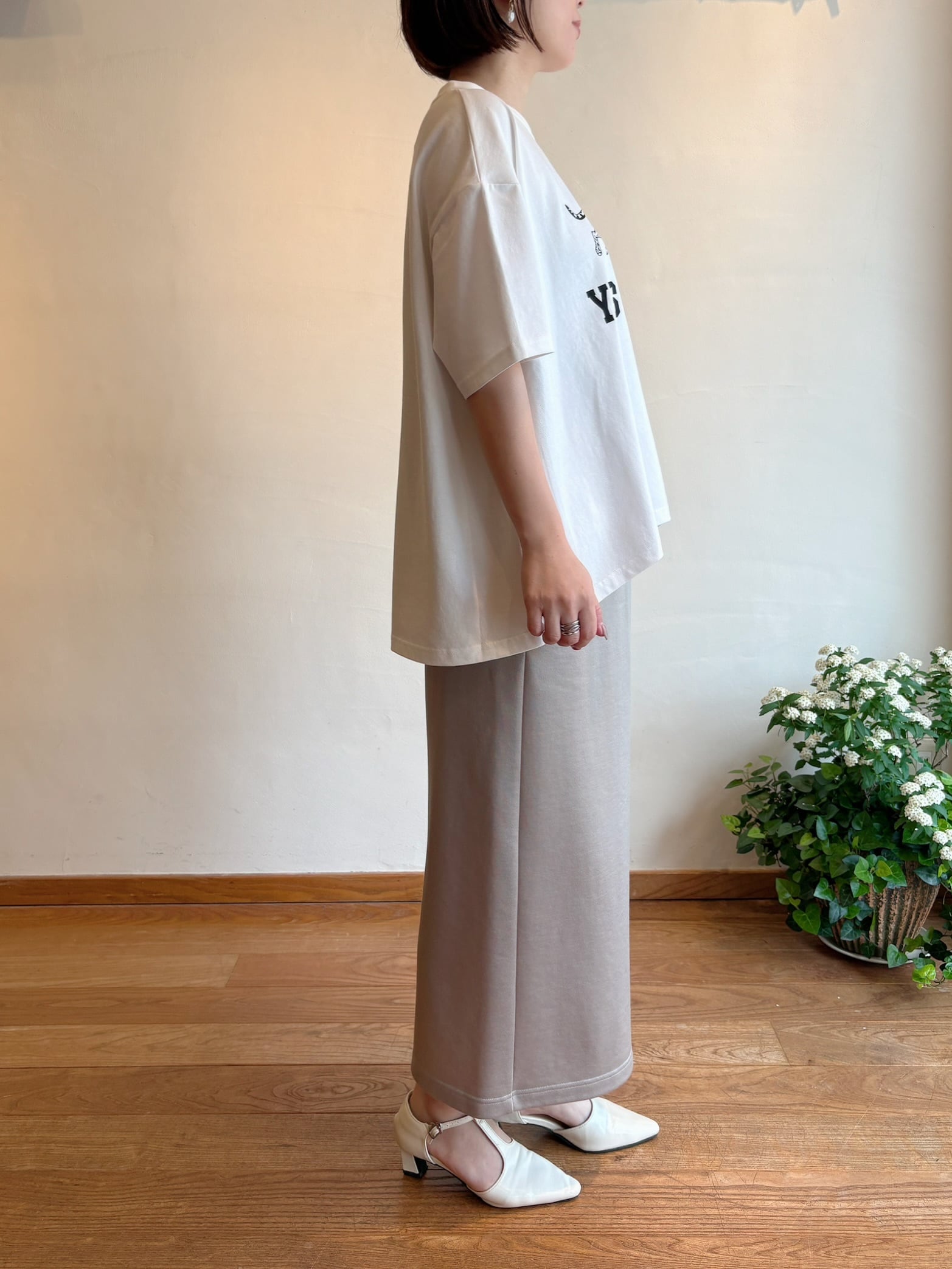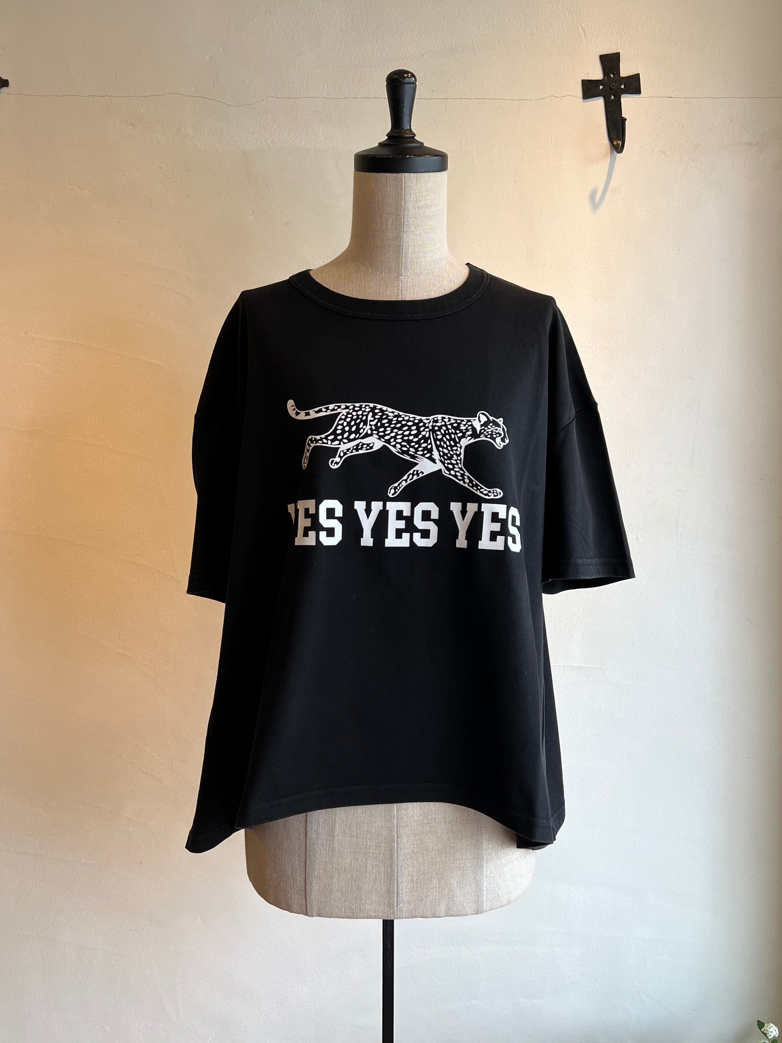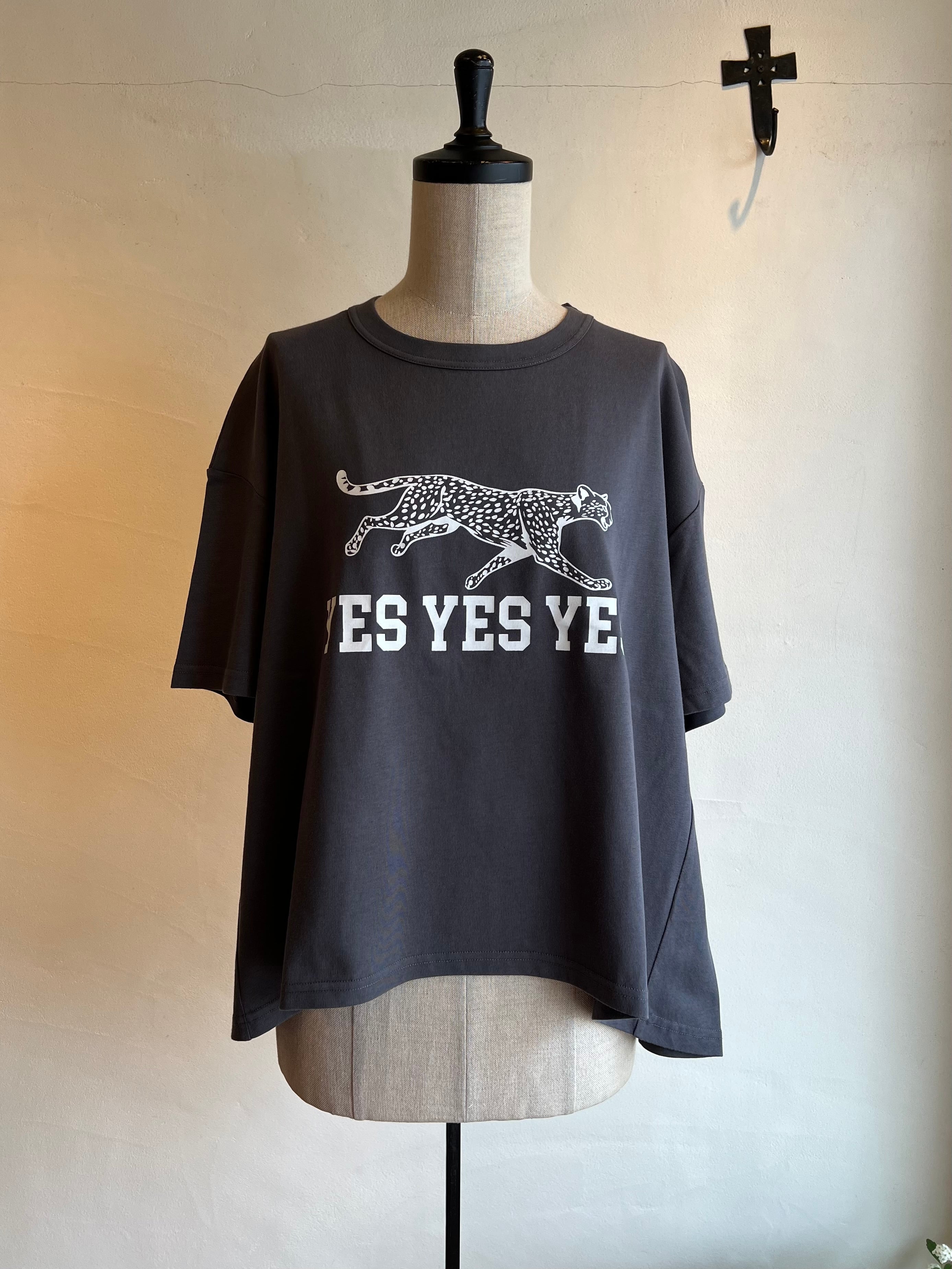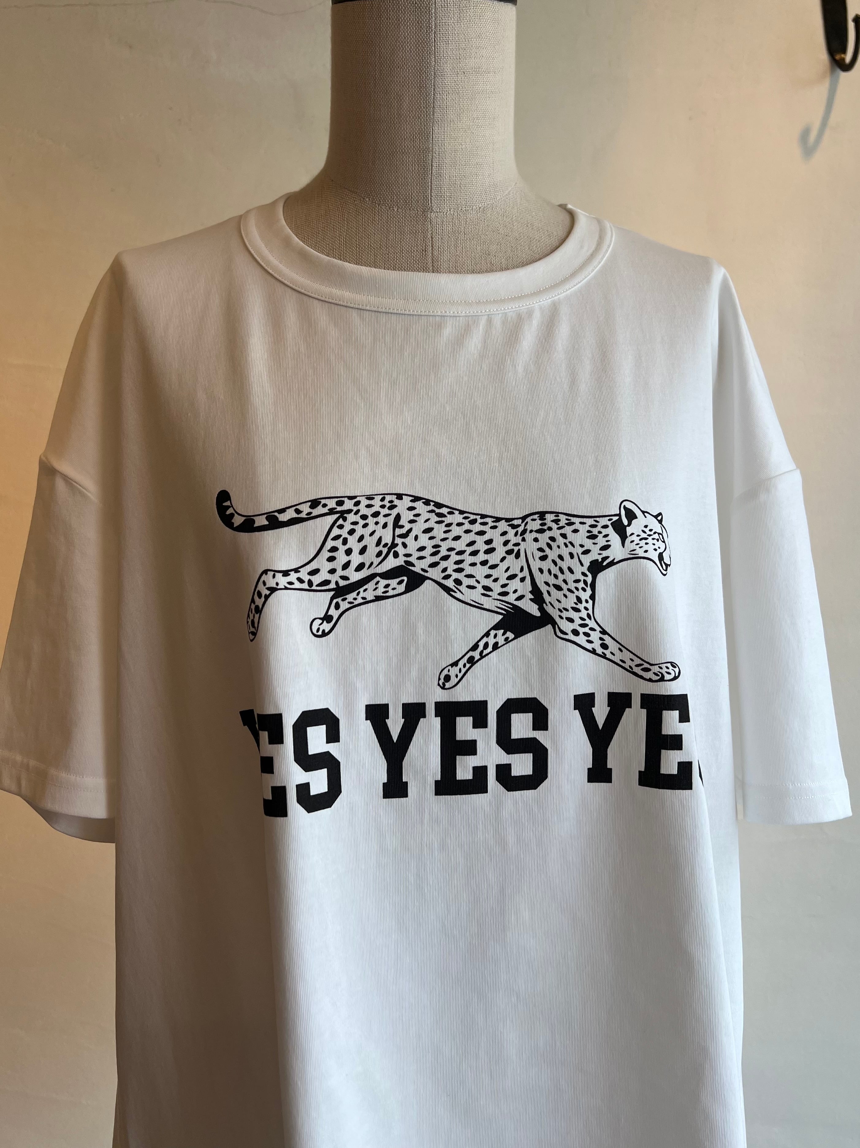ゆったりとしたシルエットで、リラックス感がありながらもスタイリッシュな印象を与えます。胸元に施された「YESYESYES」のメッセージがコーディネートのアクセントに、カジュアルなスタイルから、少しキレイ目なコーディネートまで幅広く活躍できる一着です。