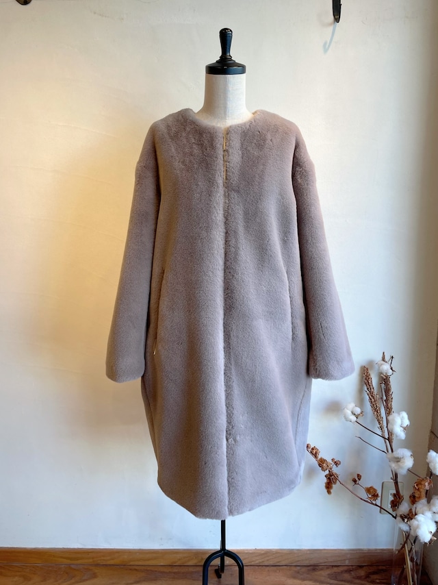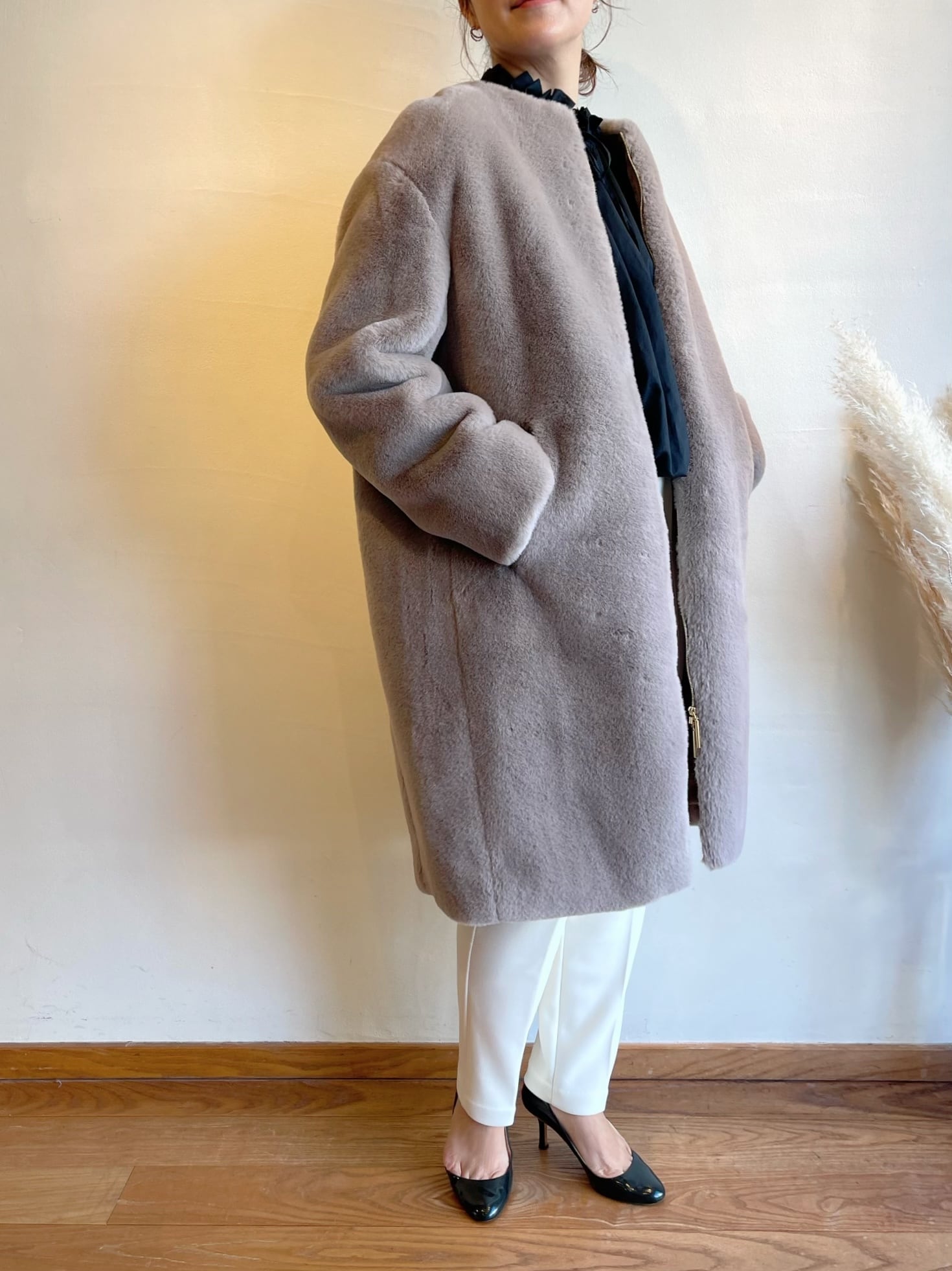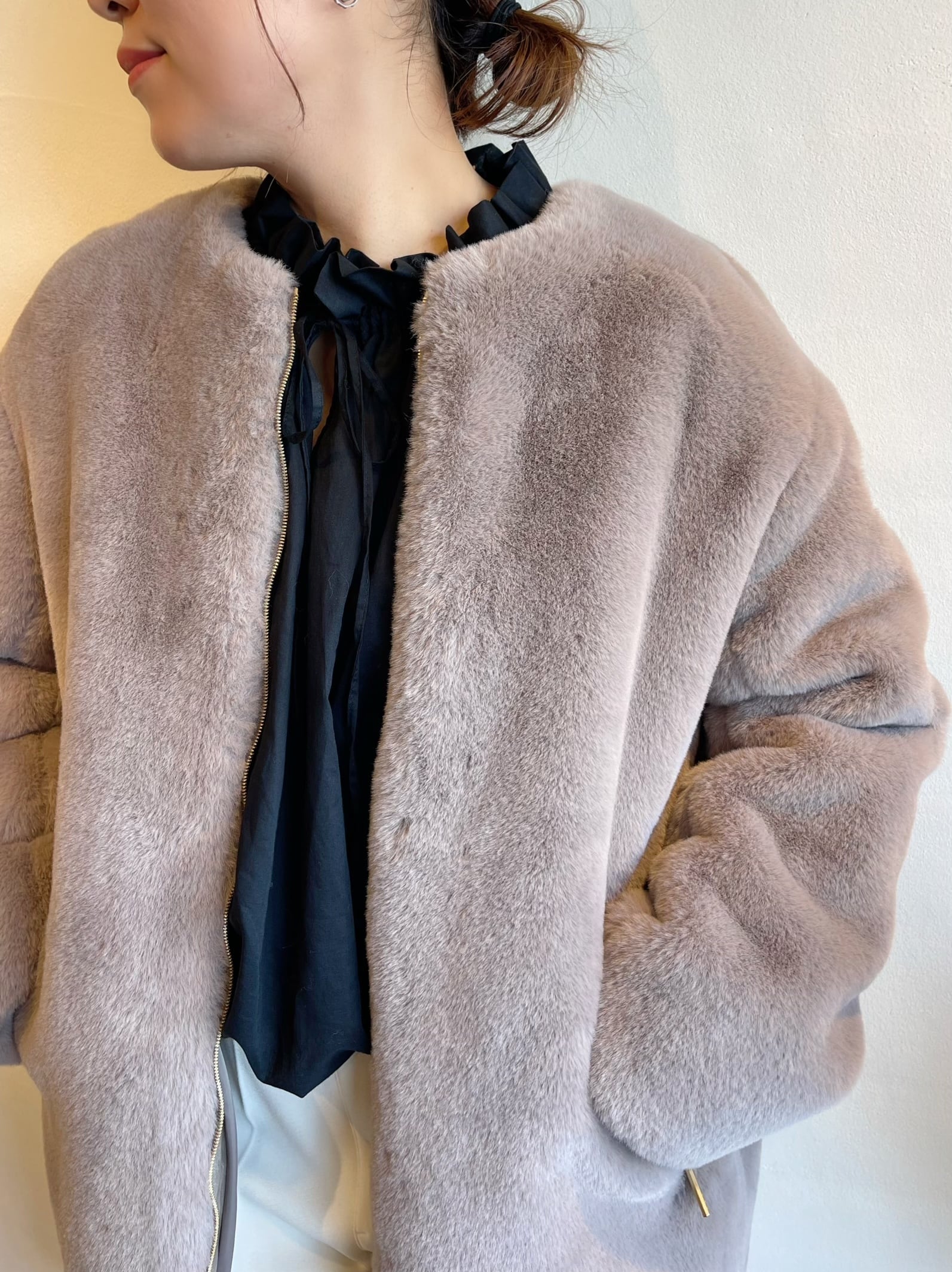 ストンと落ちるストレートなラインと肩を落としたデザインで、すっきりと上品に着こなしていただけるアイテム。ポリエステル糸を使用したラビットファー調の素材は、発色の良さと繊細なタッチが特徴。昨シーズンよりボリューム感もさらにアップし、贅沢な肌触り。