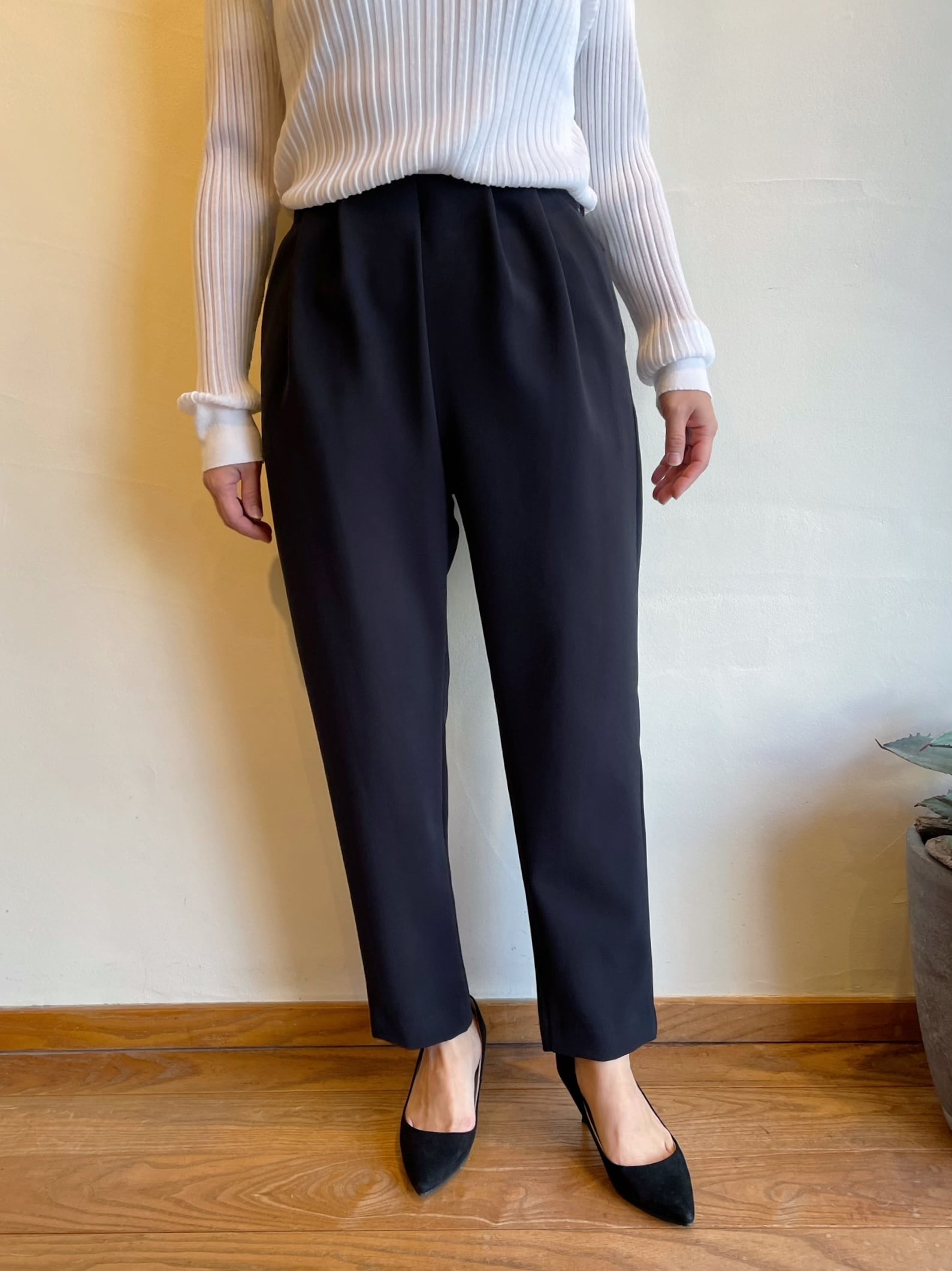 ウエストゴムを織り込んだ仕様で、全ゴムでストレスフリーな着心地ながら、タックパンツのようにきれい見えします。