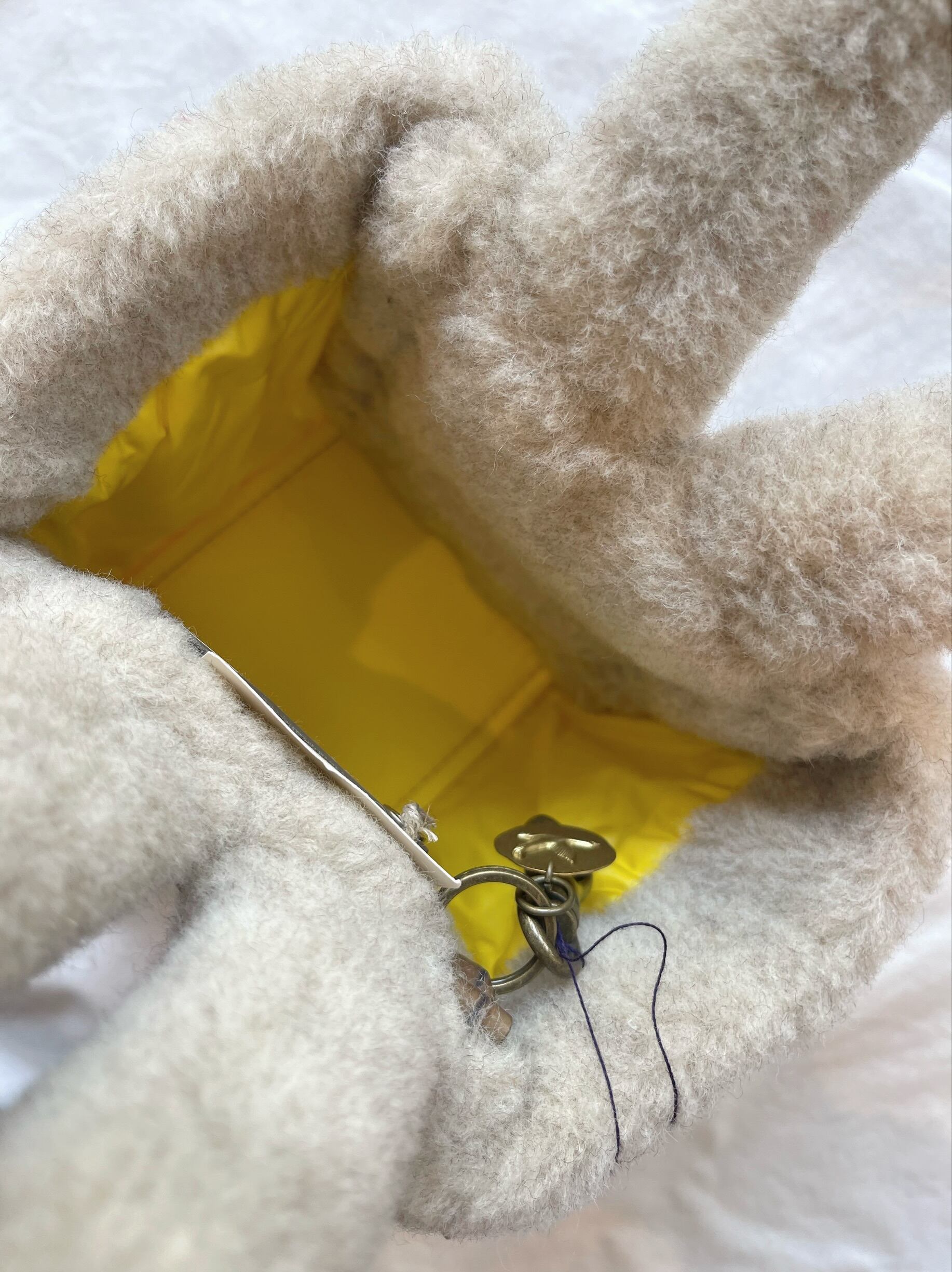 うさぎの耳のようなハンドを手首に入れて暖かいバッグです。