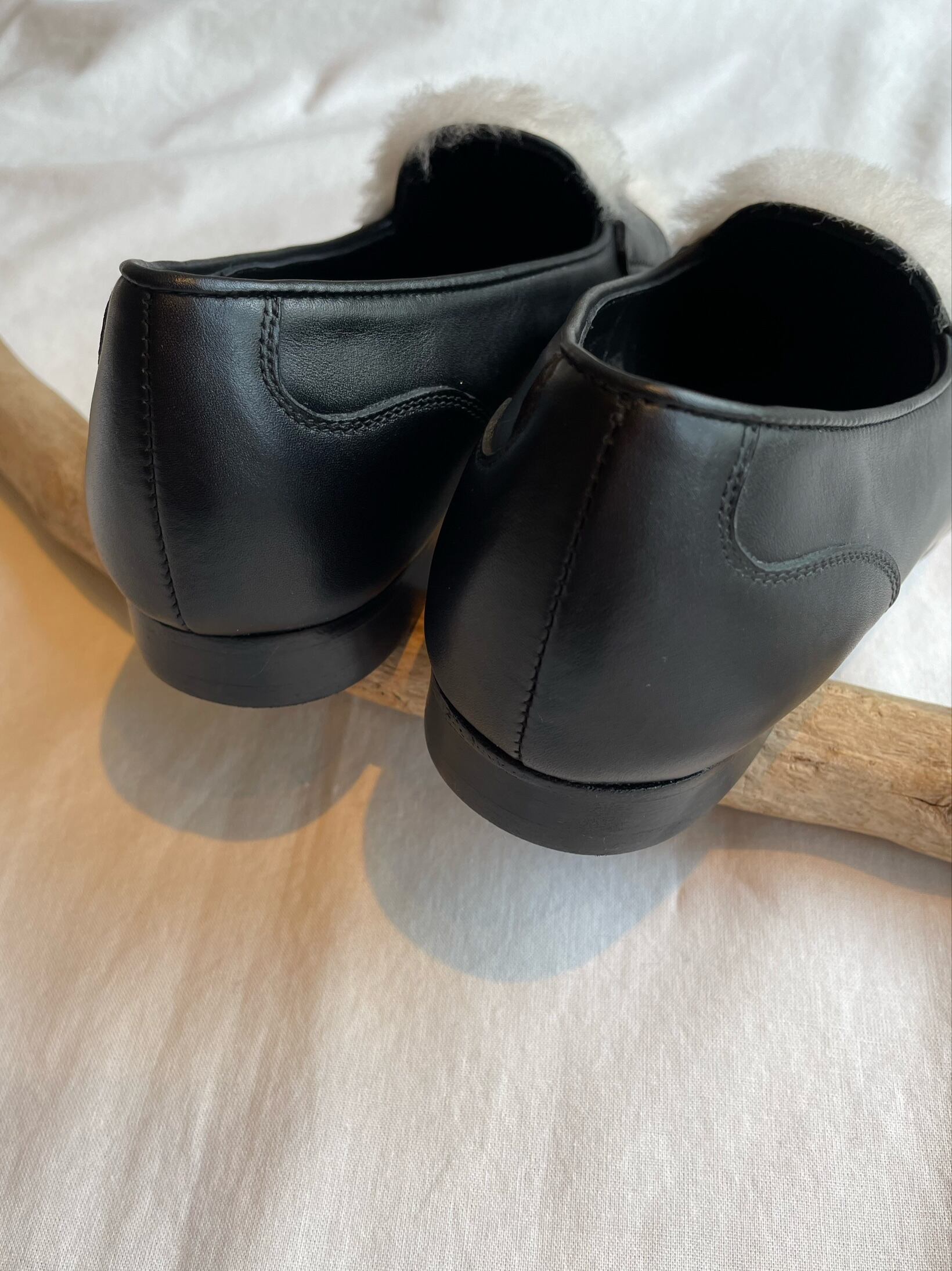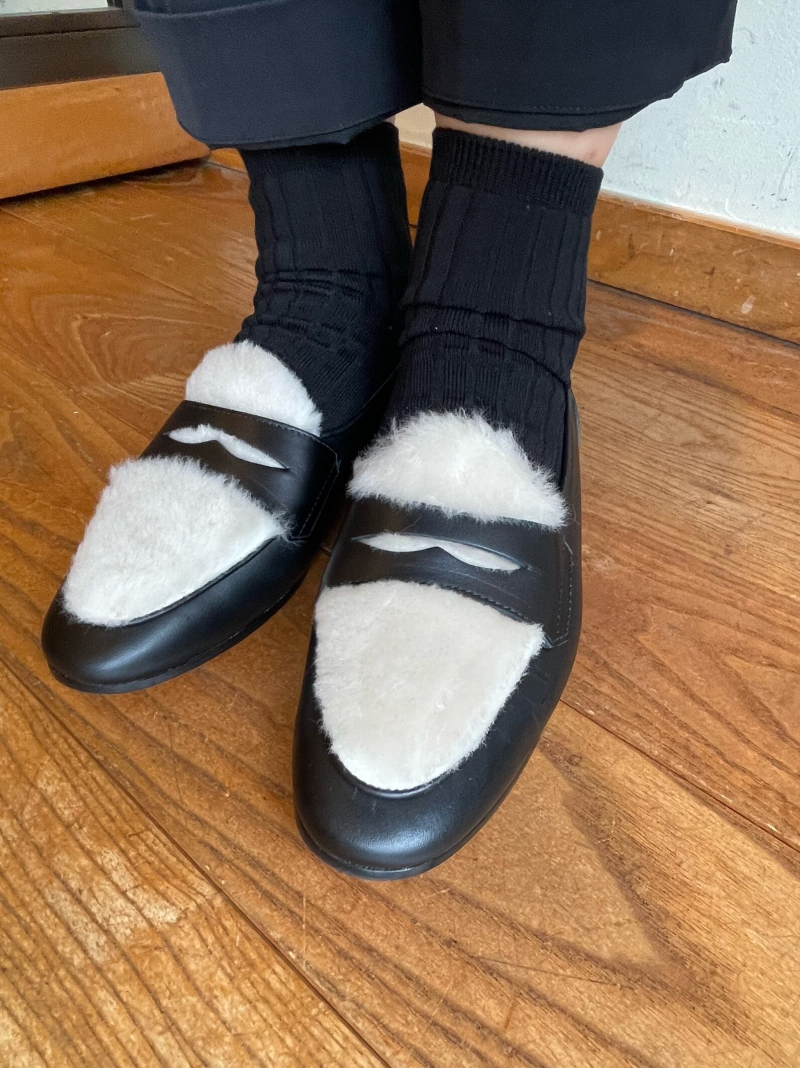 異素材使いが目を惹くコンビローファ-。あたたかみのある素材をボリューミーに部分使いしたデザイン。高品質なレザーを使用し足に優しい履き心地を提供します。毛皮部分は本物ムートンを使用、白黒の配色がモダンな印象に仕上げます。フォーマルからカジュアルまで幅広いスタイリングにマッチします。大人の女性にぴったりの一足。