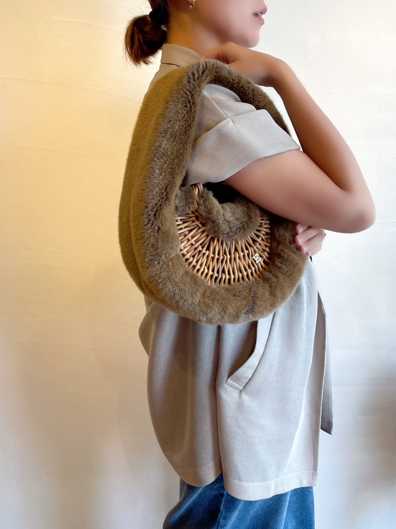 ファーの手を中に入れてハンドルとして持っていただくのもおすすめです。アクリル100%エコファーと紅籐の組み合わせです。