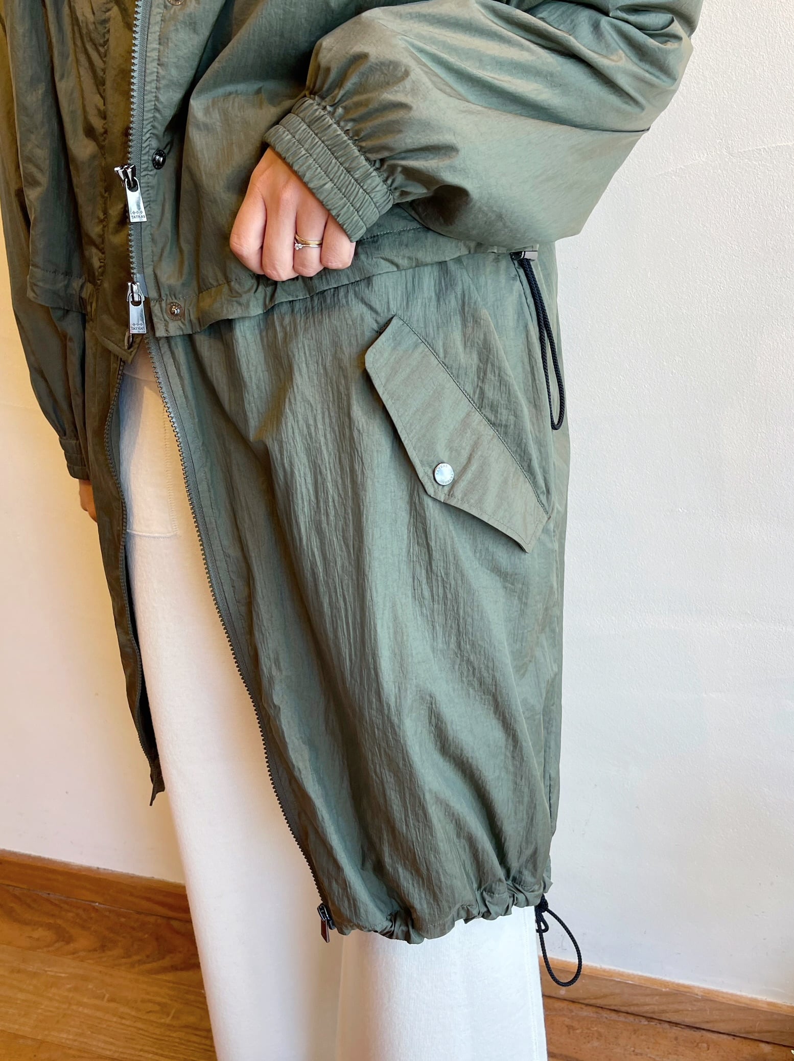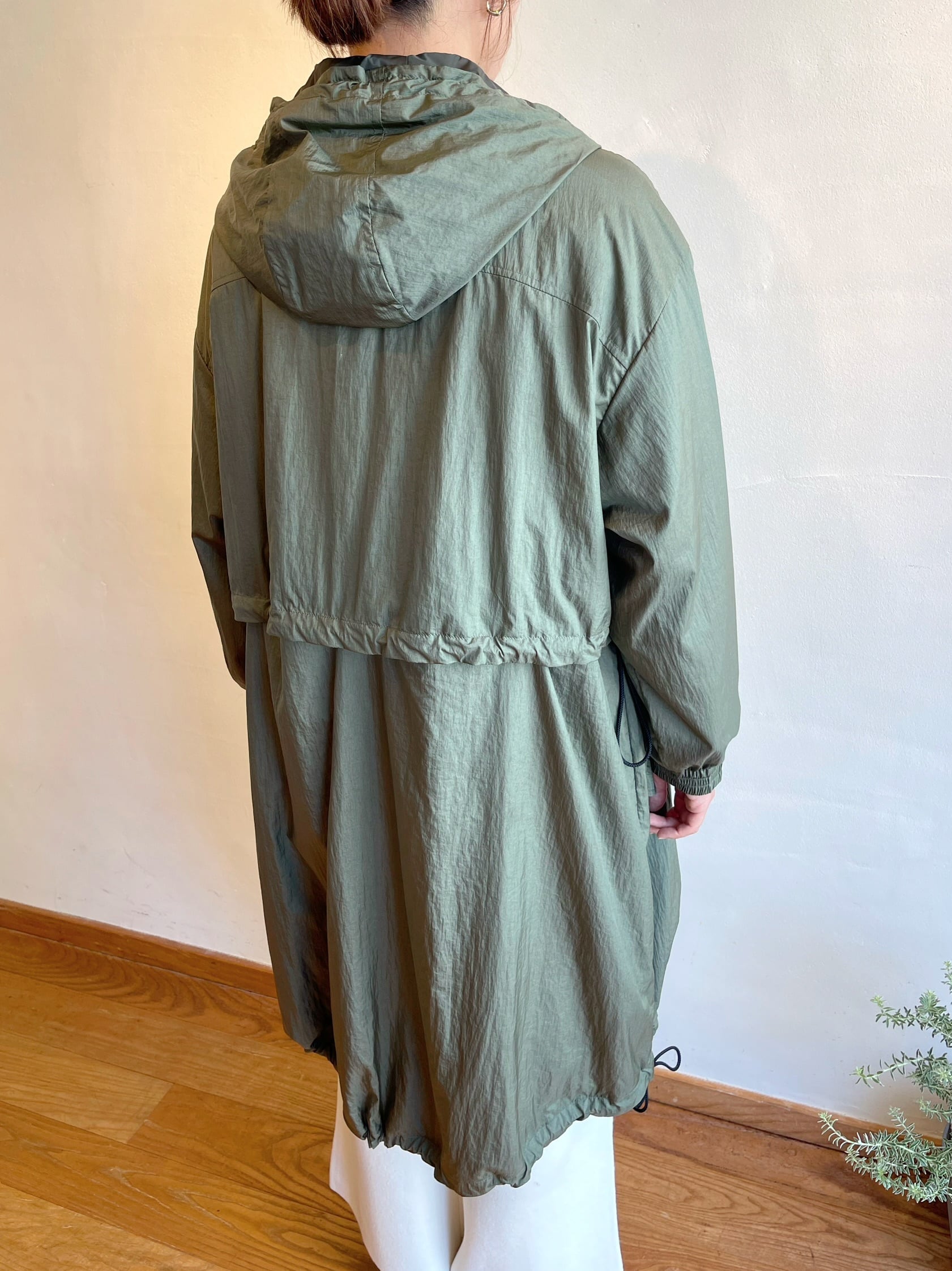 フード、ウエスト、裾にはスピンドルが通してあり、気候やスタイリングに合わせてシルエットを調整することができます。