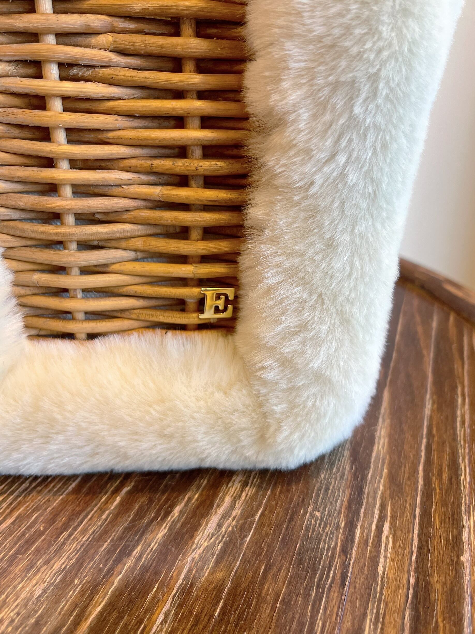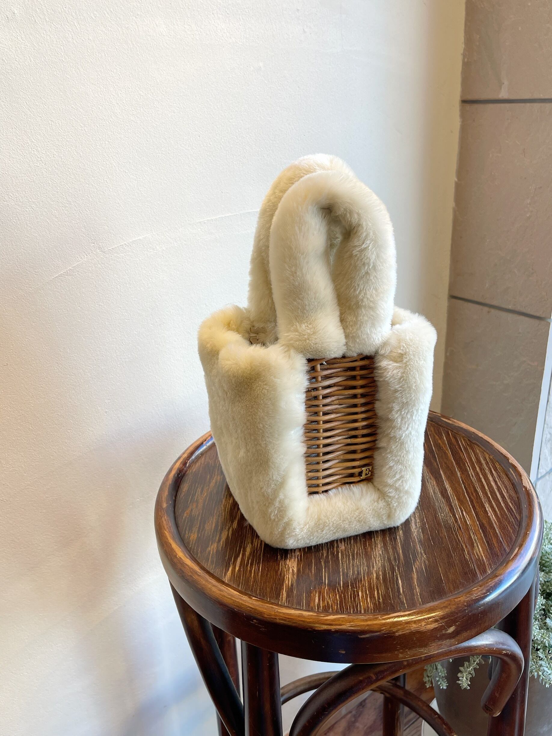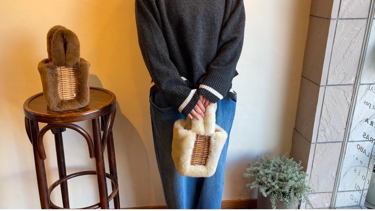 アクリル100%のエコファーと紅籐の組み合わせ。うさぎの耳のような持ち手を持つ手や手首が暖かいバッグです。